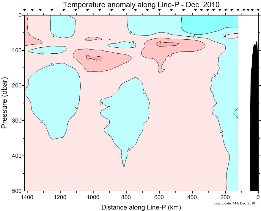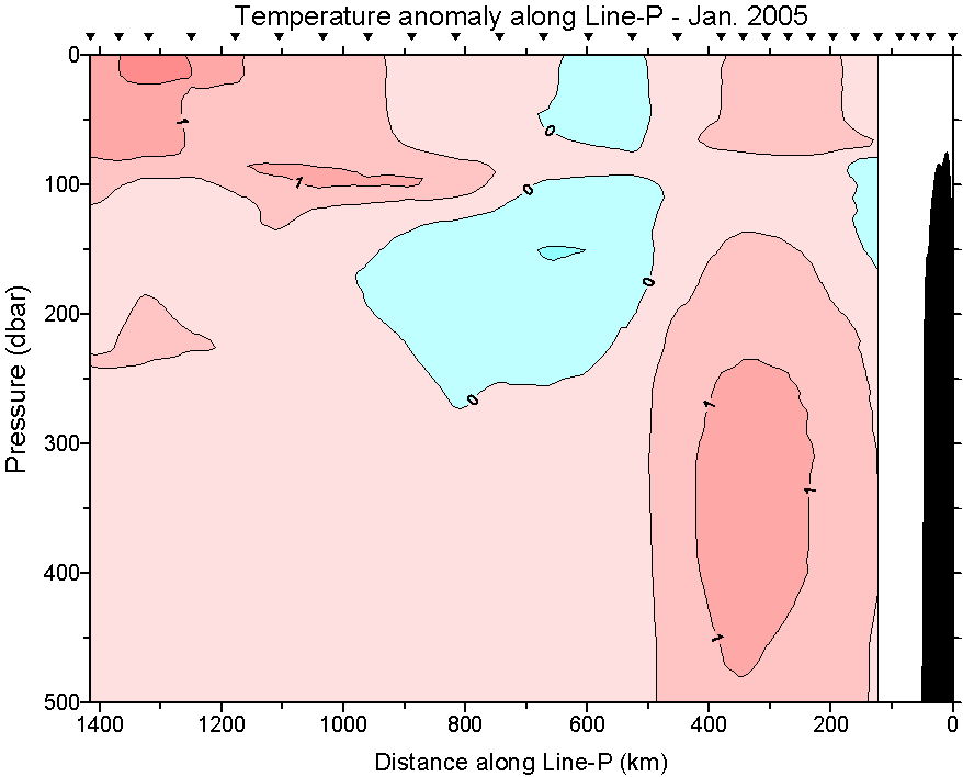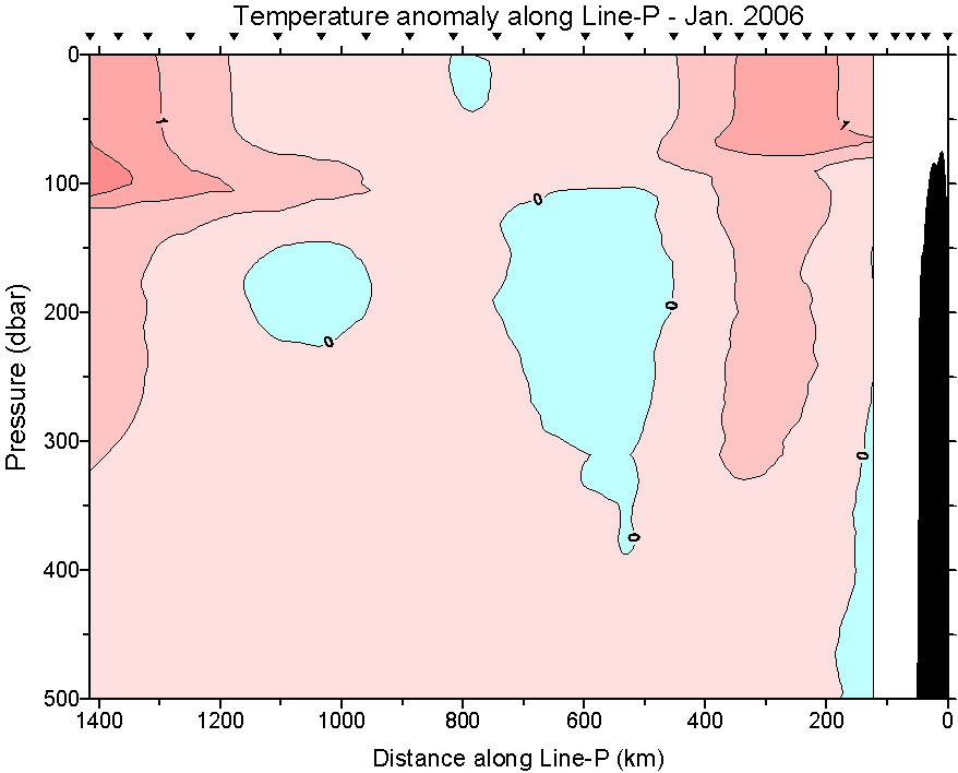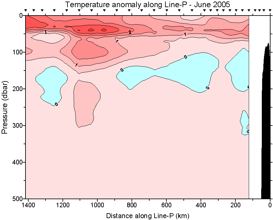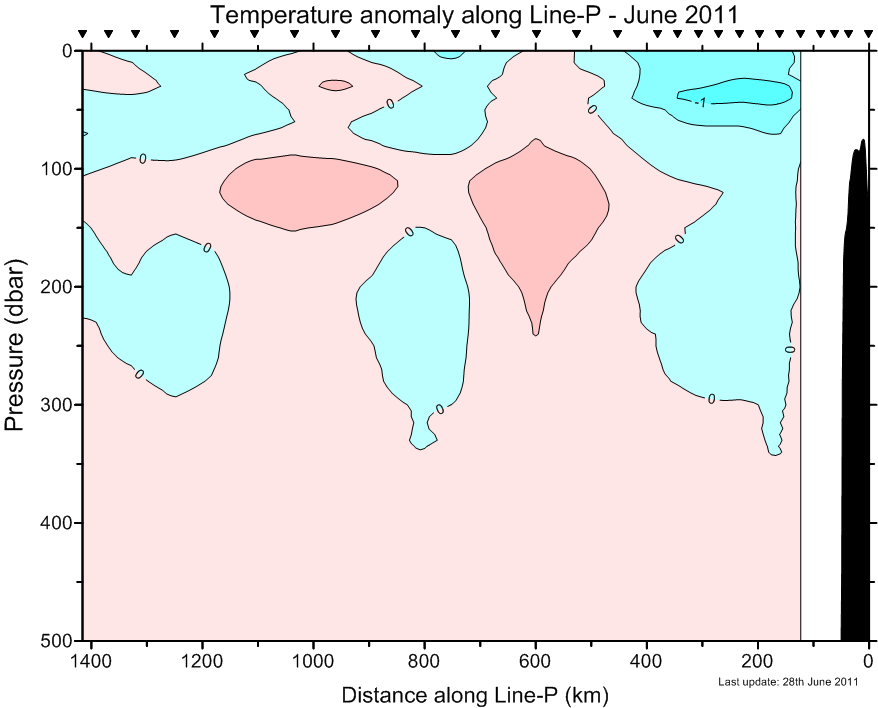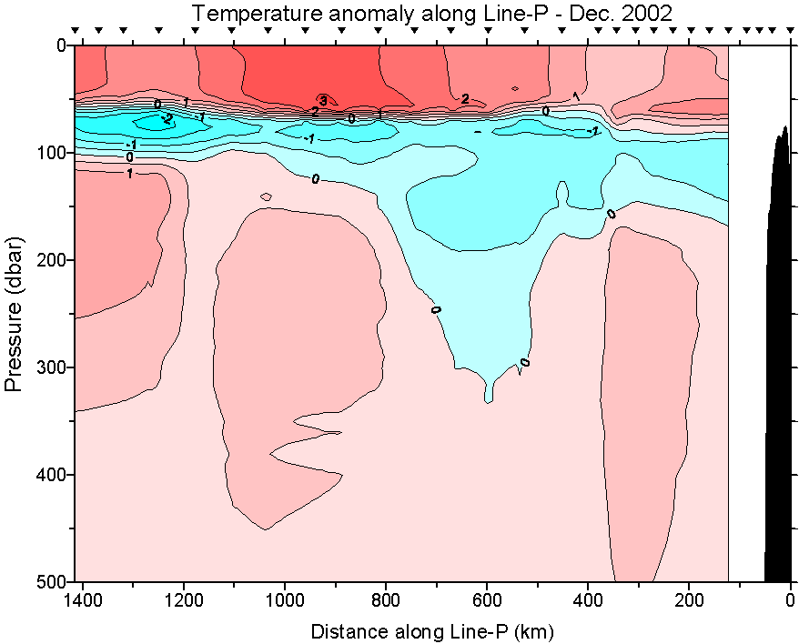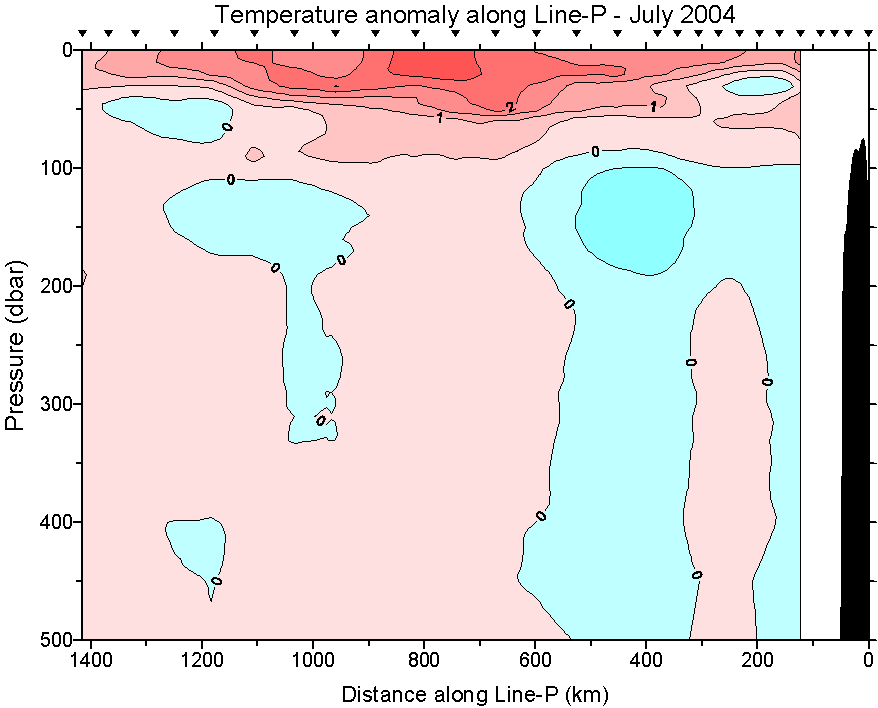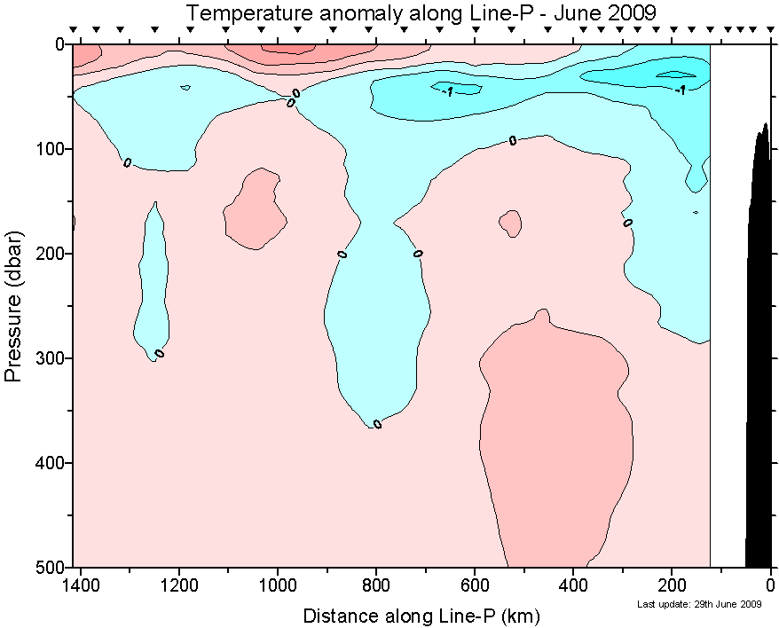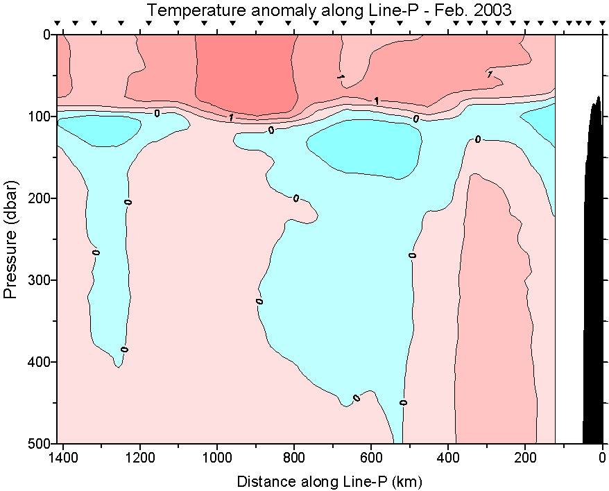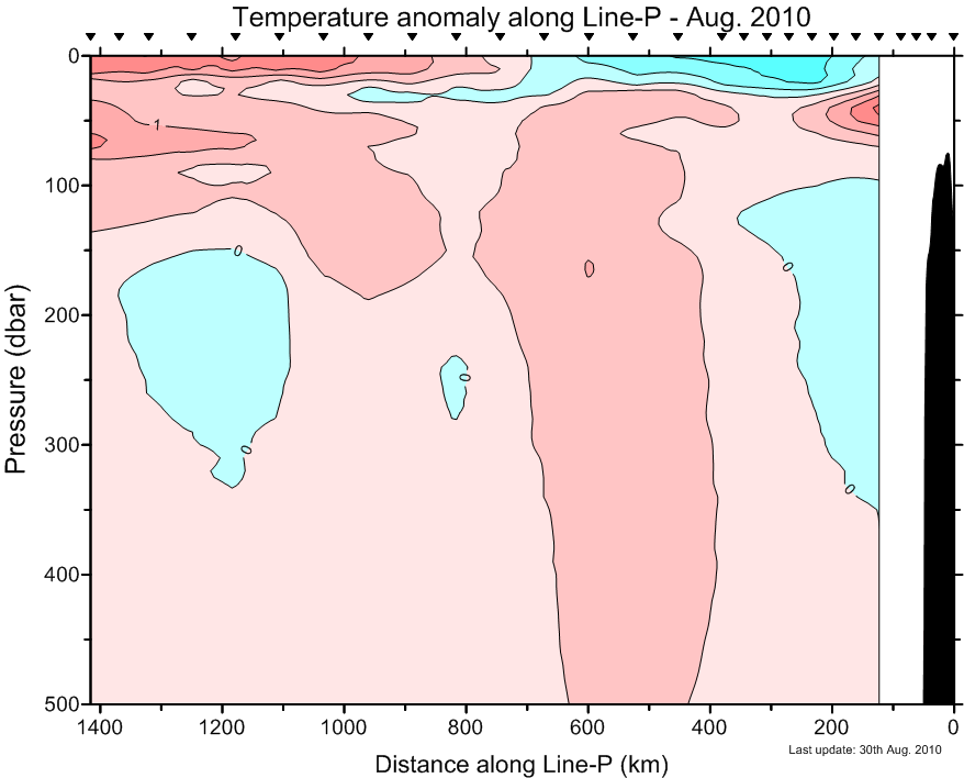 Pour le mois et l'année en cours, les sections sont calculées en utilisant les données disponibles à ce jour. Ces sections sont susceptibles d'être modifiées. Les versions définitives seront publiées lorsque toutes les données seront disponibles. Les anomalies sont calculées par rapport à la climatologie de la ligne P.