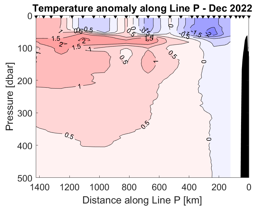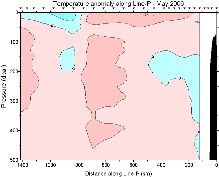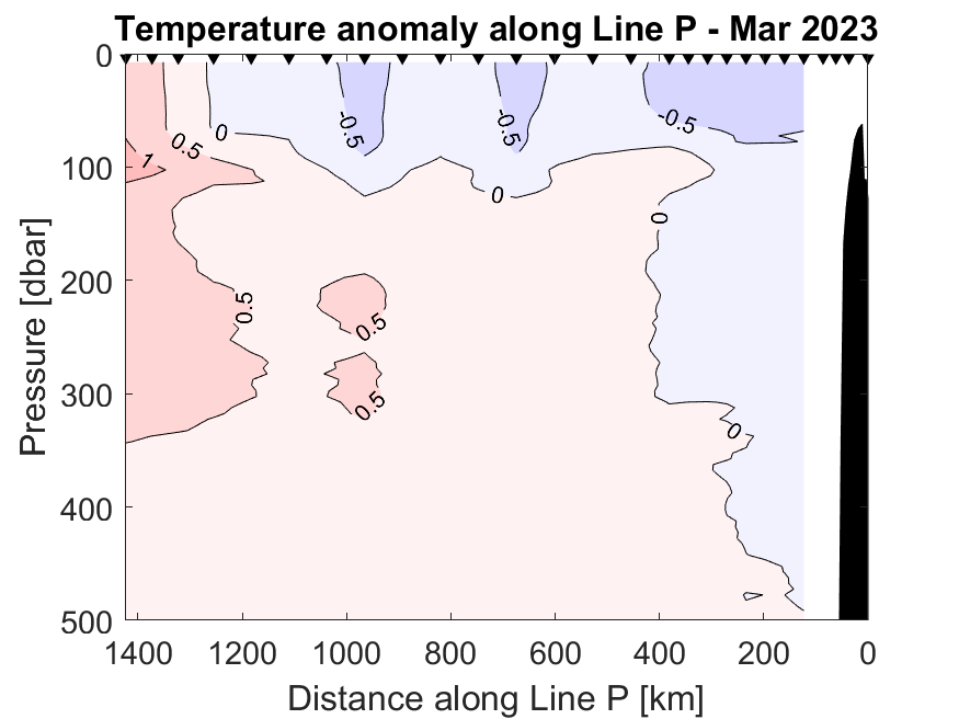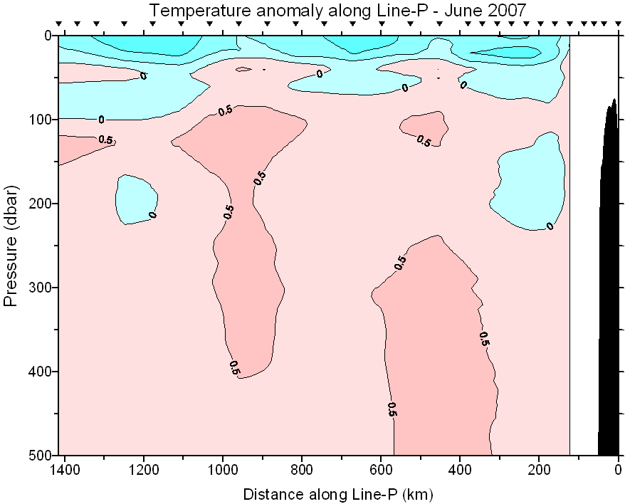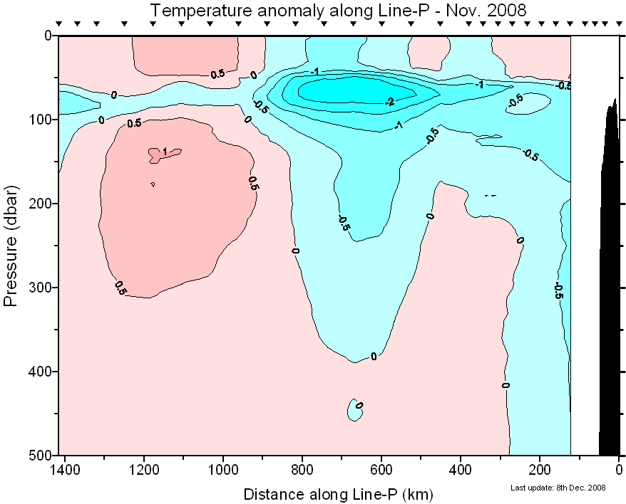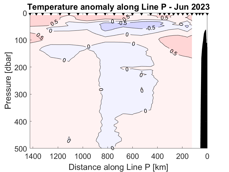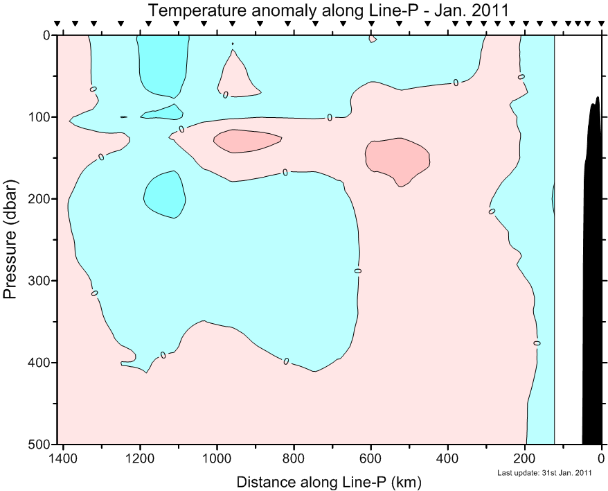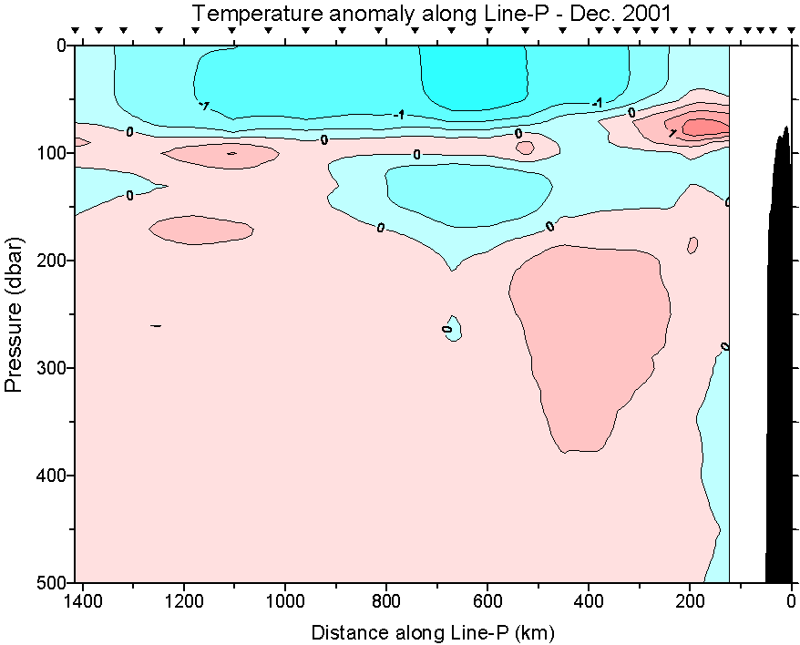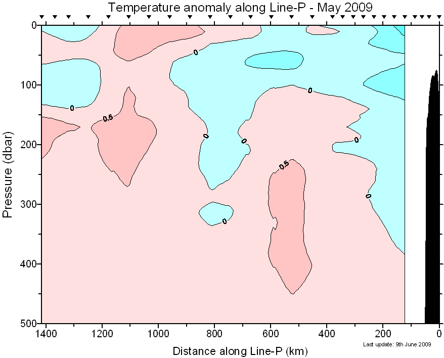 Pour le mois et l'année en cours, les sections sont calculées en utilisant les données disponibles à ce jour. Ces sections sont susceptibles d'être modifiées. Les versions définitives seront publiées lorsque toutes les données seront disponibles. Les anomalies sont calculées par rapport à la climatologie de la ligne P.