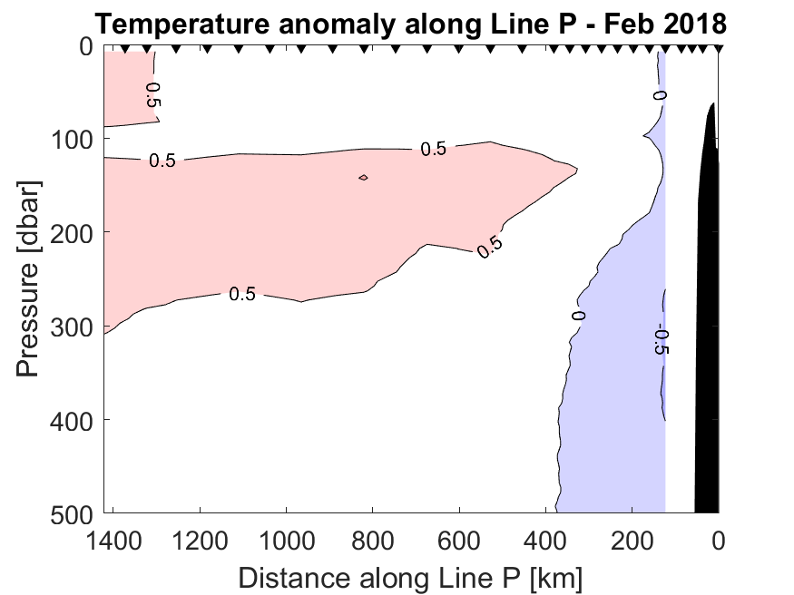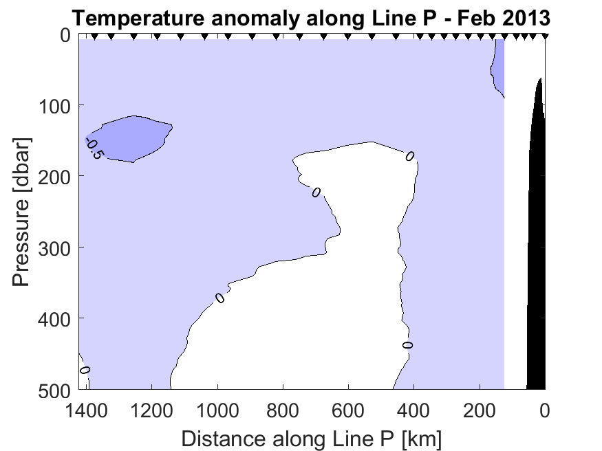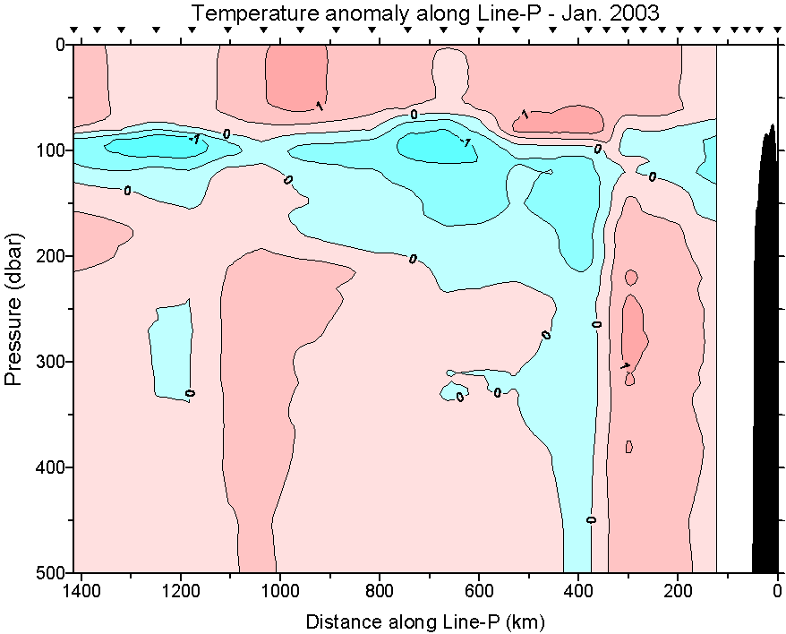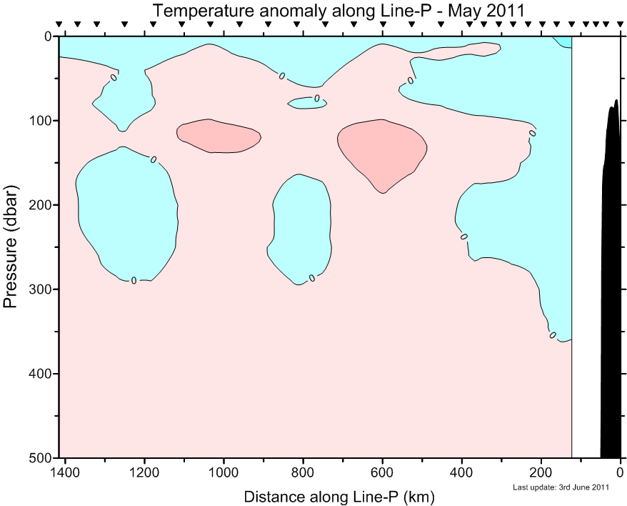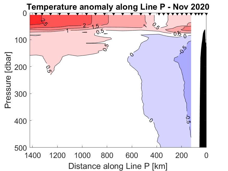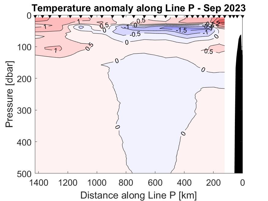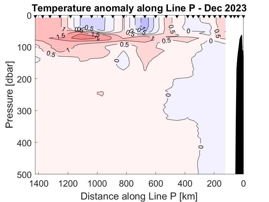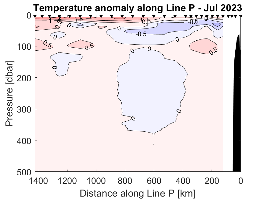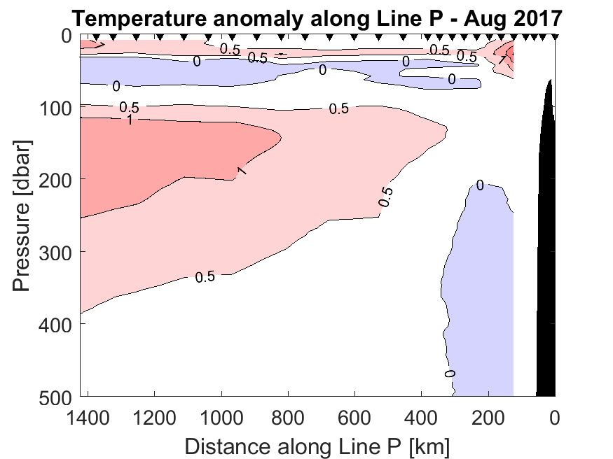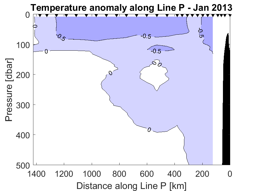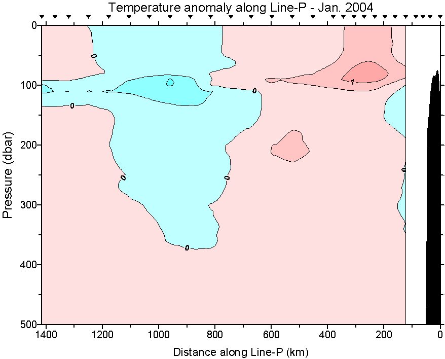 Pour le mois et l'année en cours, les sections sont calculées en utilisant les données disponibles à ce jour. Ces sections sont susceptibles d'être modifiées. Les versions définitives seront publiées lorsque toutes les données seront disponibles. Les anomalies sont calculées par rapport à la climatologie de la ligne P.