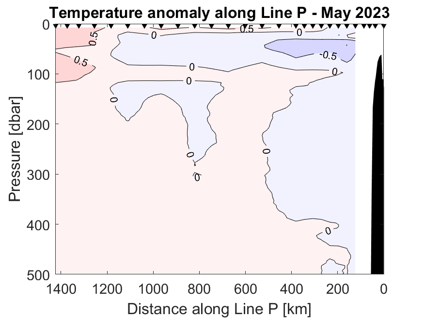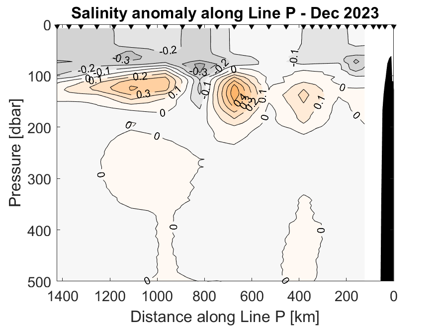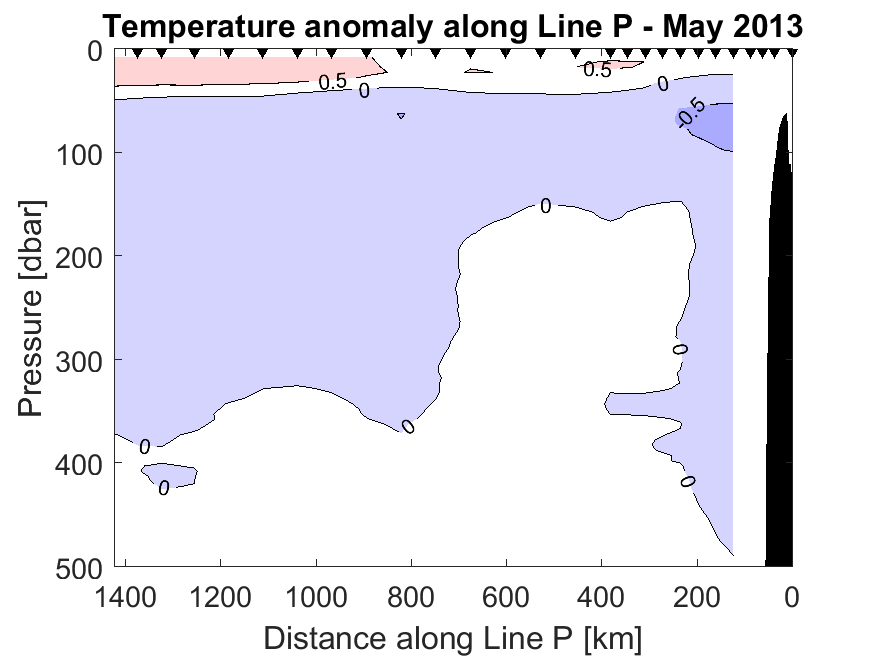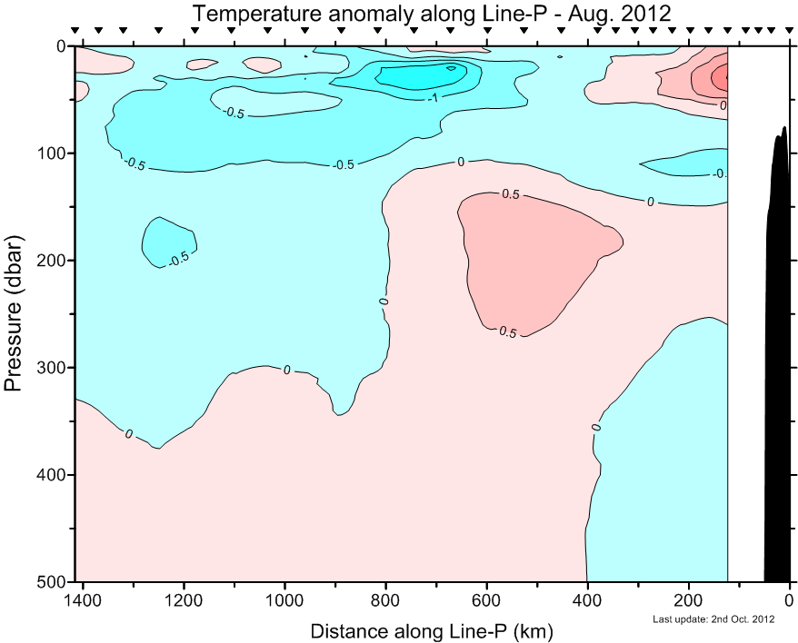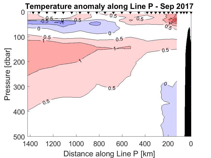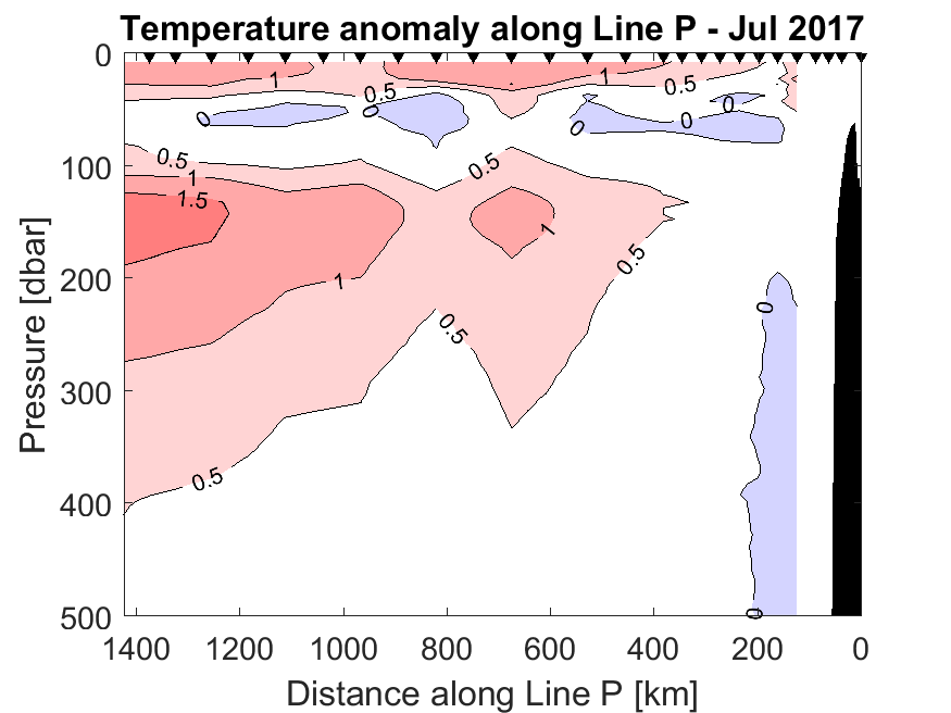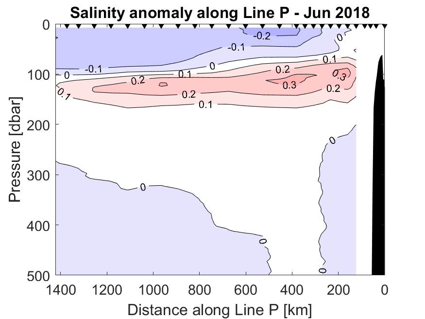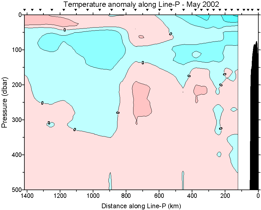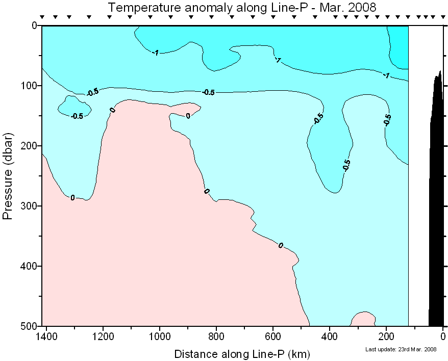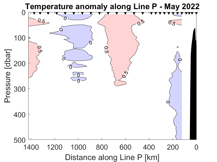 Pour le mois et l'année en cours, les sections sont calculées en utilisant les données disponibles à ce jour. Ces sections sont susceptibles d'être modifiées. Les versions définitives seront publiées lorsque toutes les données seront disponibles. Les anomalies sont calculées par rapport à la climatologie de la ligne P.