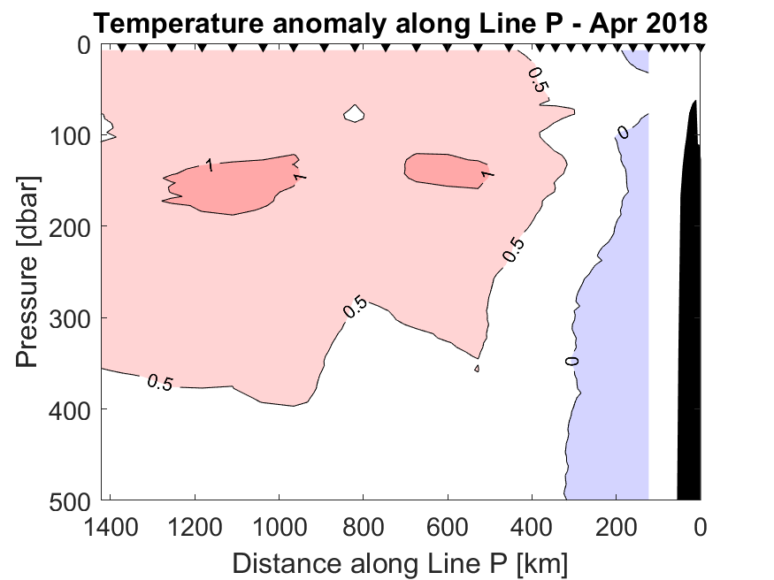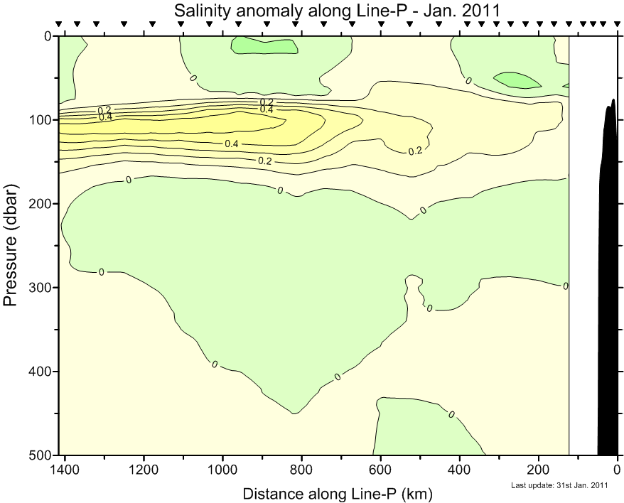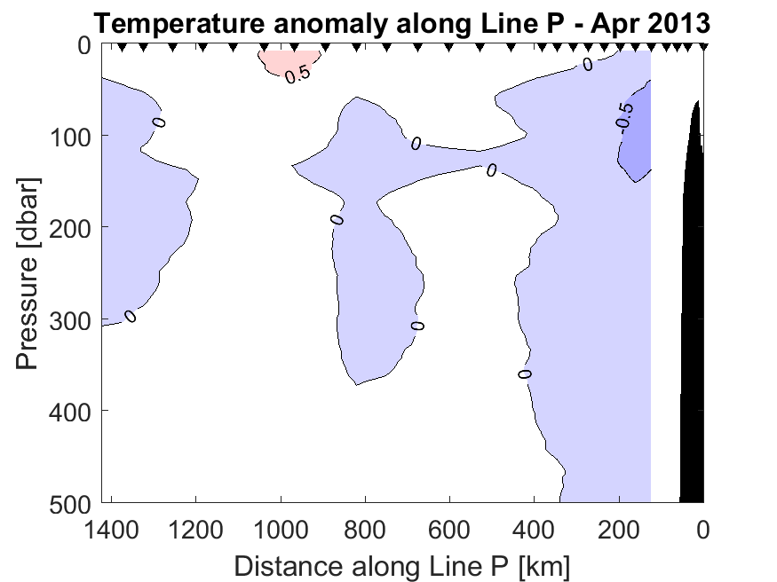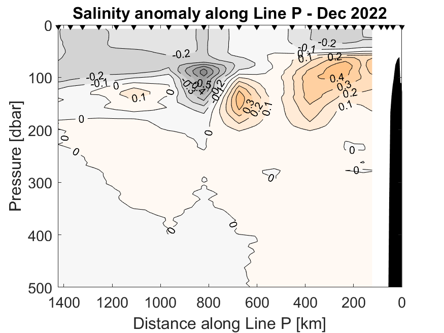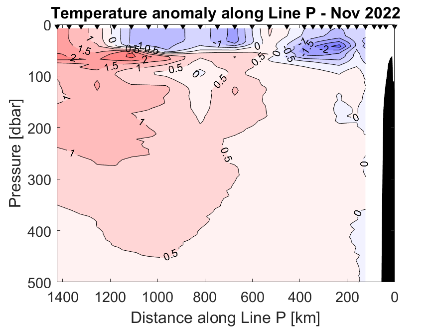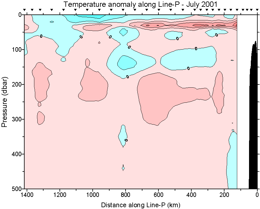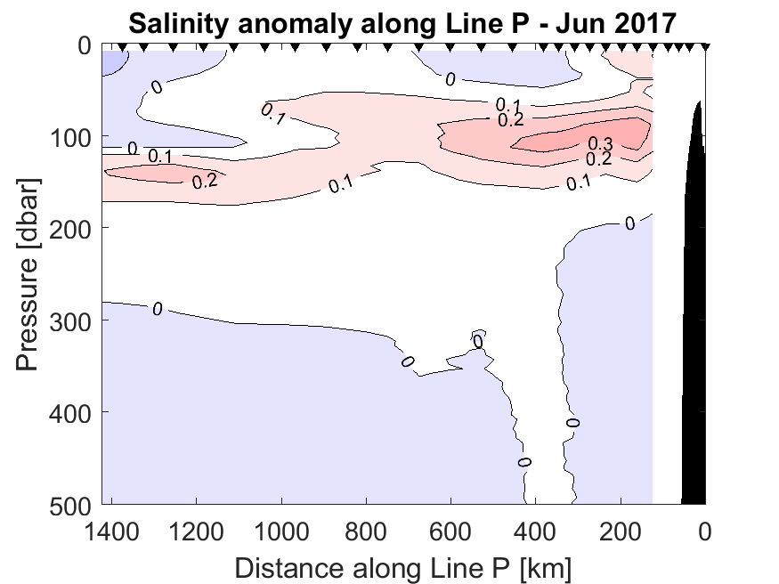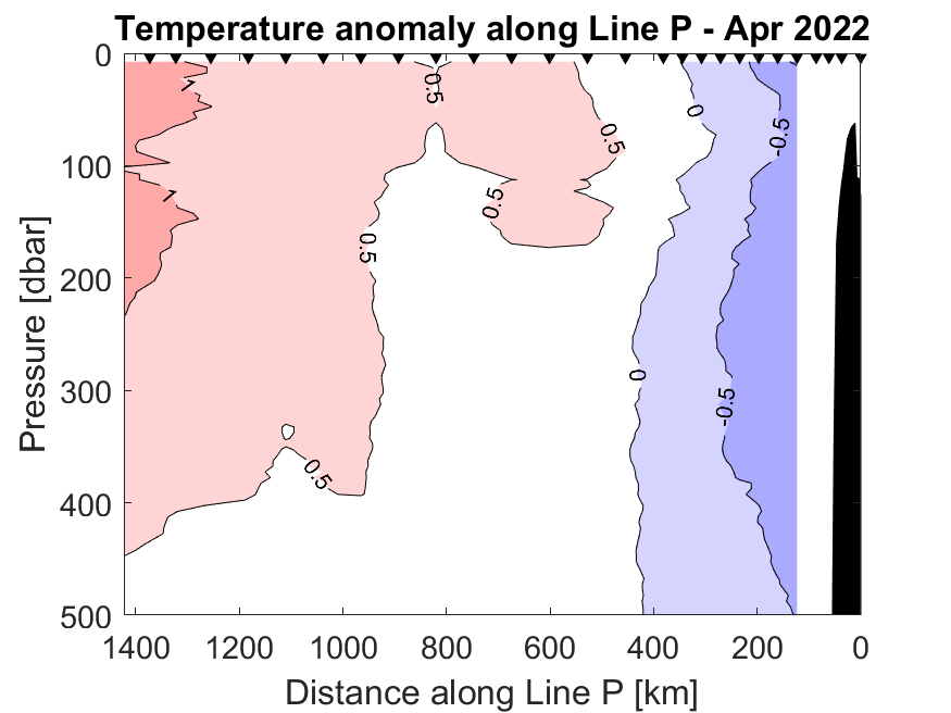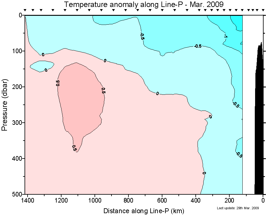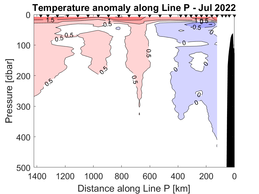 Pour le mois et l'année en cours, les sections sont calculées en utilisant les données disponibles à ce jour. Ces sections sont susceptibles d'être modifiées. Les versions définitives seront publiées lorsque toutes les données seront disponibles. Les anomalies sont calculées par rapport à la climatologie de la ligne P.