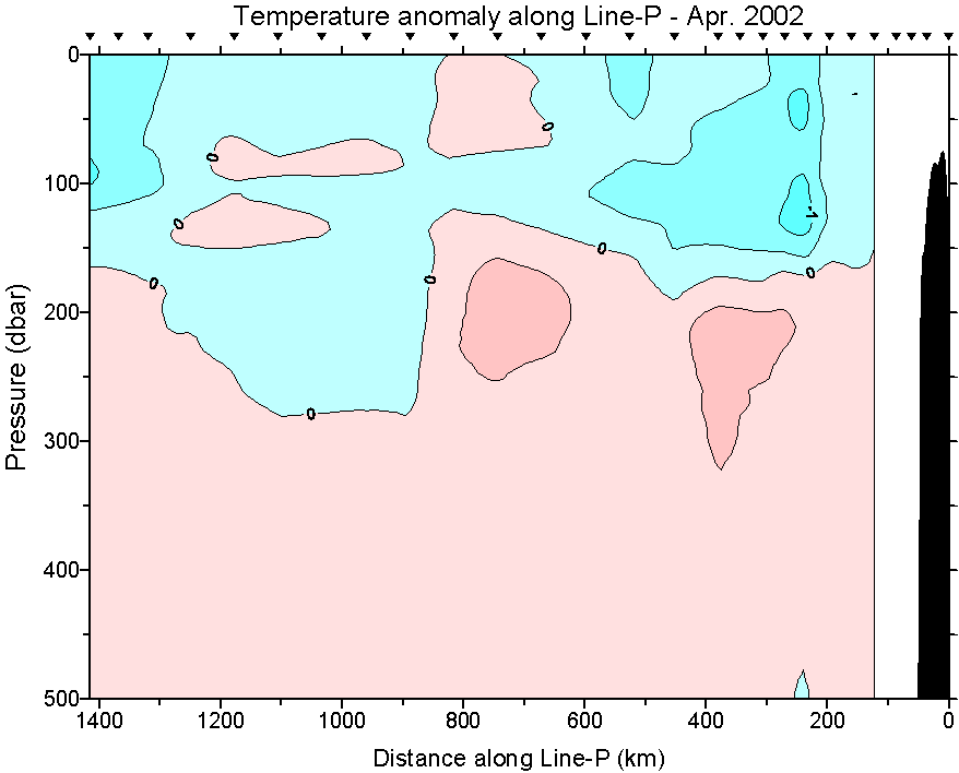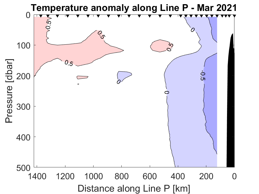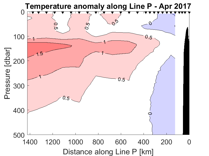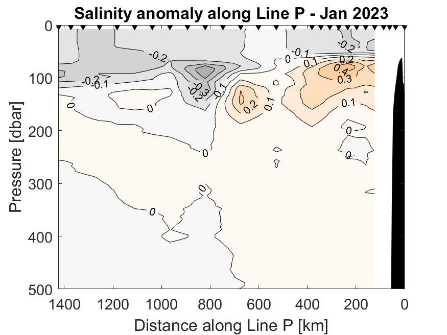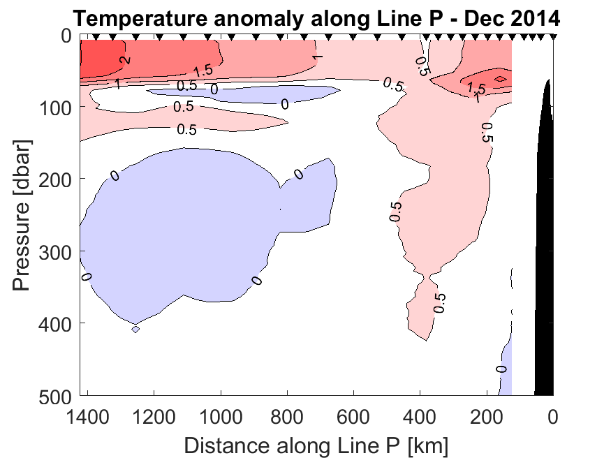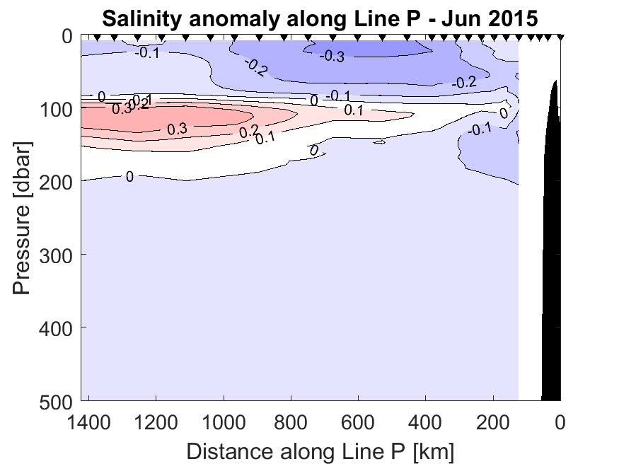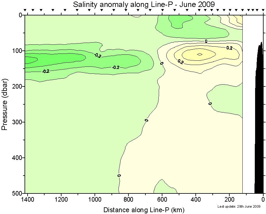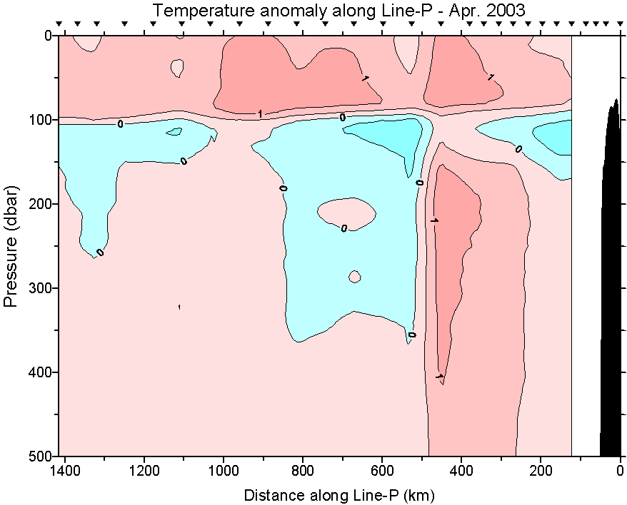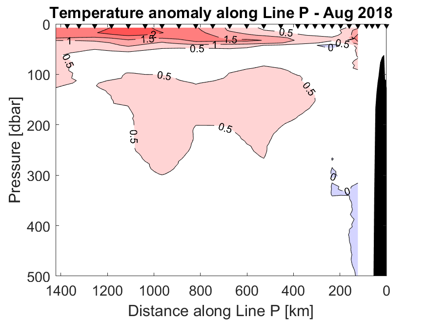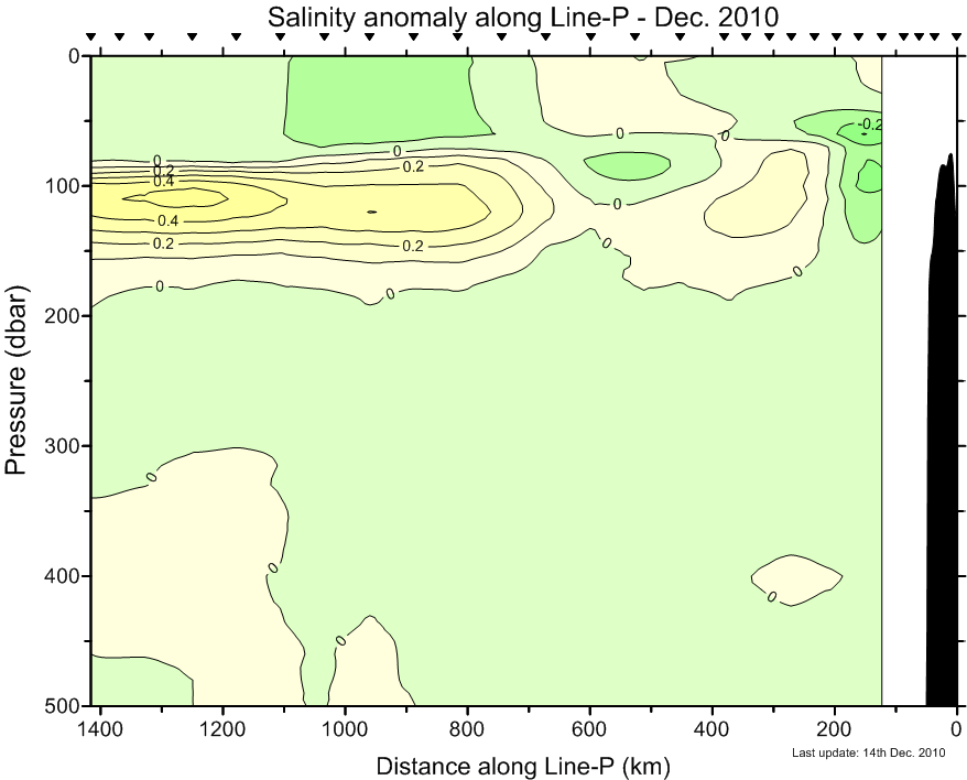 Pour le mois et l'année en cours, les sections sont calculées en utilisant les données disponibles à ce jour. Ces sections sont susceptibles d'être modifiées. Les versions définitives seront publiées lorsque toutes les données seront disponibles. Les anomalies sont calculées par rapport à la climatologie de la ligne P.