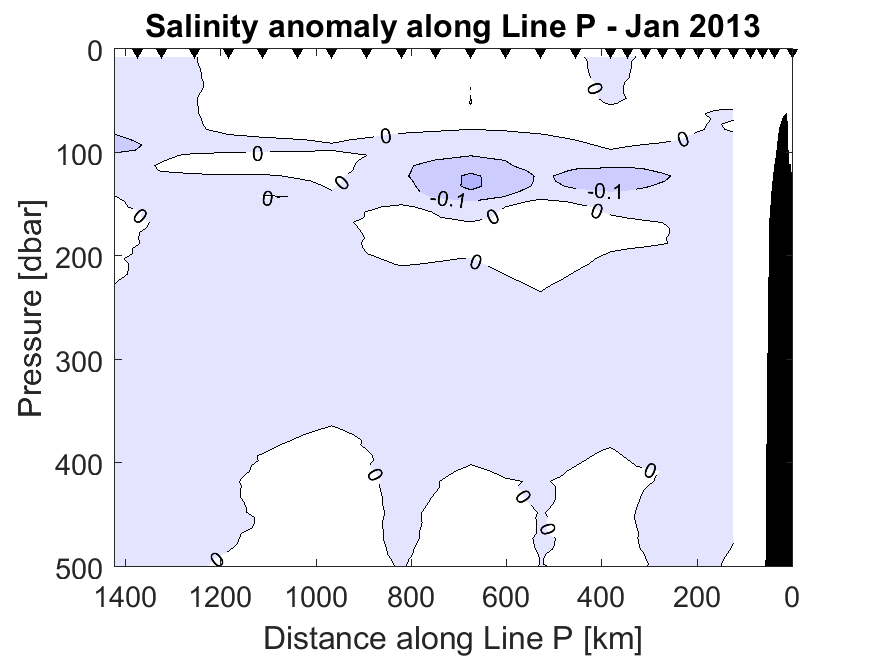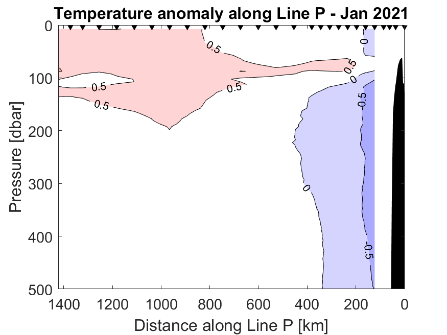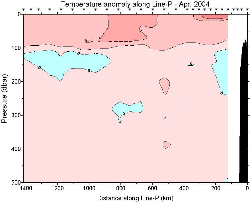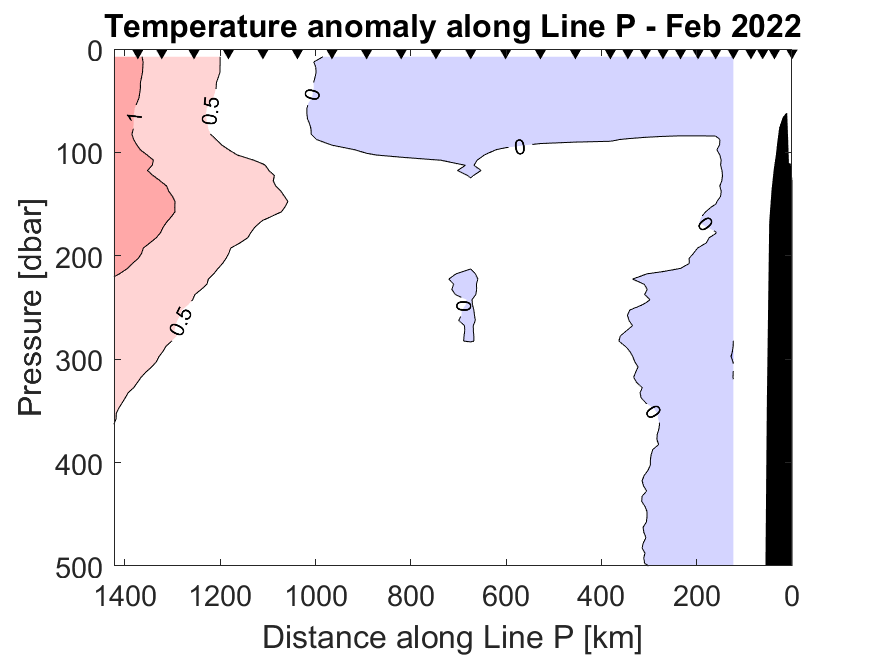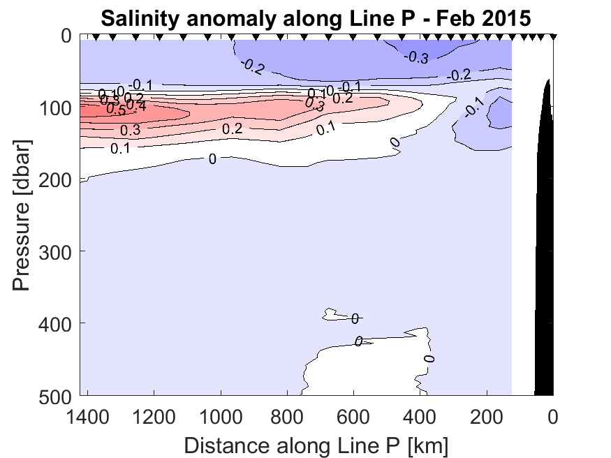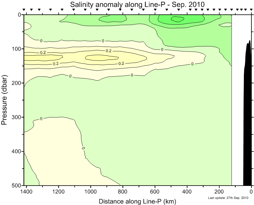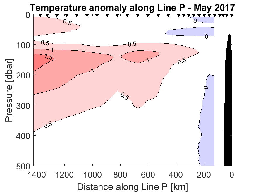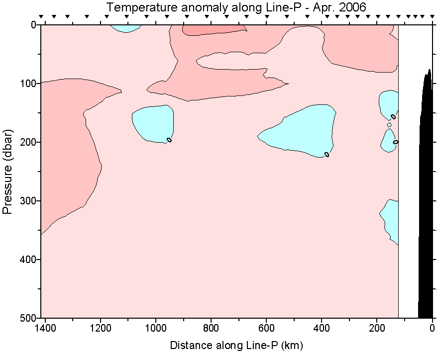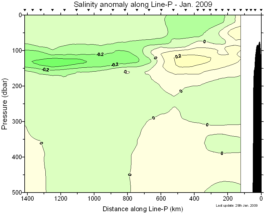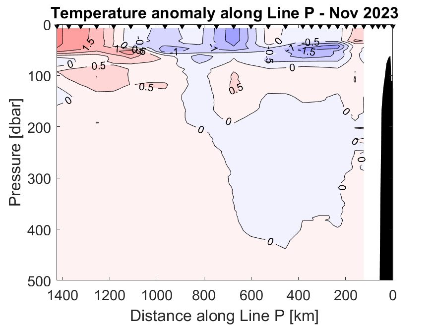 Pour le mois et l'année en cours, les sections sont calculées en utilisant les données disponibles à ce jour. Ces sections sont susceptibles d'être modifiées. Les versions définitives seront publiées lorsque toutes les données seront disponibles. Les anomalies sont calculées par rapport à la climatologie de la ligne P.