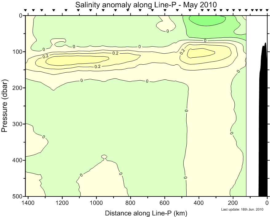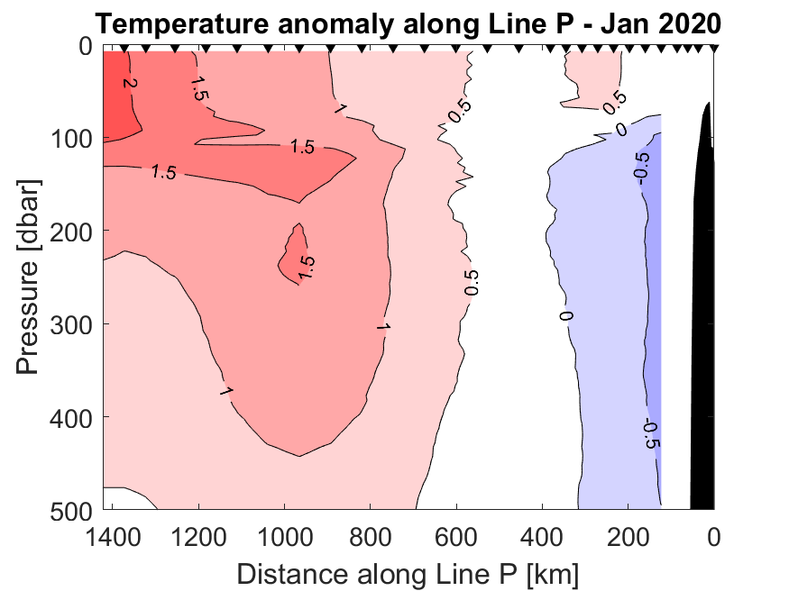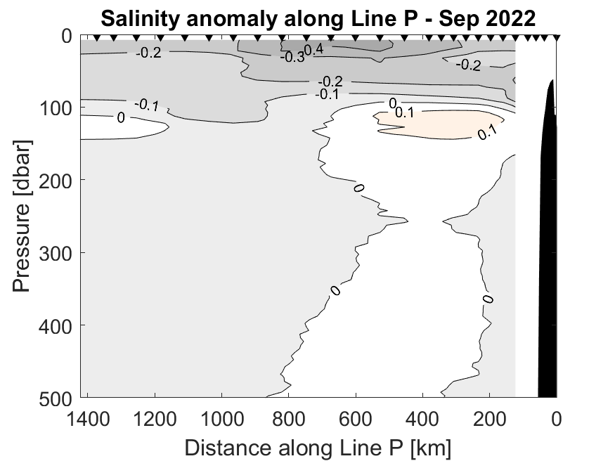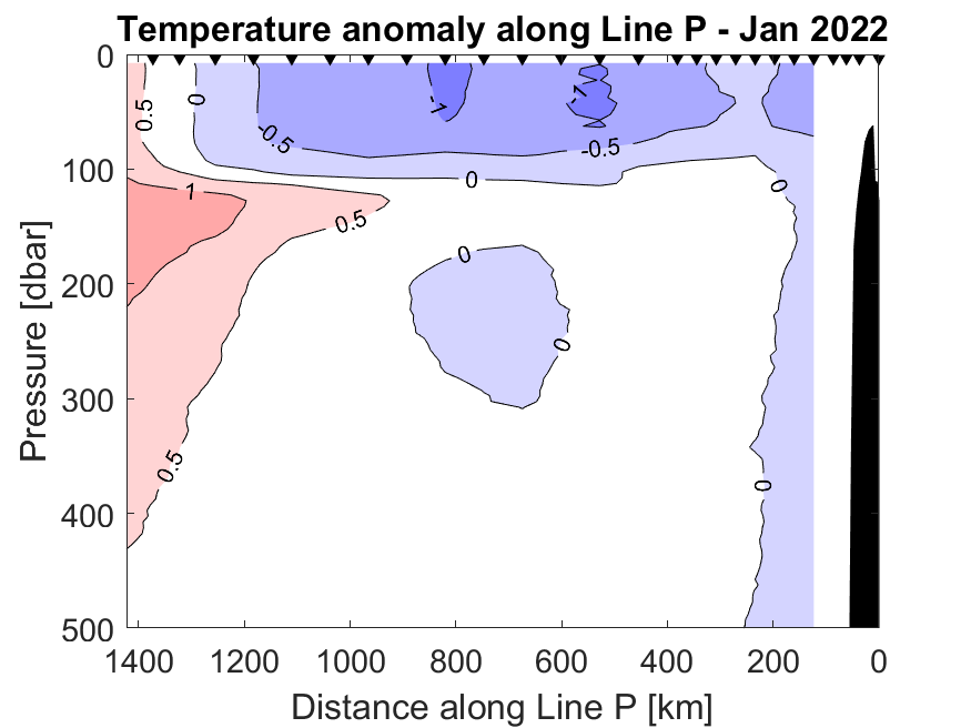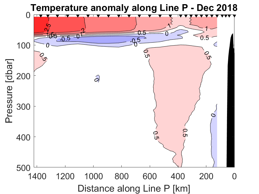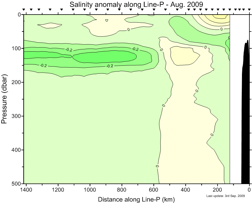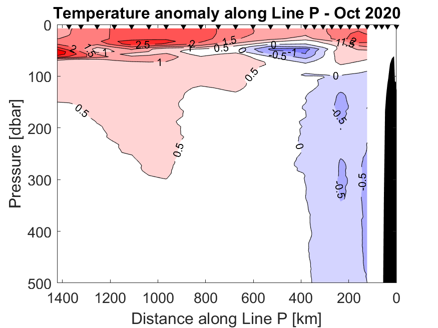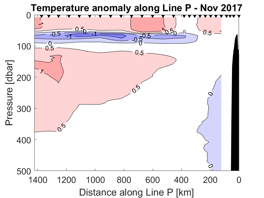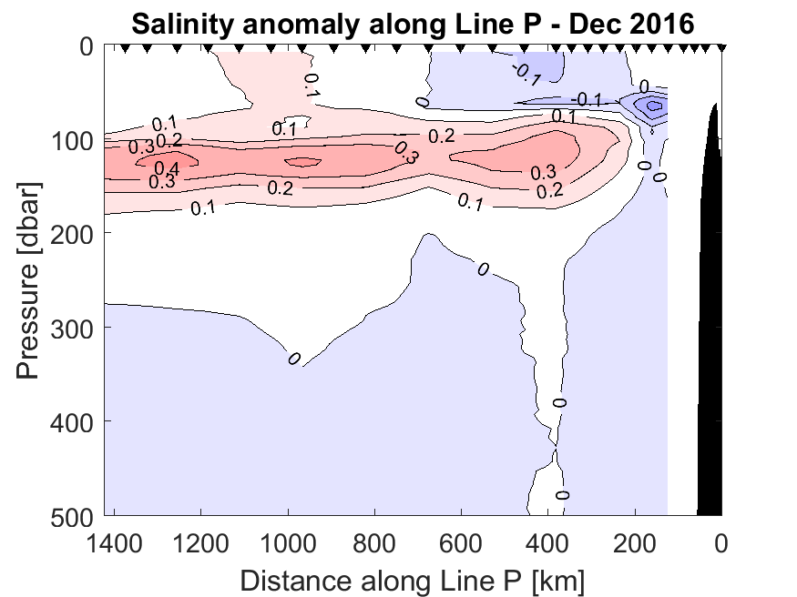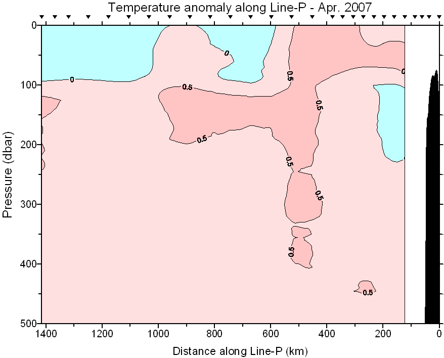 Pour le mois et l'année en cours, les sections sont calculées en utilisant les données disponibles à ce jour. Ces sections sont susceptibles d'être modifiées. Les versions définitives seront publiées lorsque toutes les données seront disponibles. Les anomalies sont calculées par rapport à la climatologie de la ligne P.