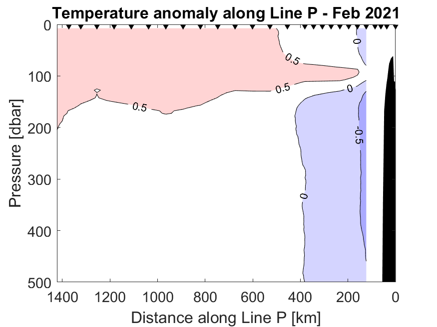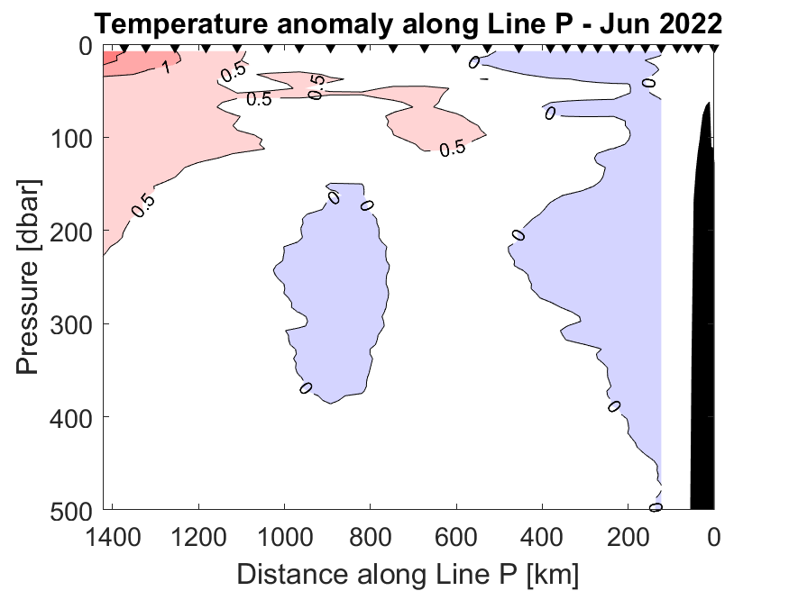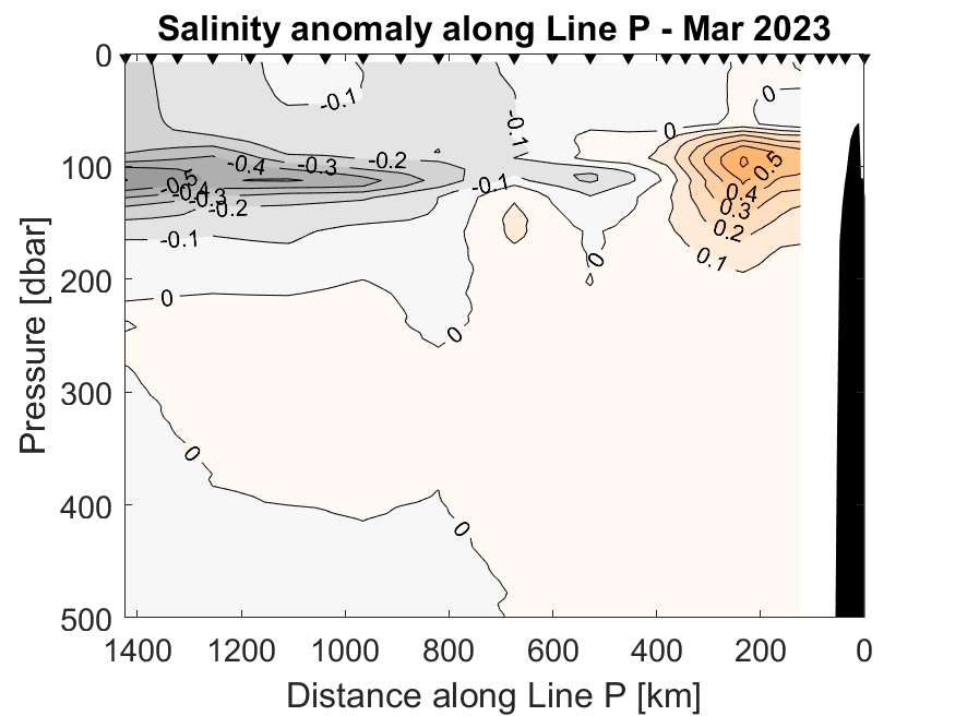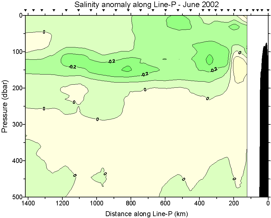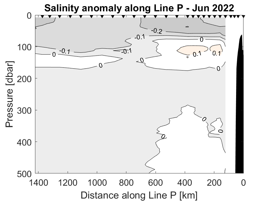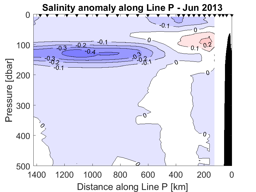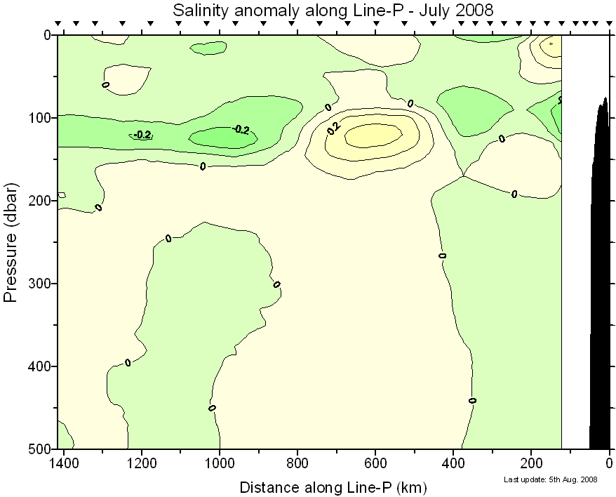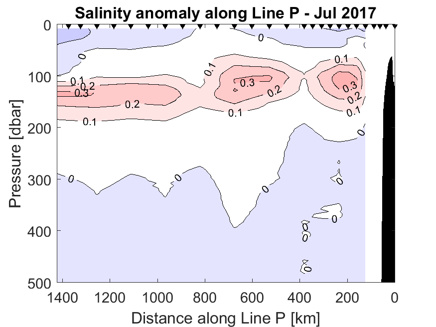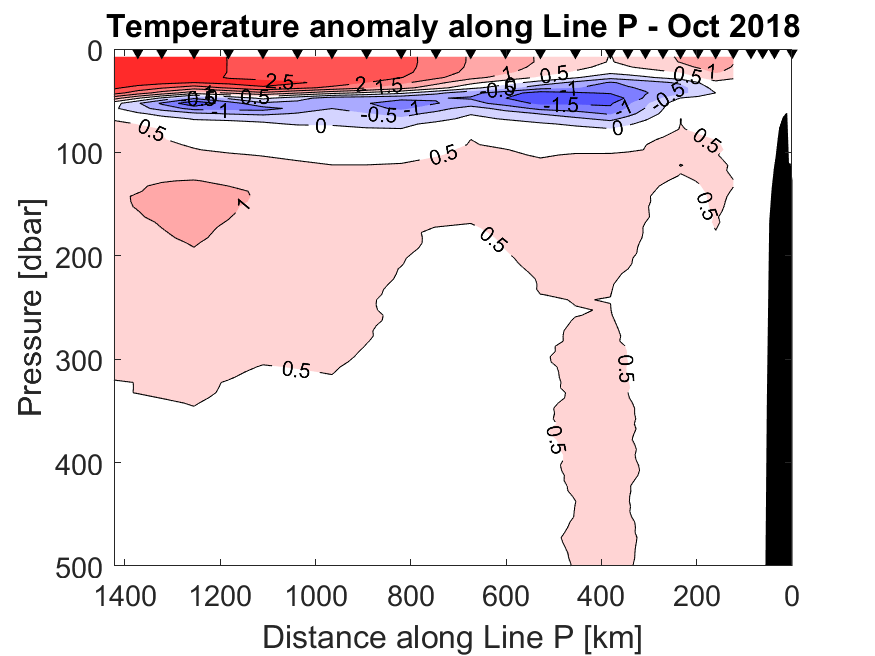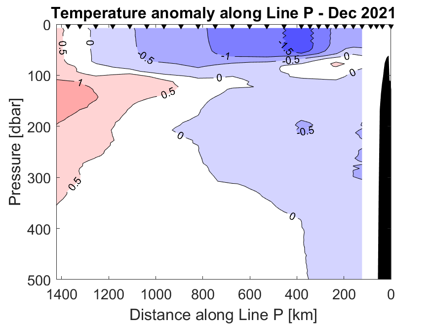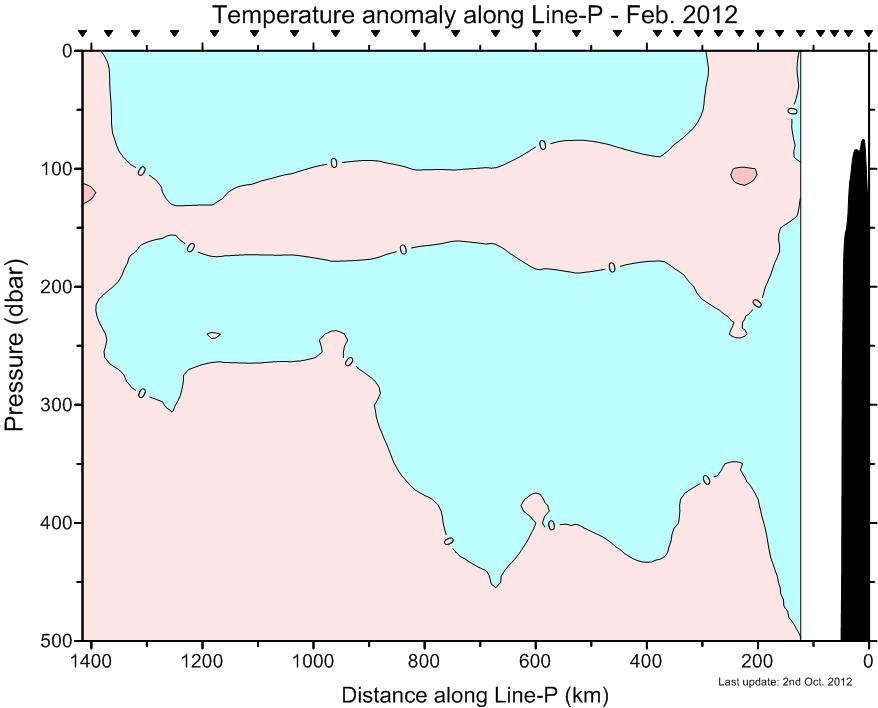 Pour le mois et l'année en cours, les sections sont calculées en utilisant les données disponibles à ce jour. Ces sections sont susceptibles d'être modifiées. Les versions définitives seront publiées lorsque toutes les données seront disponibles. Les anomalies sont calculées par rapport à la climatologie de la ligne P.