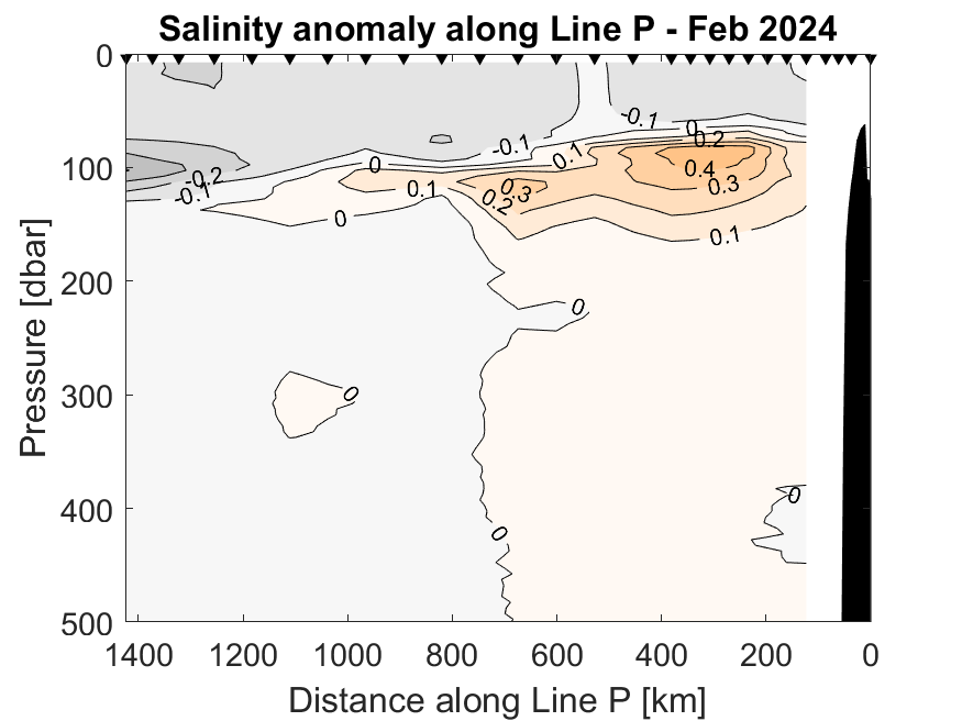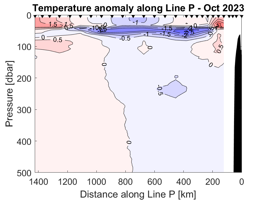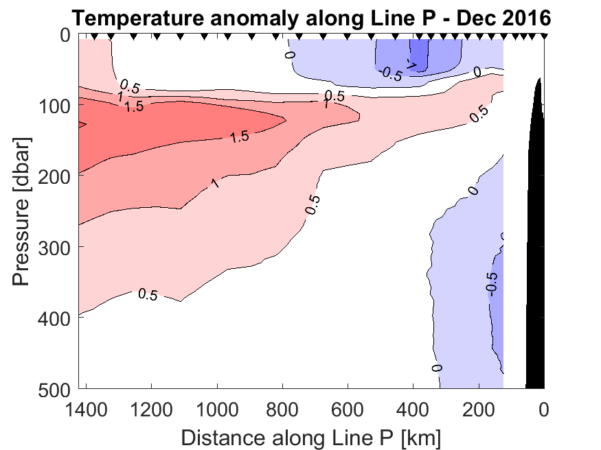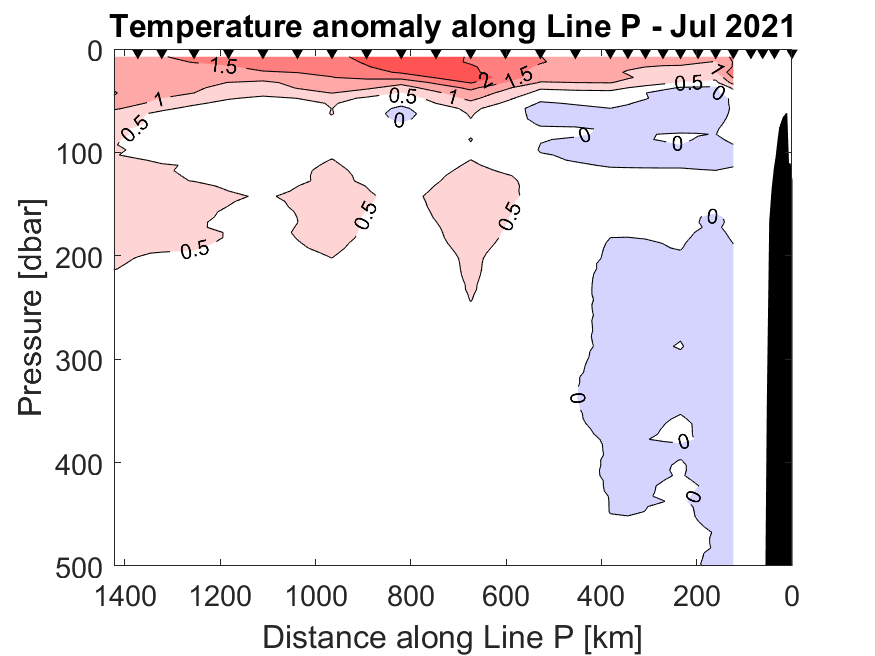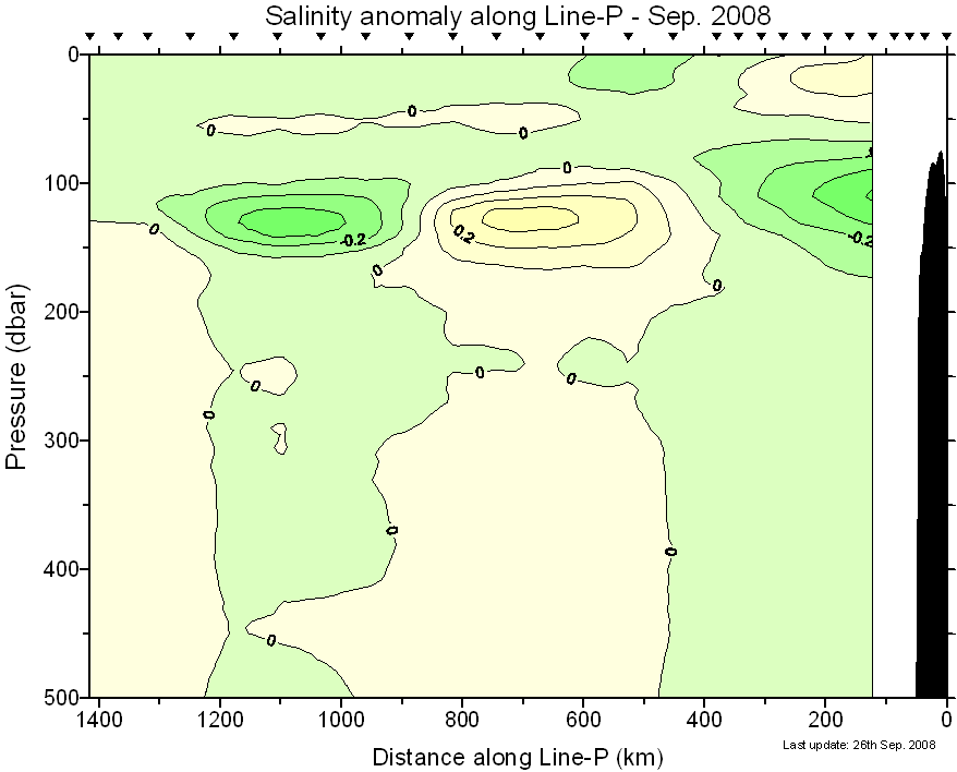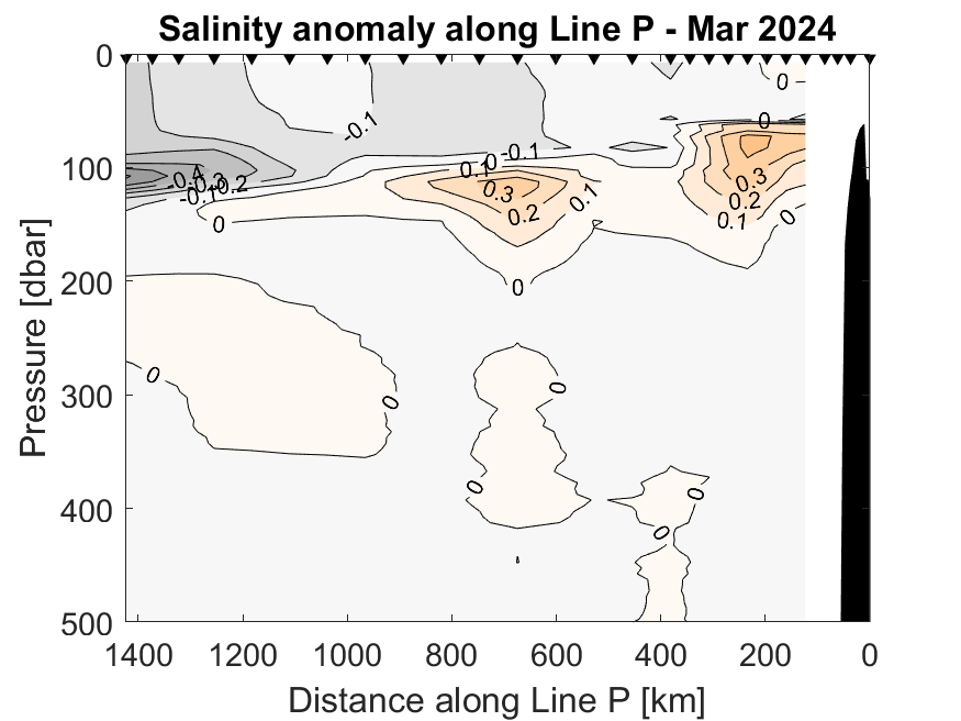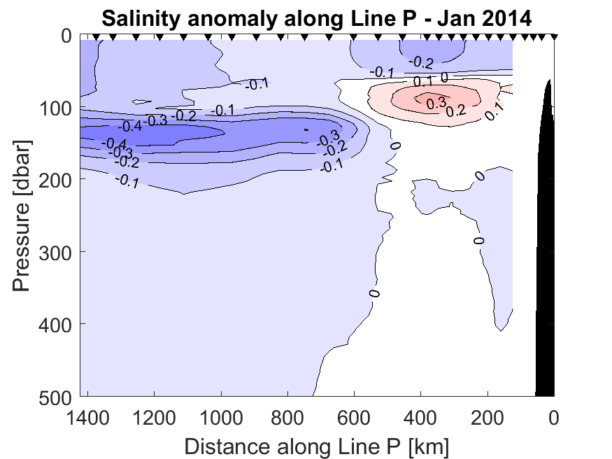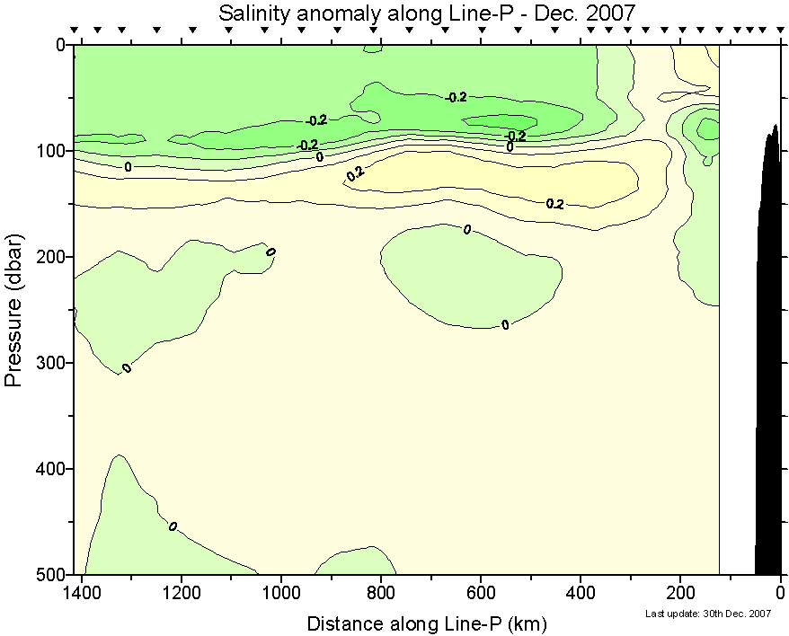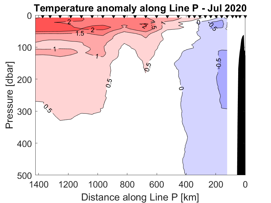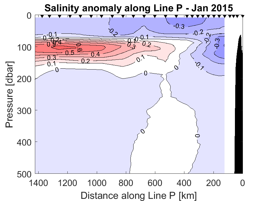 Pour le mois et l'année en cours, les sections sont calculées en utilisant les données disponibles à ce jour. Ces sections sont susceptibles d'être modifiées. Les versions définitives seront publiées lorsque toutes les données seront disponibles. Les anomalies sont calculées par rapport à la climatologie de la ligne P.