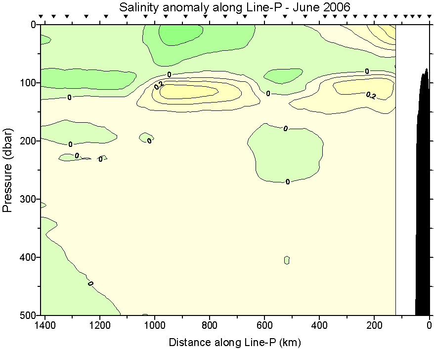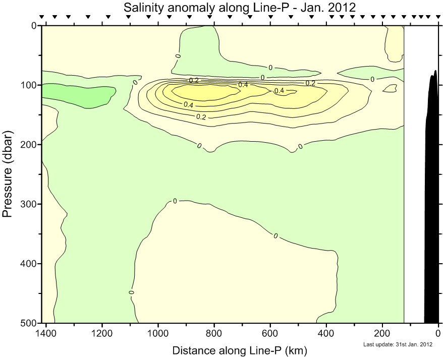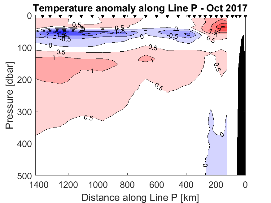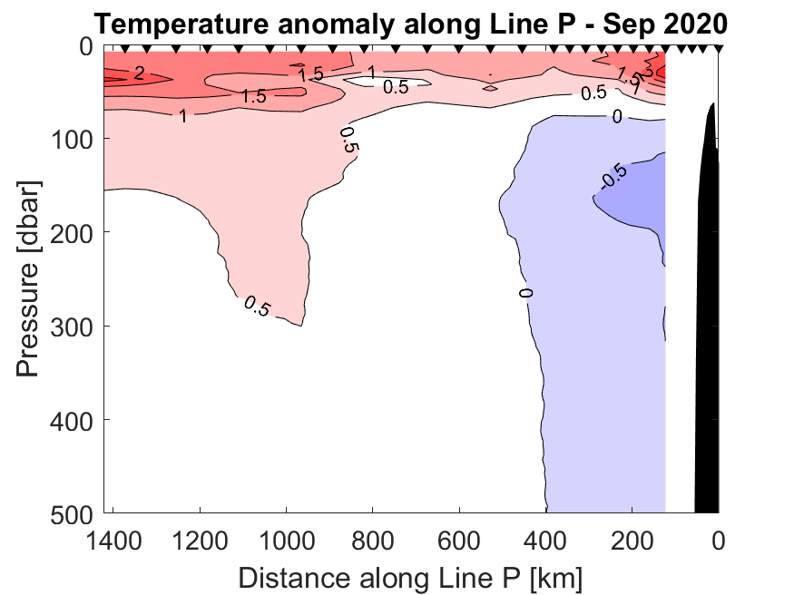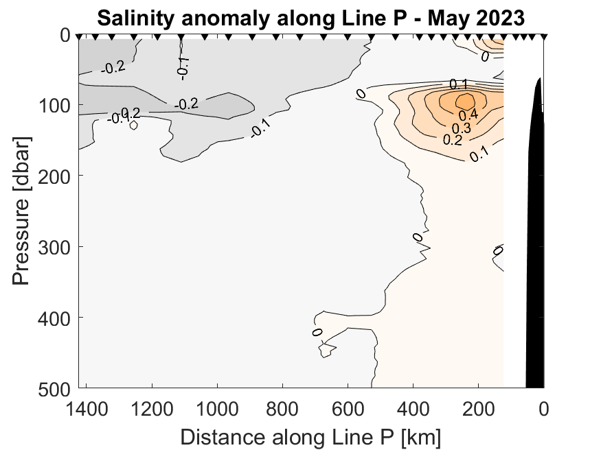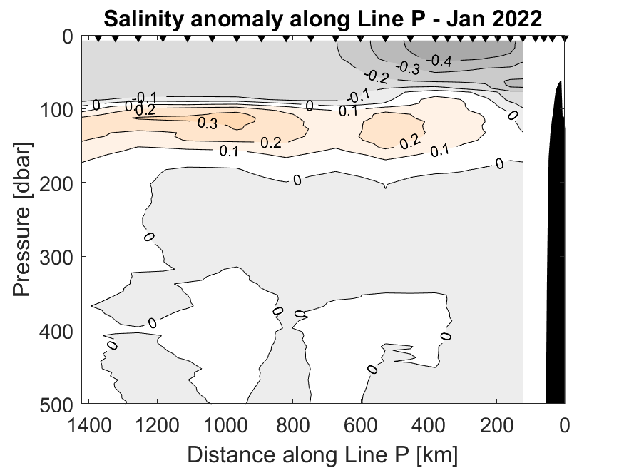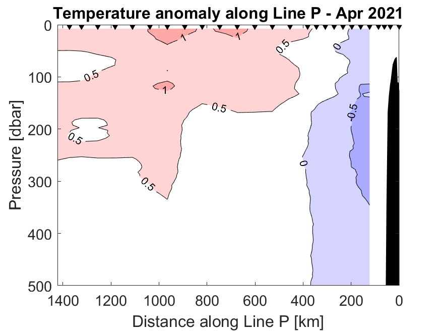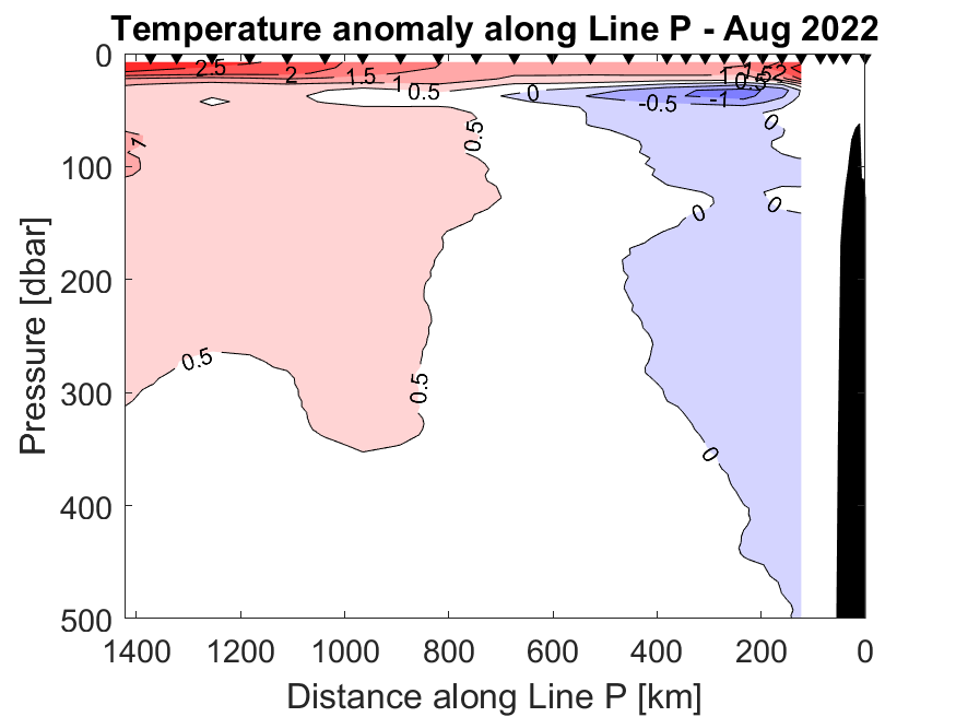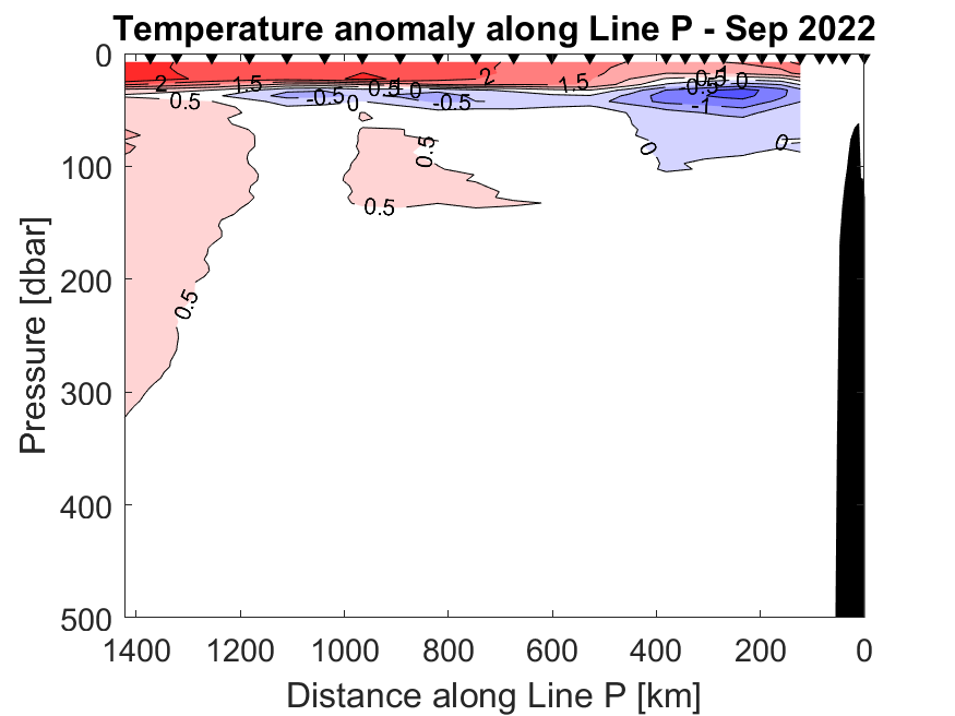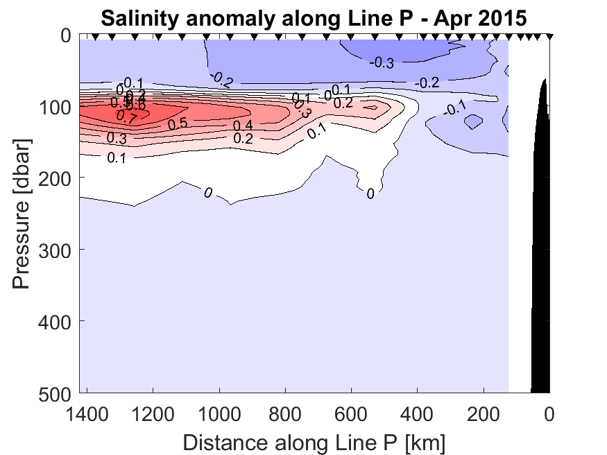 Pour le mois et l'année en cours, les sections sont calculées en utilisant les données disponibles à ce jour. Ces sections sont susceptibles d'être modifiées. Les versions définitives seront publiées lorsque toutes les données seront disponibles. Les anomalies sont calculées par rapport à la climatologie de la ligne P.