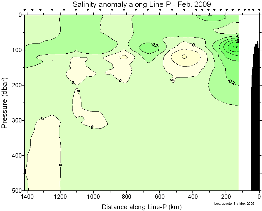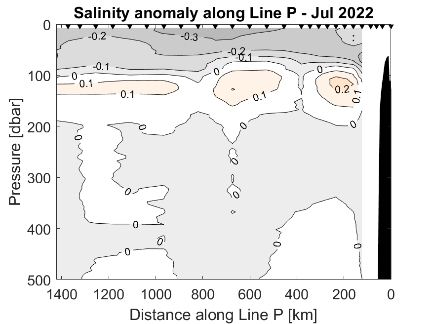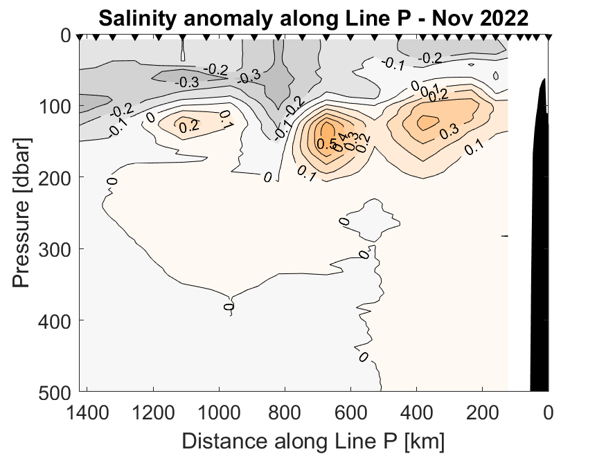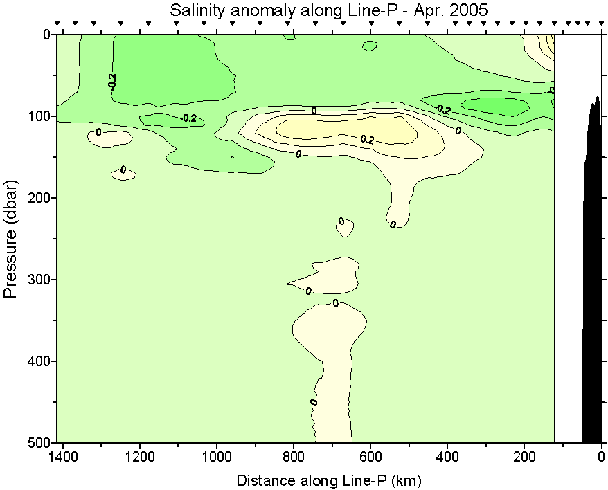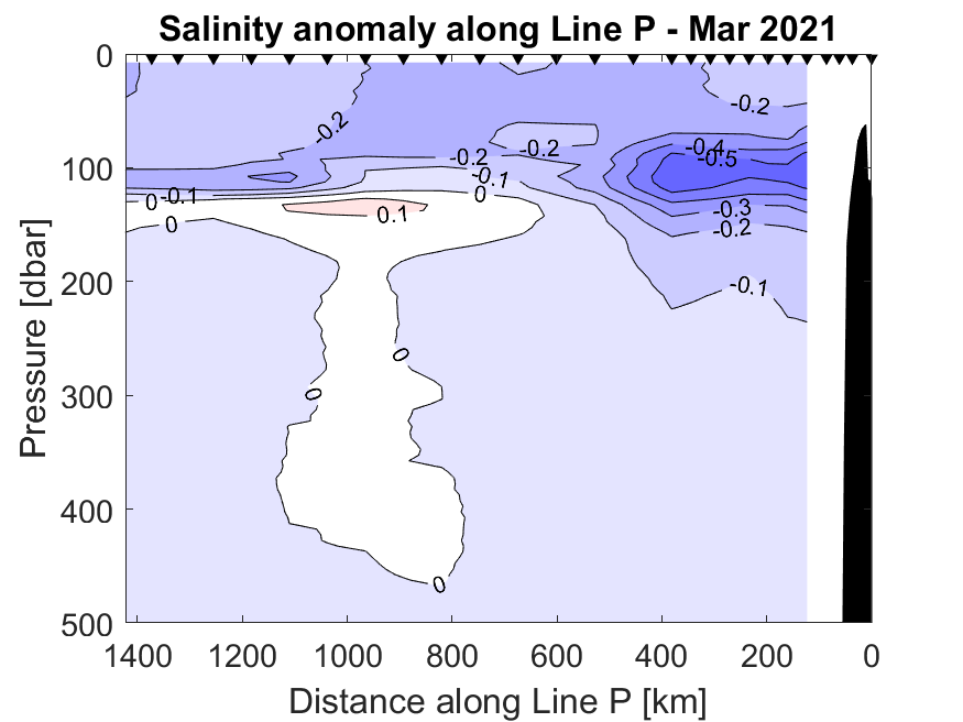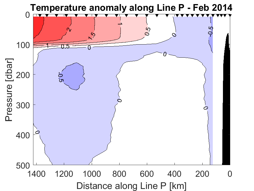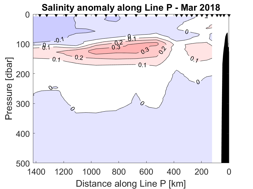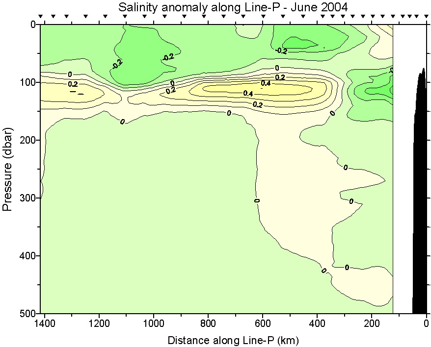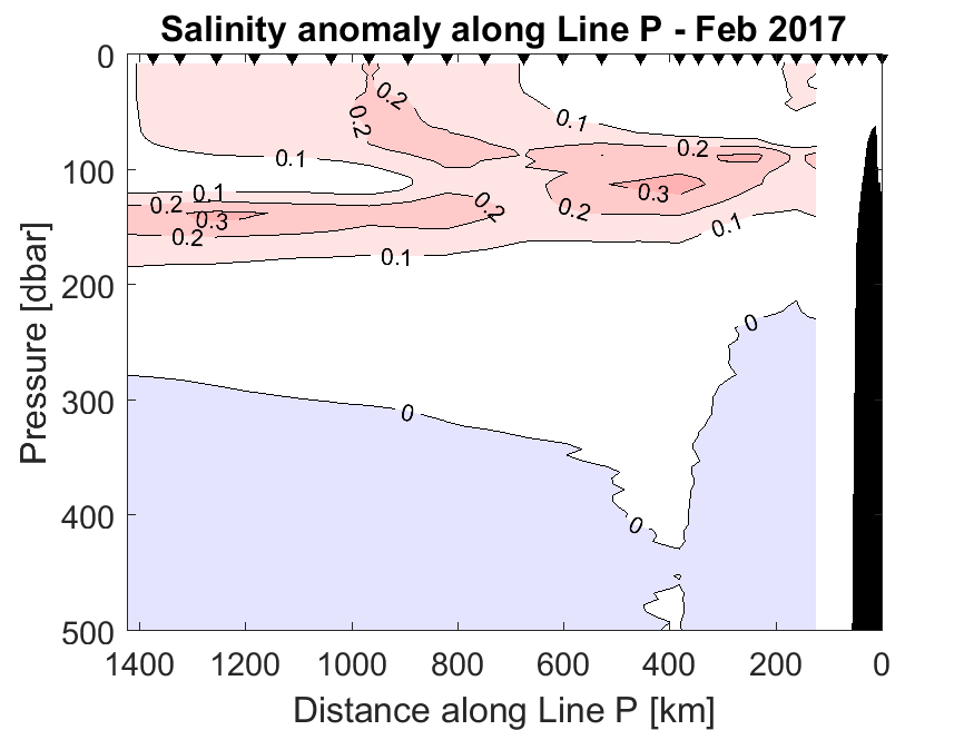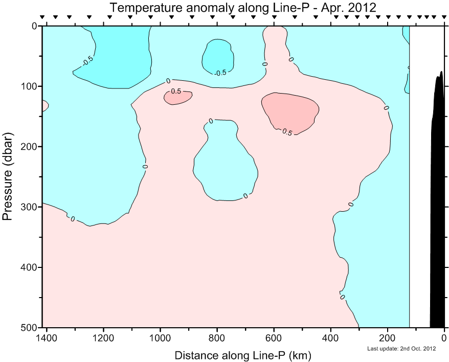 Pour le mois et l'année en cours, les sections sont calculées en utilisant les données disponibles à ce jour. Ces sections sont susceptibles d'être modifiées. Les versions définitives seront publiées lorsque toutes les données seront disponibles. Les anomalies sont calculées par rapport à la climatologie de la ligne P.