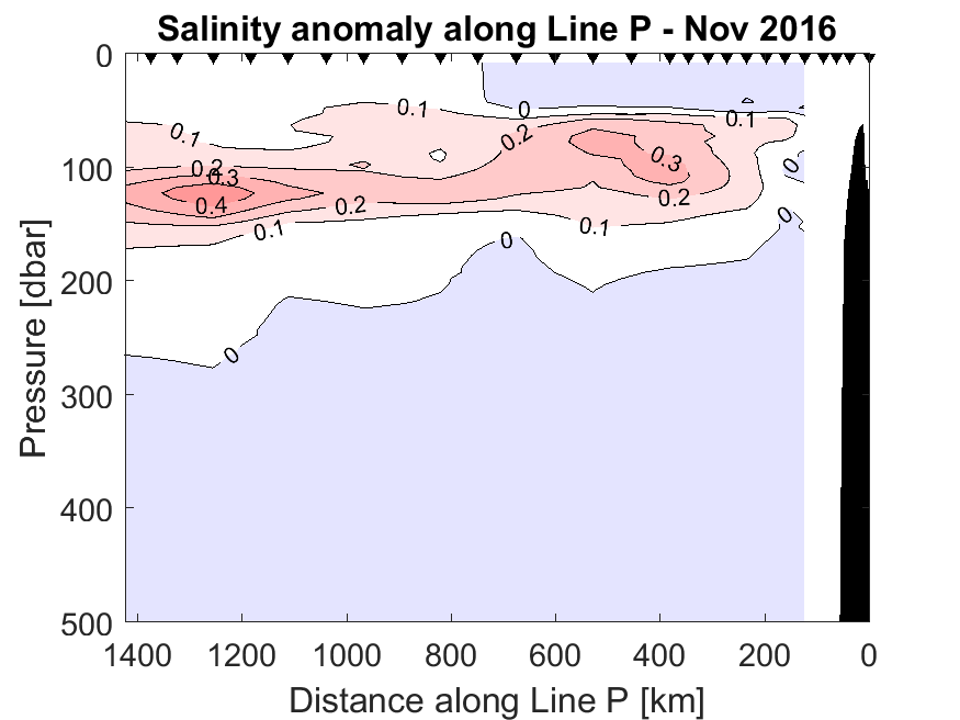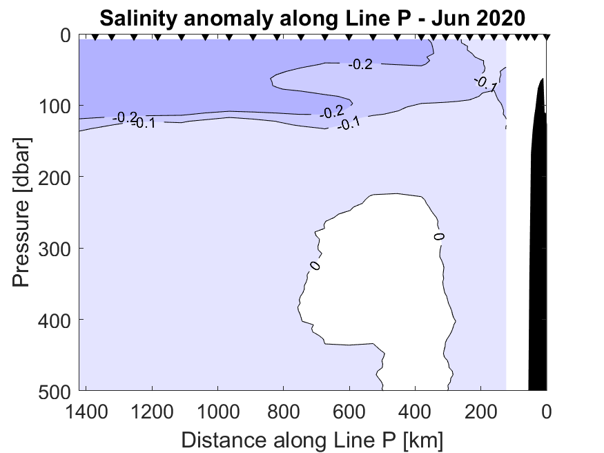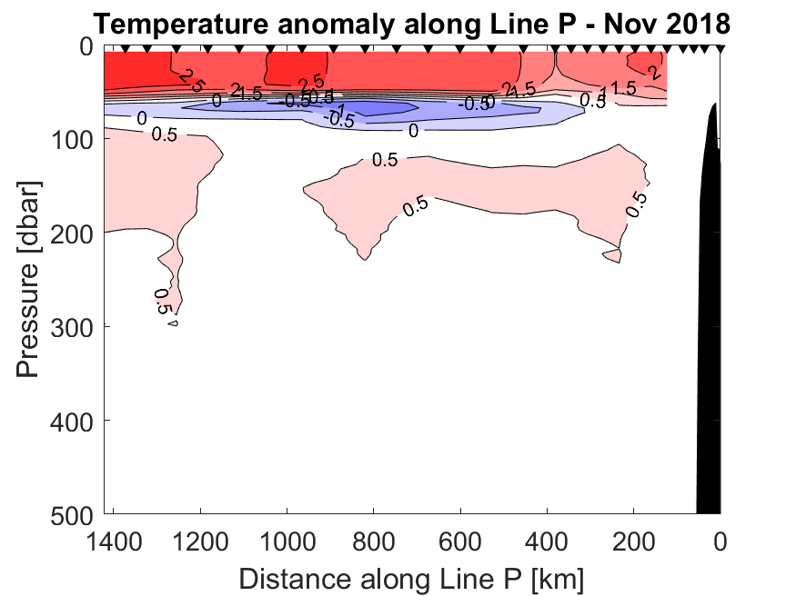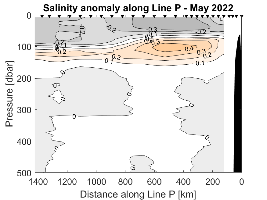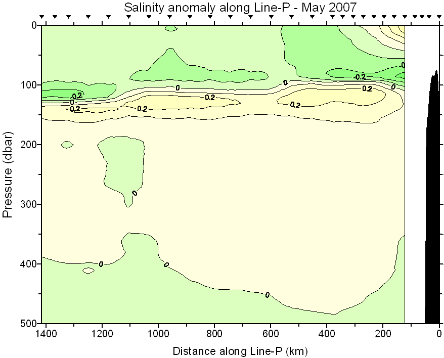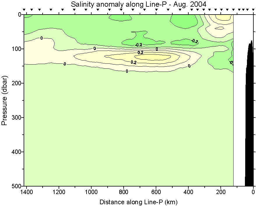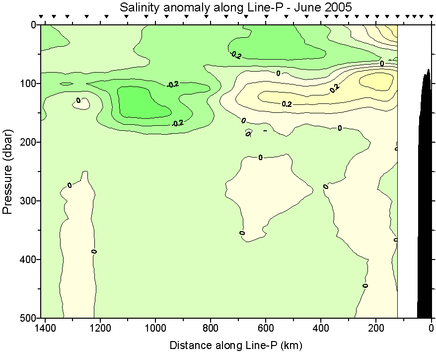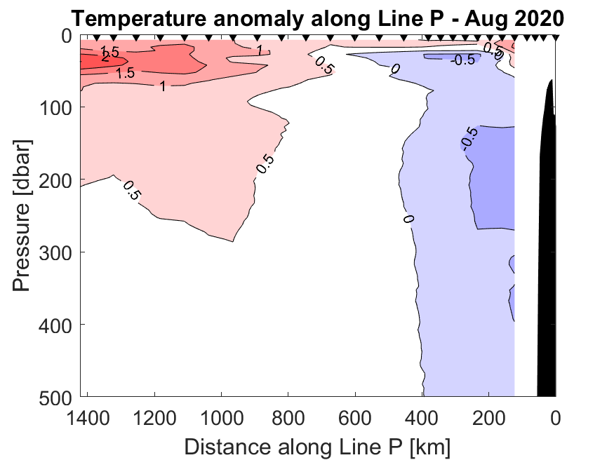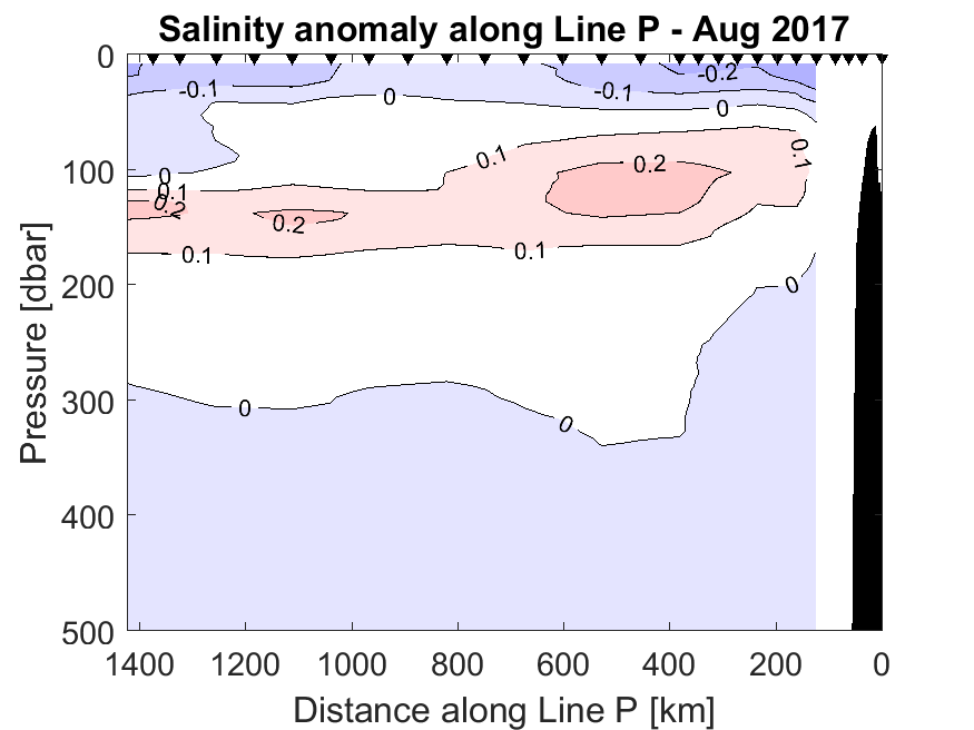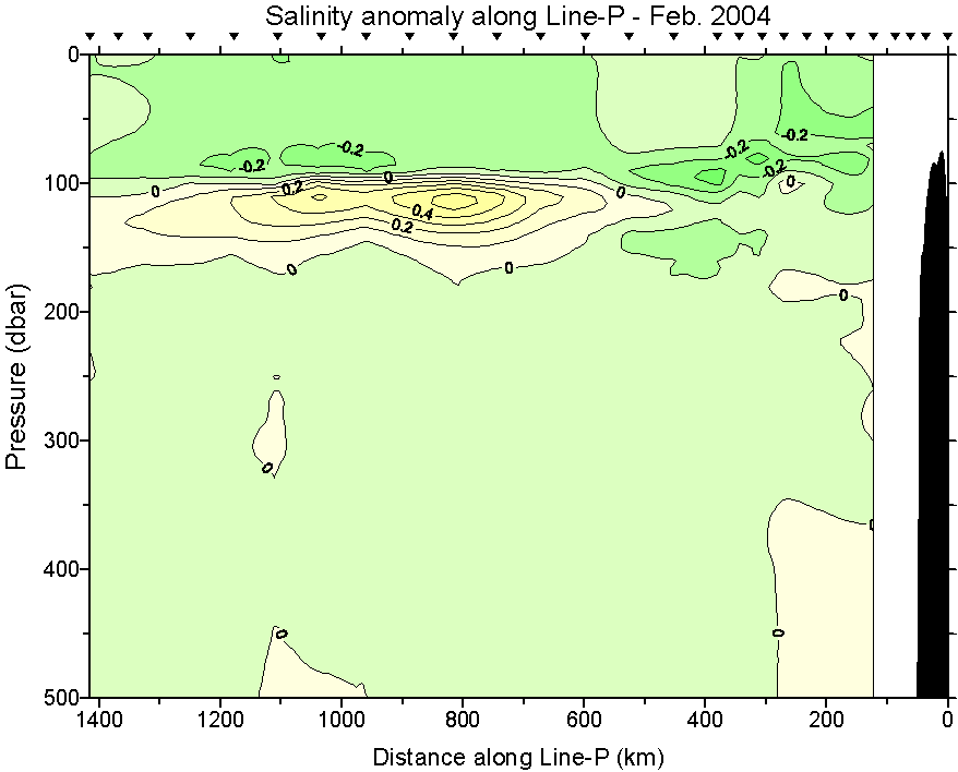 Pour le mois et l'année en cours, les sections sont calculées en utilisant les données disponibles à ce jour. Ces sections sont susceptibles d'être modifiées. Les versions définitives seront publiées lorsque toutes les données seront disponibles. Les anomalies sont calculées par rapport à la climatologie de la ligne P.