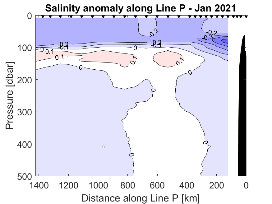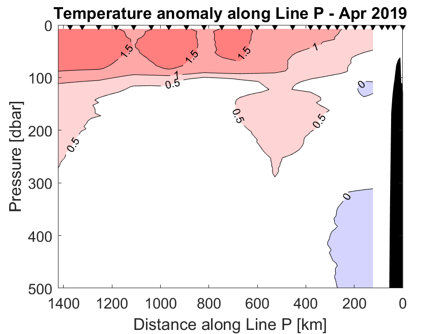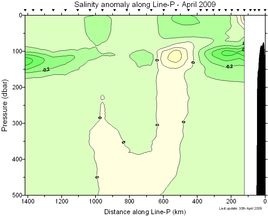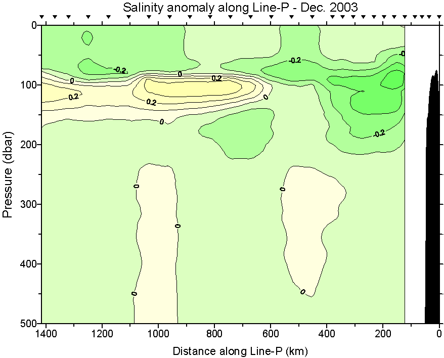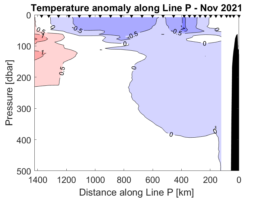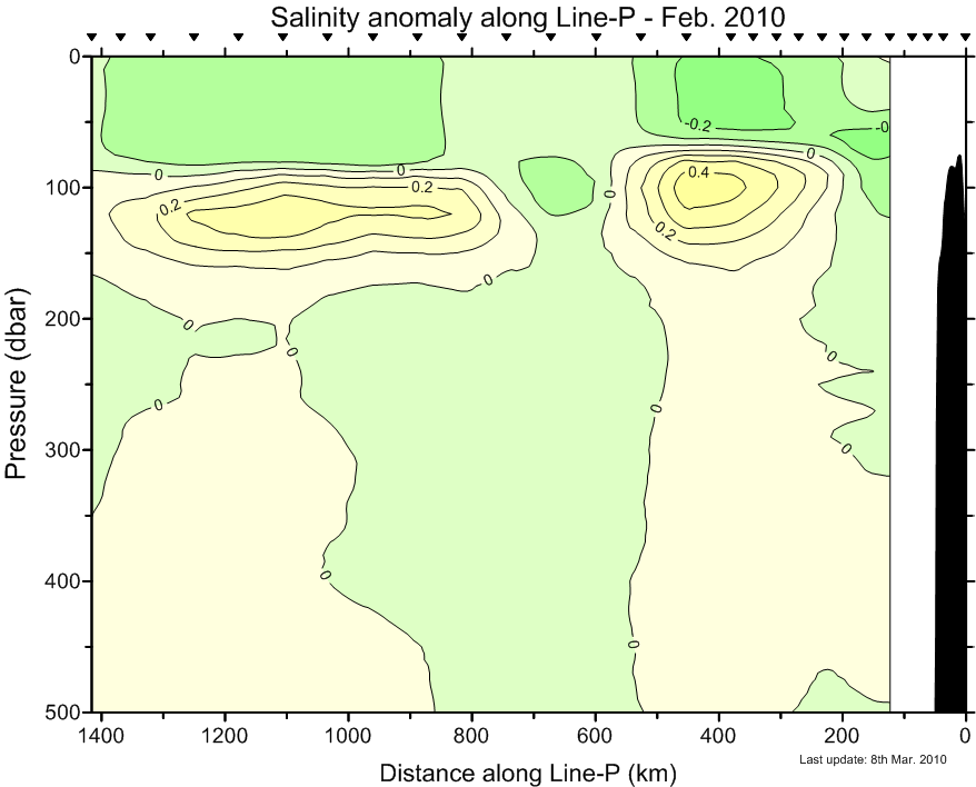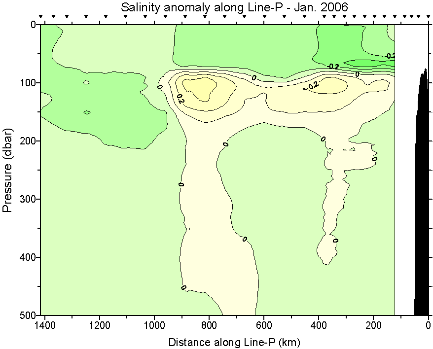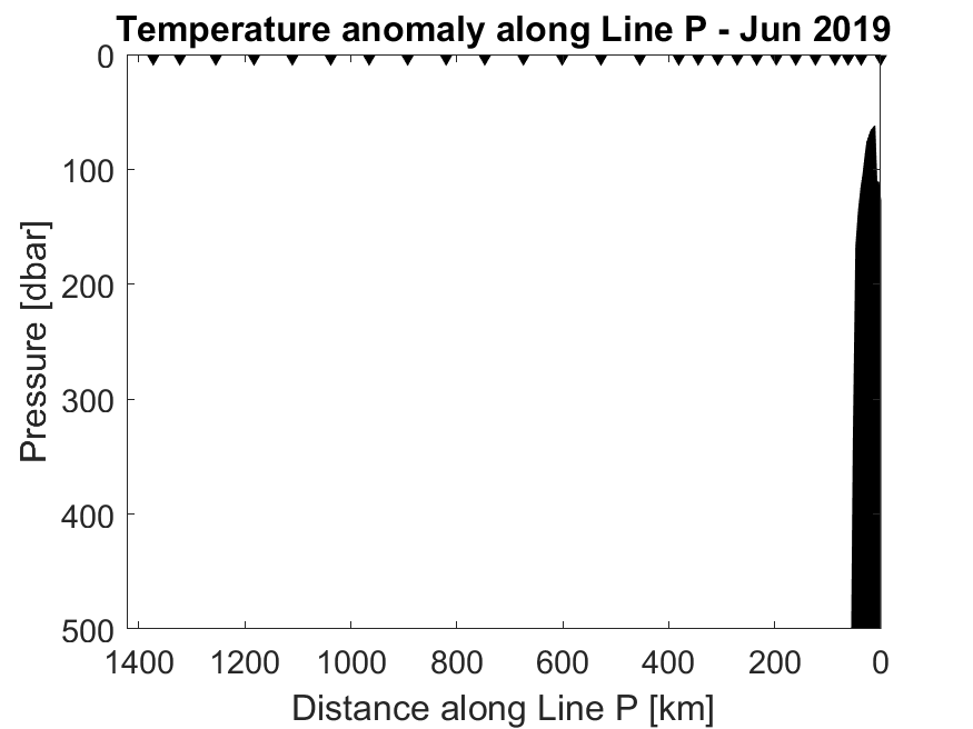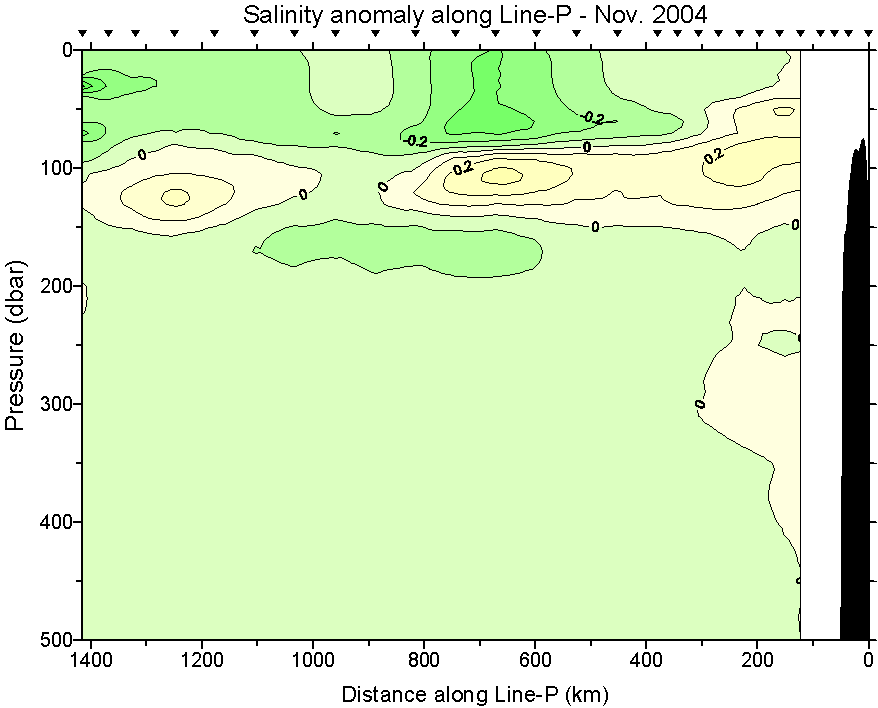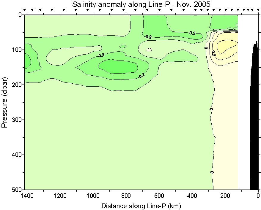 Pour le mois et l'année en cours, les sections sont calculées en utilisant les données disponibles à ce jour. Ces sections sont susceptibles d'être modifiées. Les versions définitives seront publiées lorsque toutes les données seront disponibles. Les anomalies sont calculées par rapport à la climatologie de la ligne P.