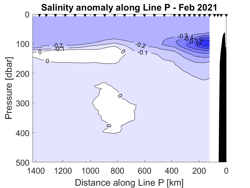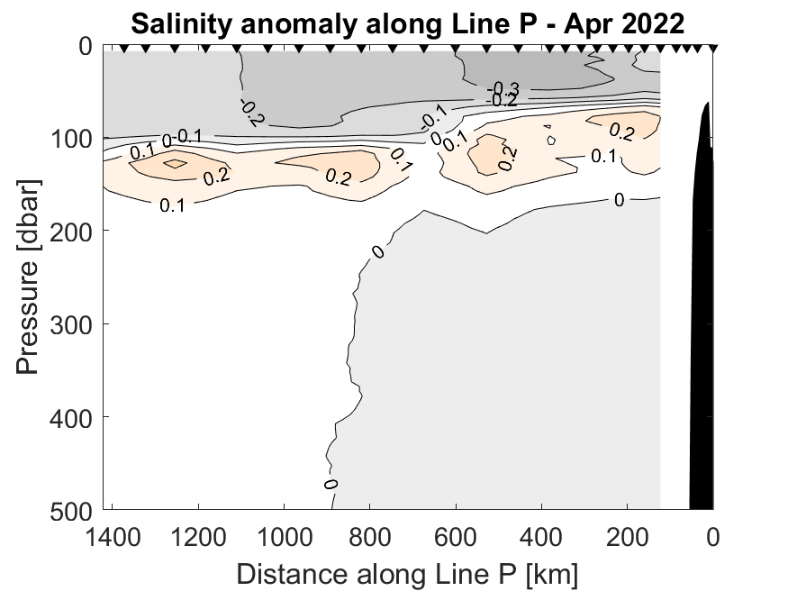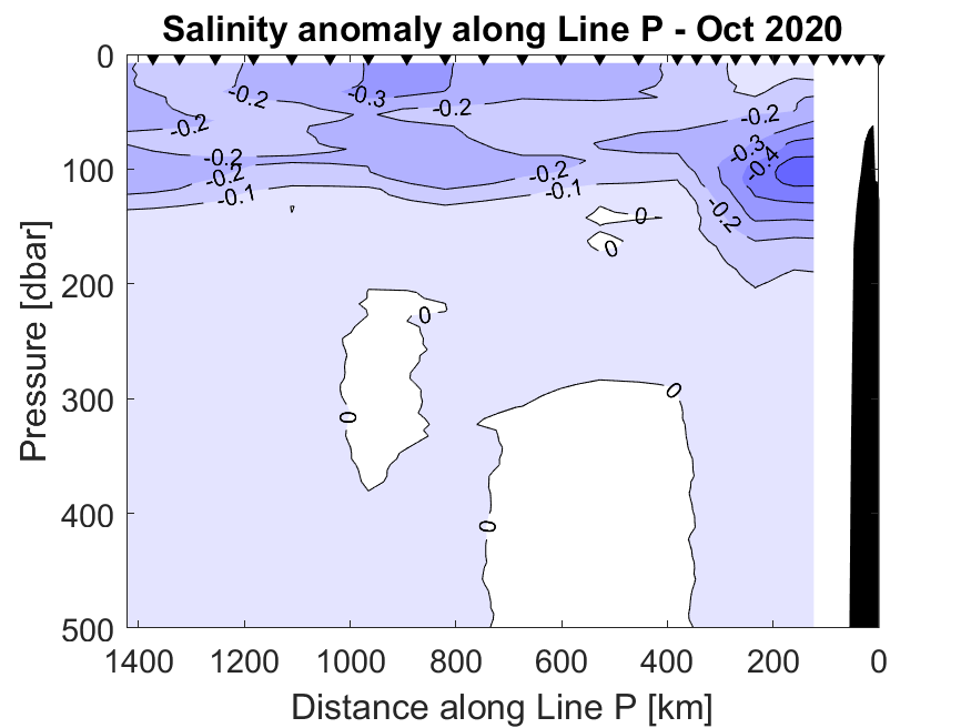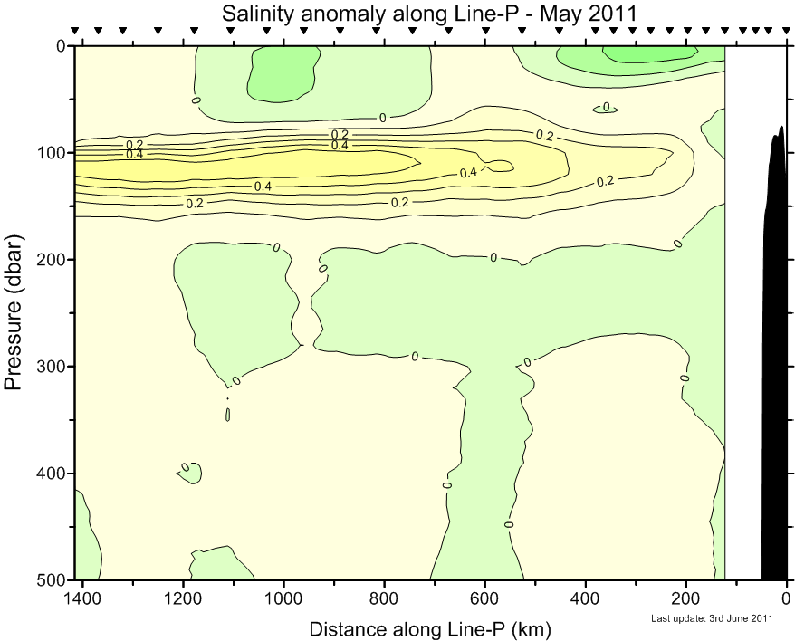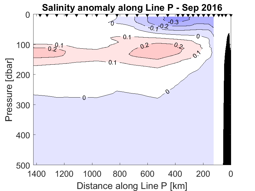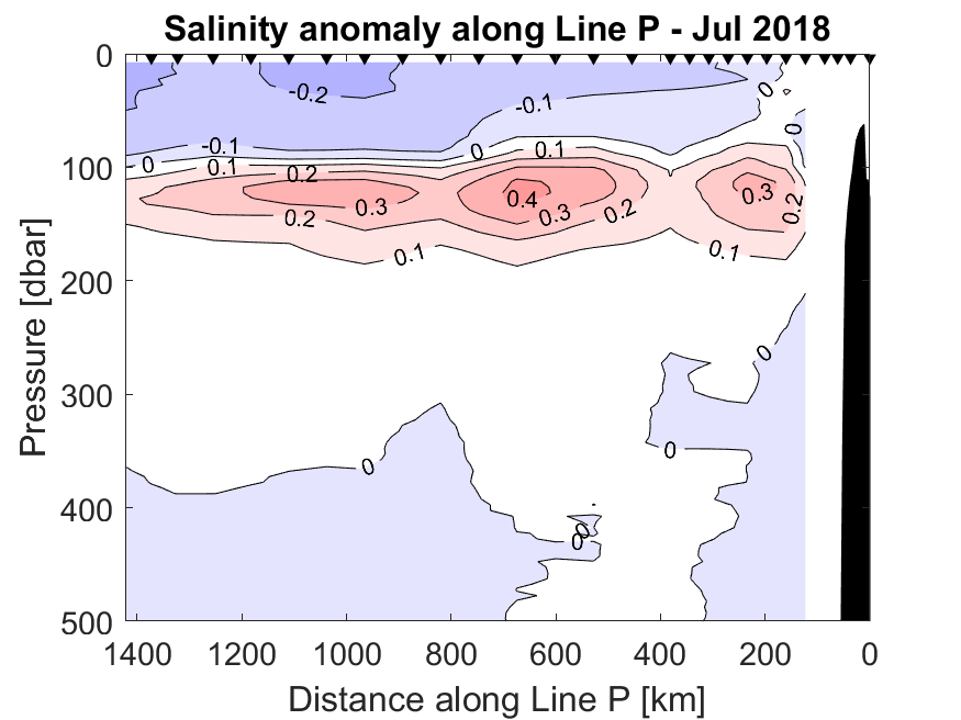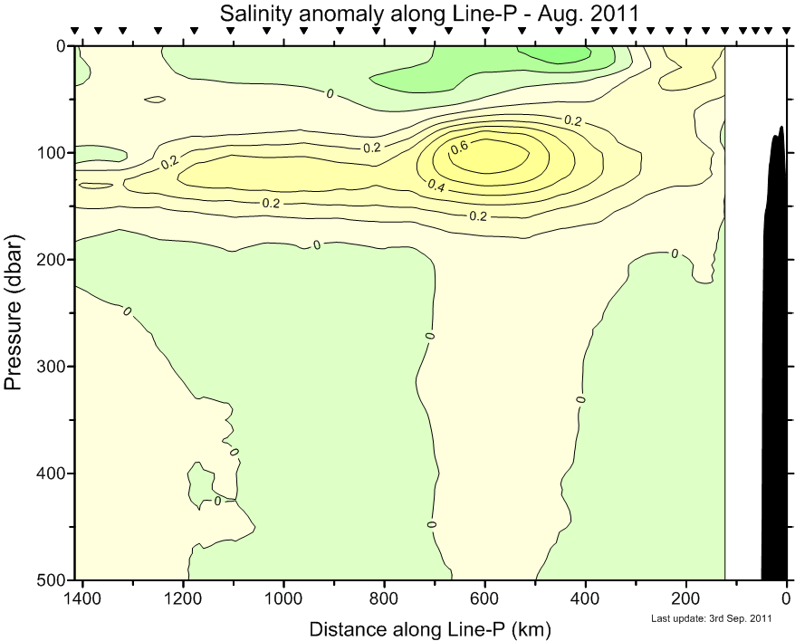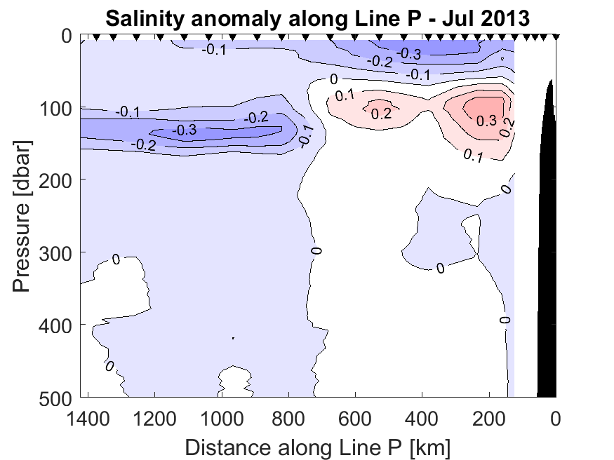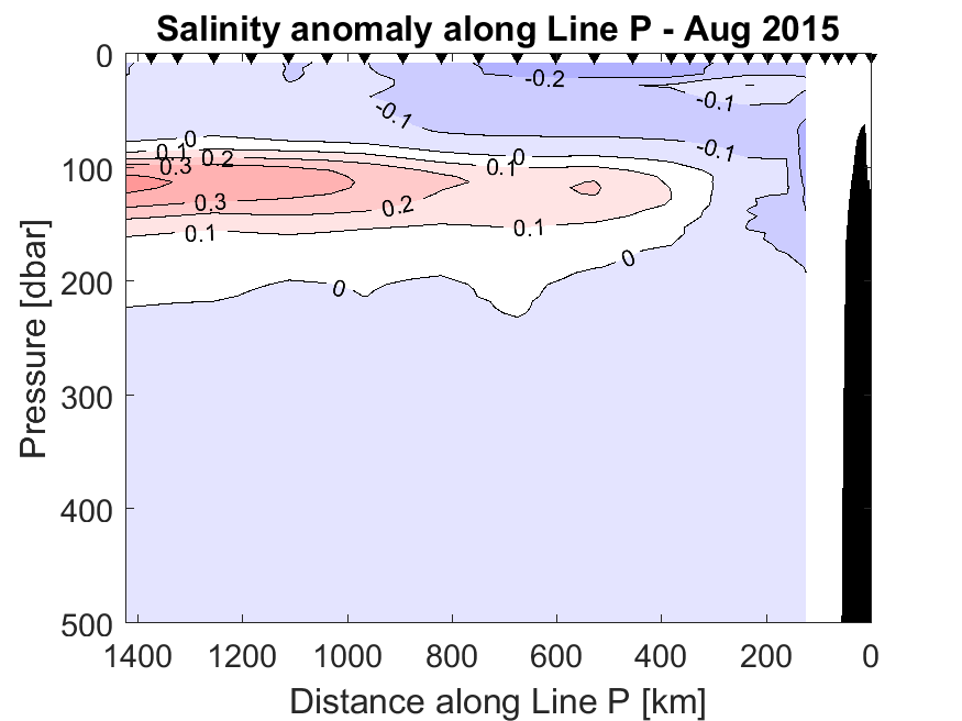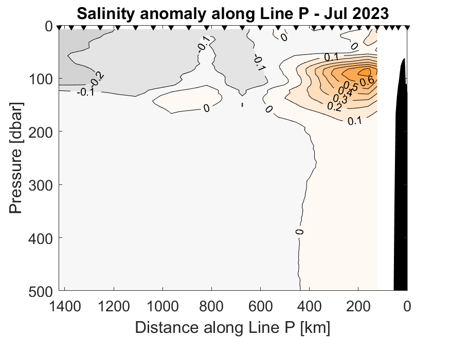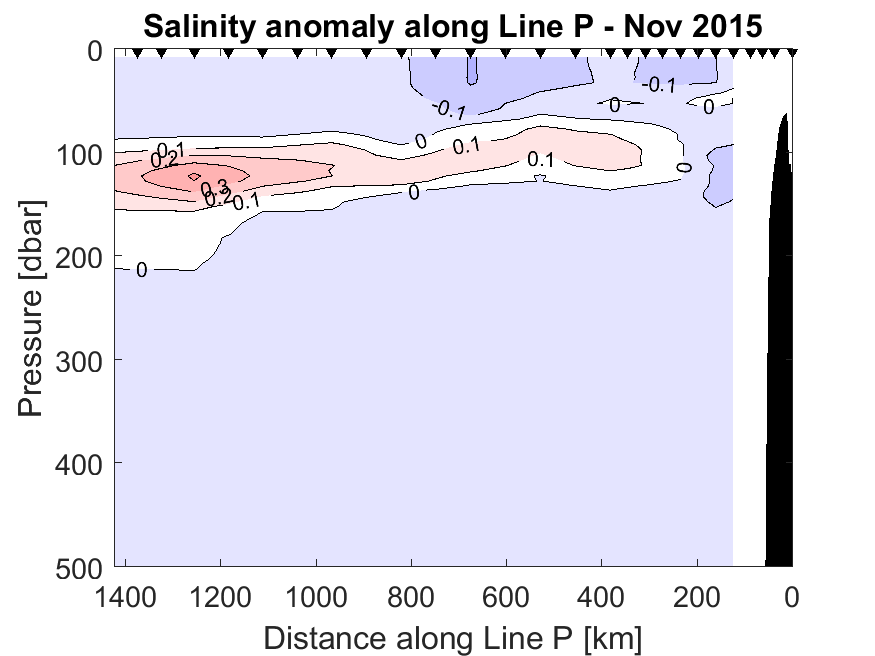 Pour le mois et l'année en cours, les sections sont calculées en utilisant les données disponibles à ce jour. Ces sections sont susceptibles d'être modifiées. Les versions définitives seront publiées lorsque toutes les données seront disponibles. Les anomalies sont calculées par rapport à la climatologie de la ligne P.