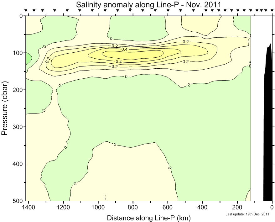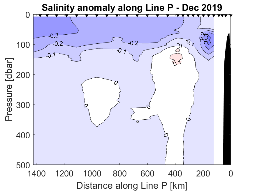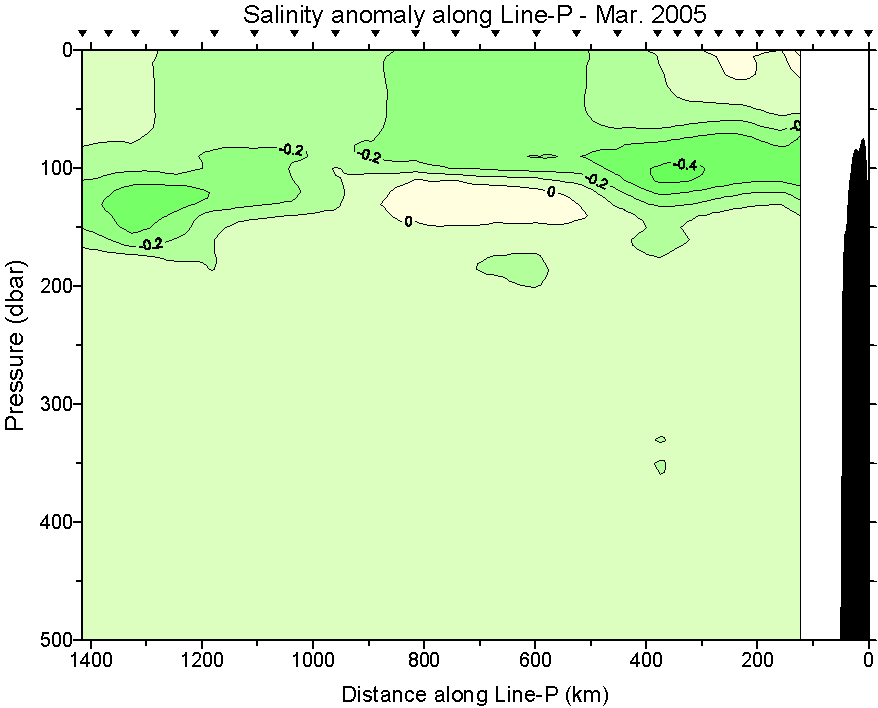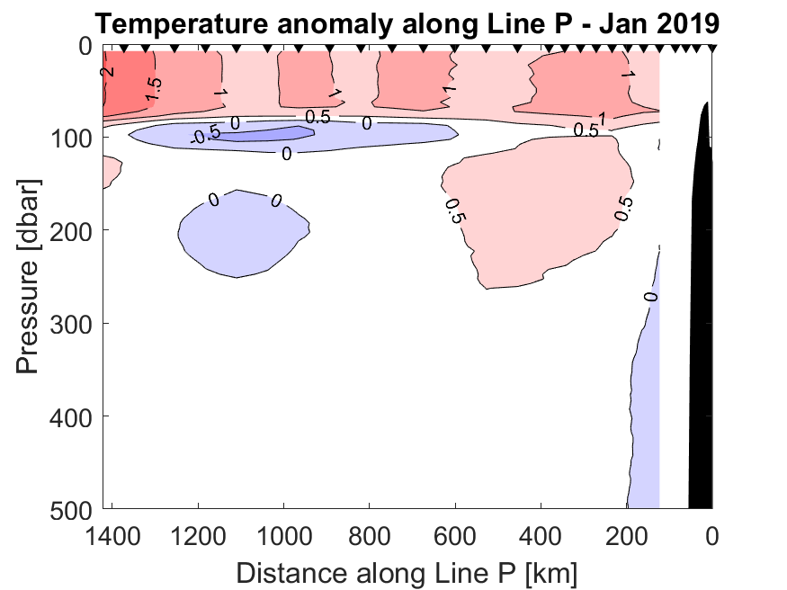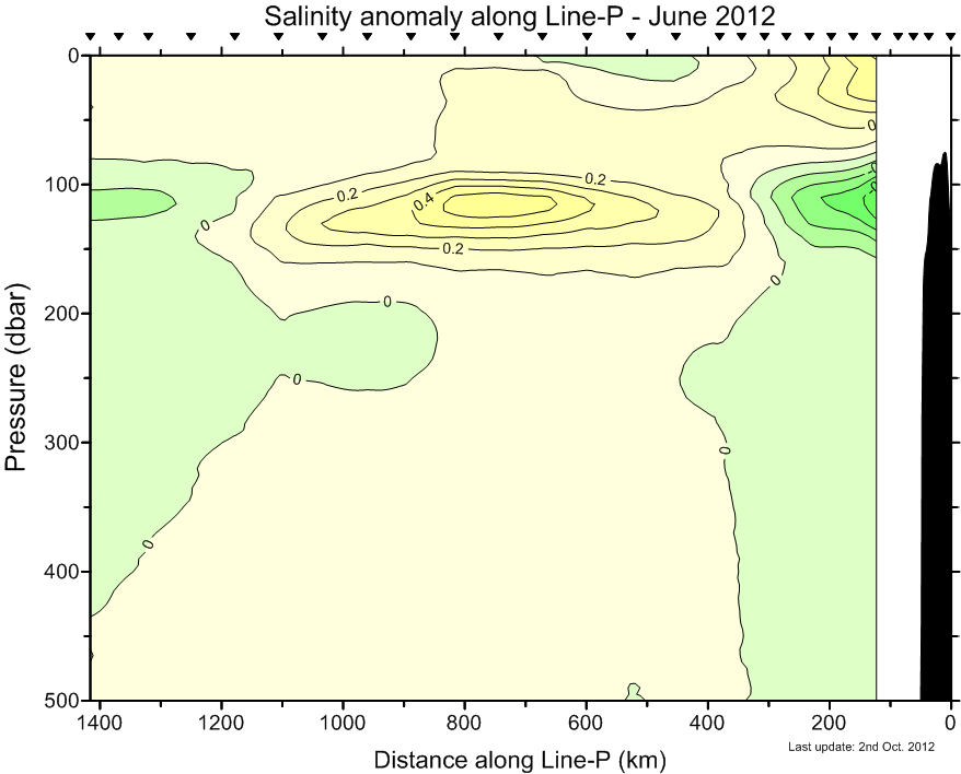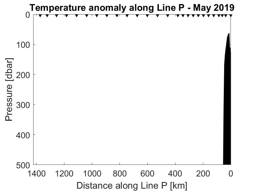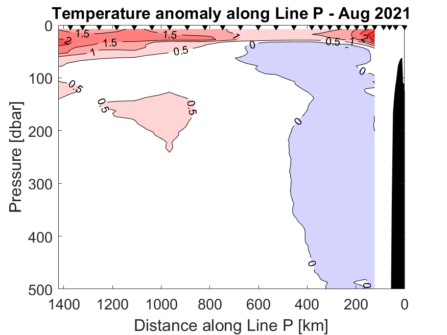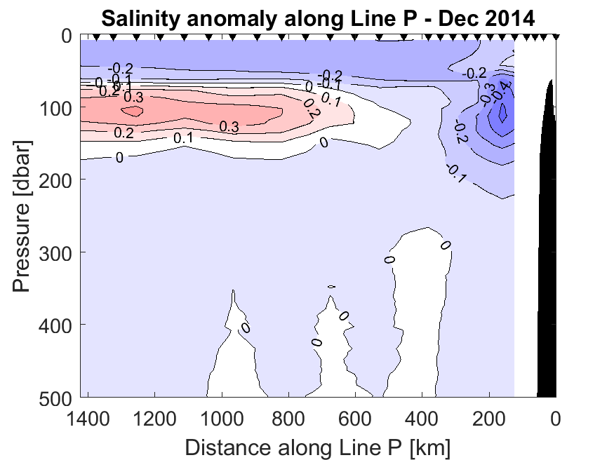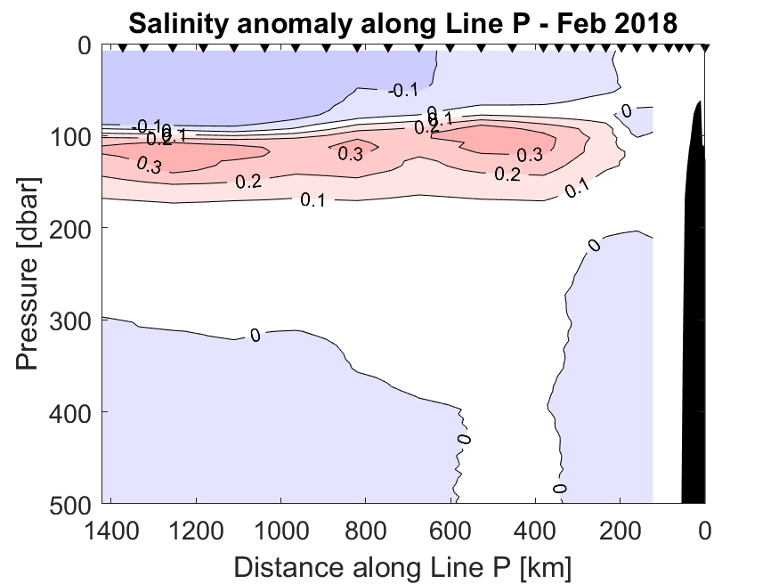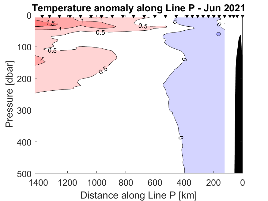 Pour le mois et l'année en cours, les sections sont calculées en utilisant les données disponibles à ce jour. Ces sections sont susceptibles d'être modifiées. Les versions définitives seront publiées lorsque toutes les données seront disponibles. Les anomalies sont calculées par rapport à la climatologie de la ligne P.
