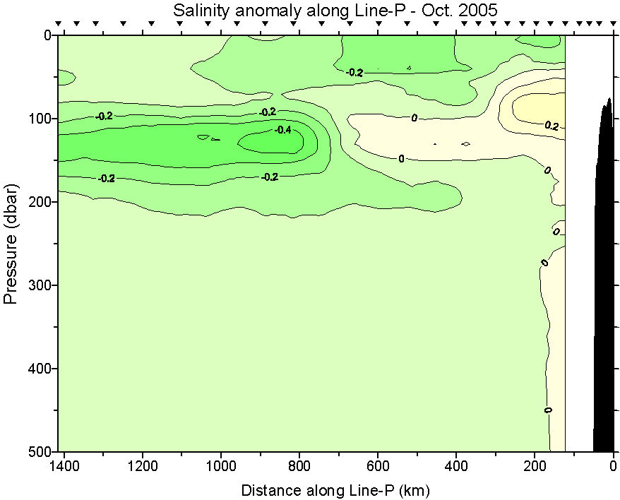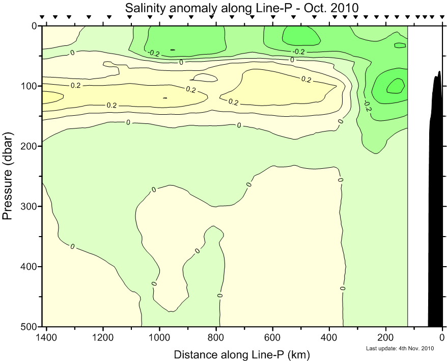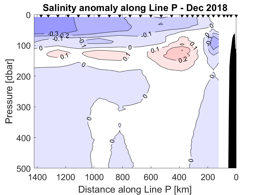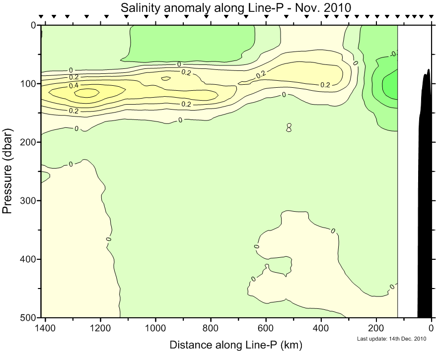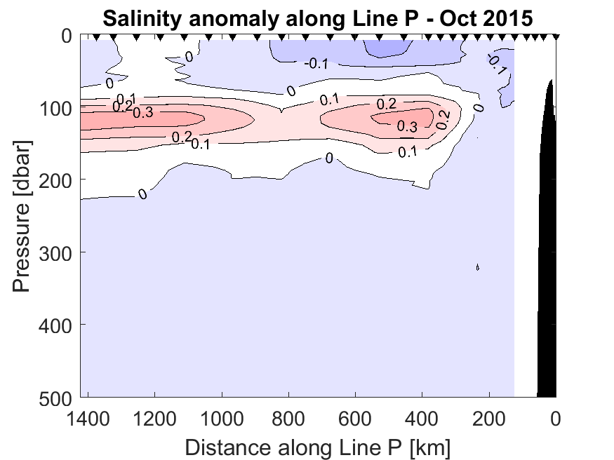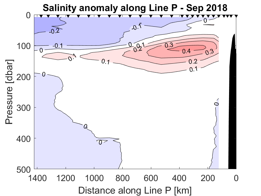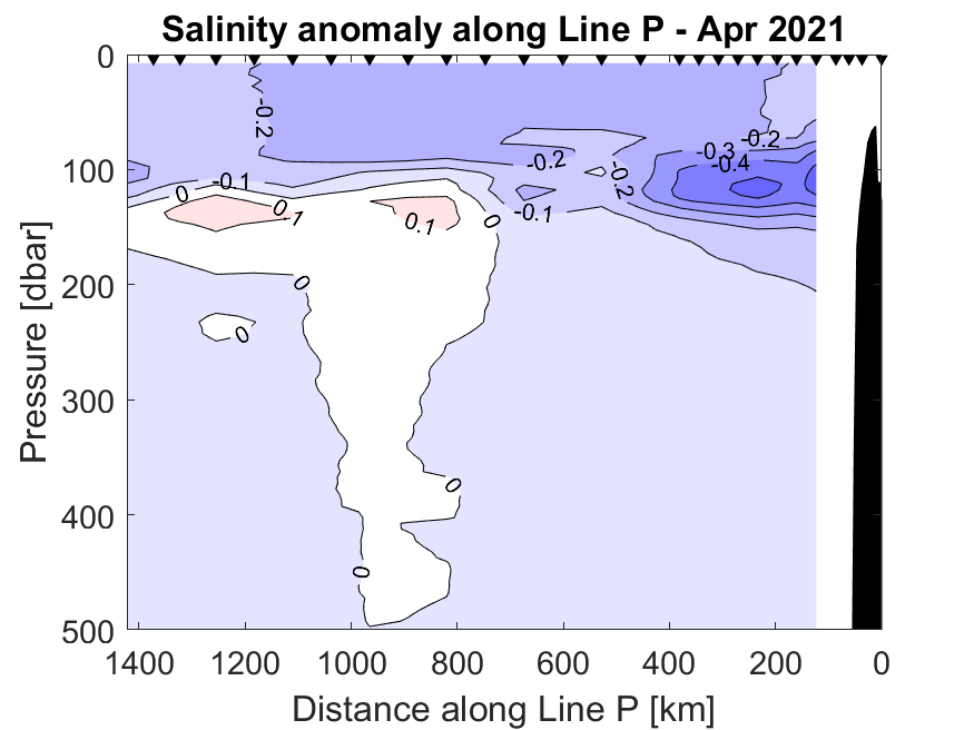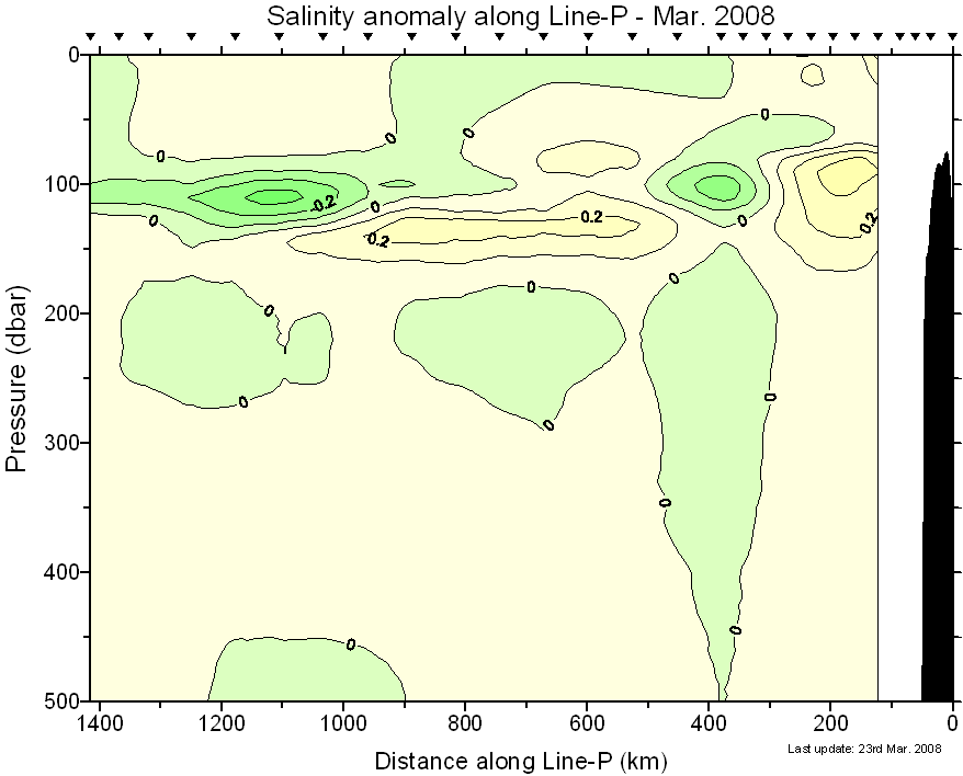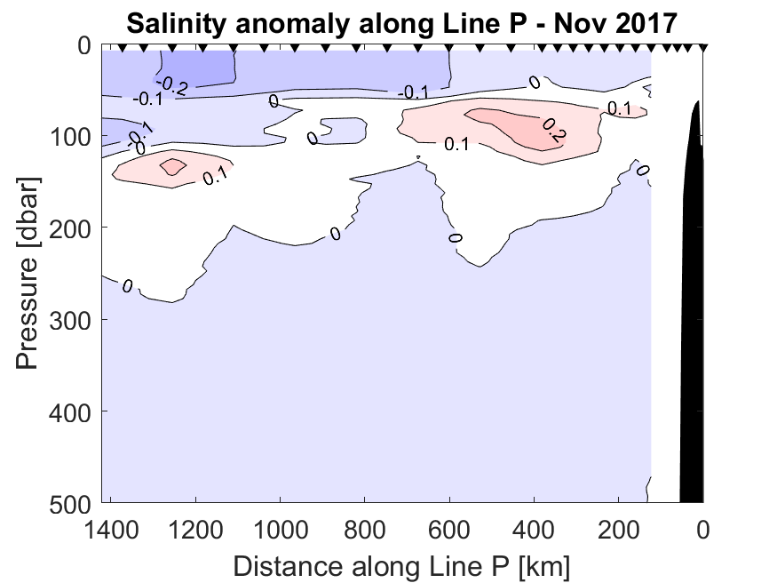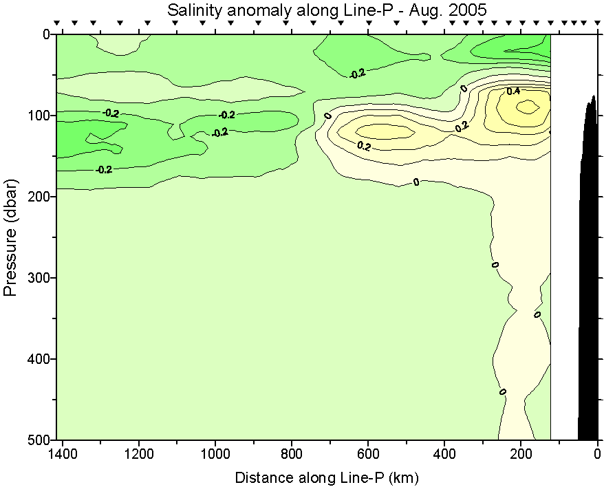 Pour le mois et l'année en cours, les sections sont calculées en utilisant les données disponibles à ce jour. Ces sections sont susceptibles d'être modifiées. Les versions définitives seront publiées lorsque toutes les données seront disponibles. Les anomalies sont calculées par rapport à la climatologie de la ligne P.