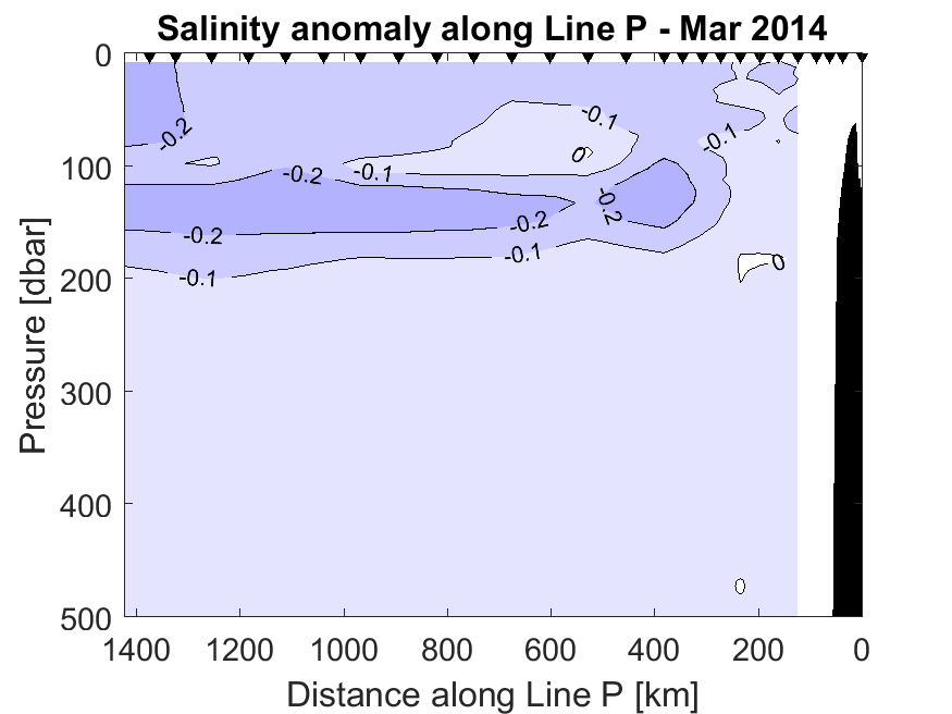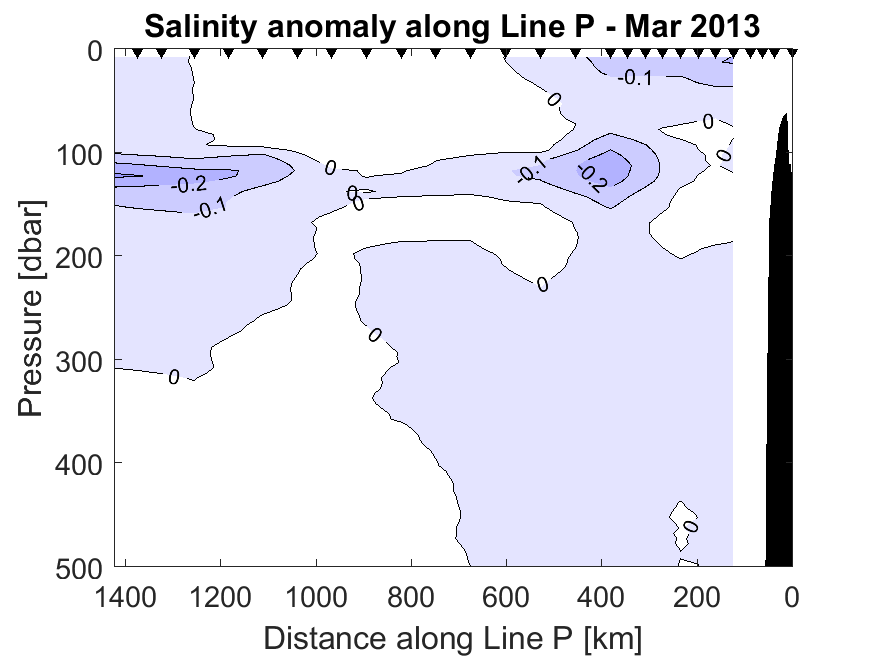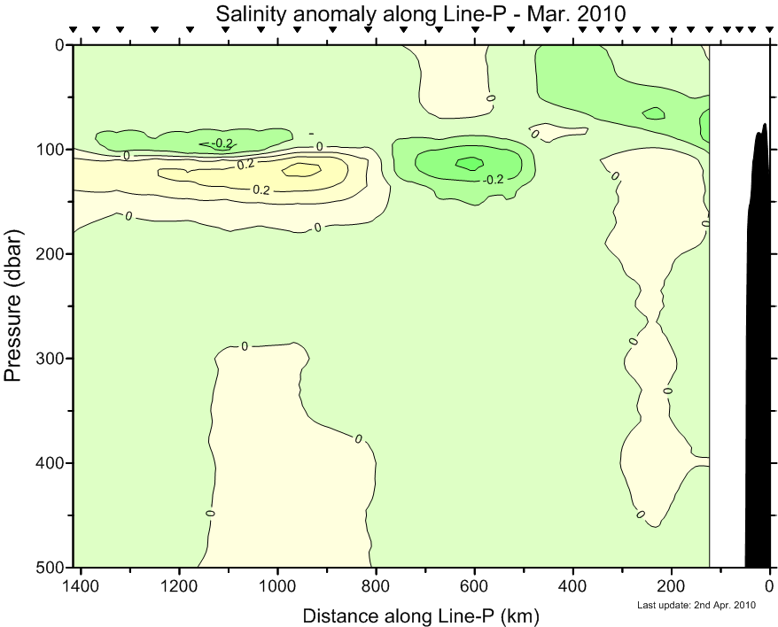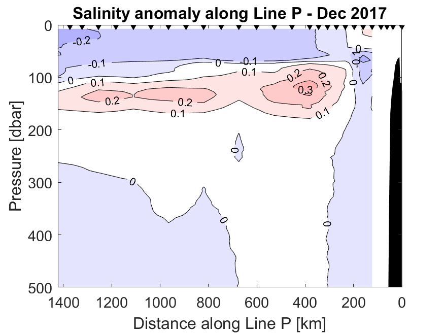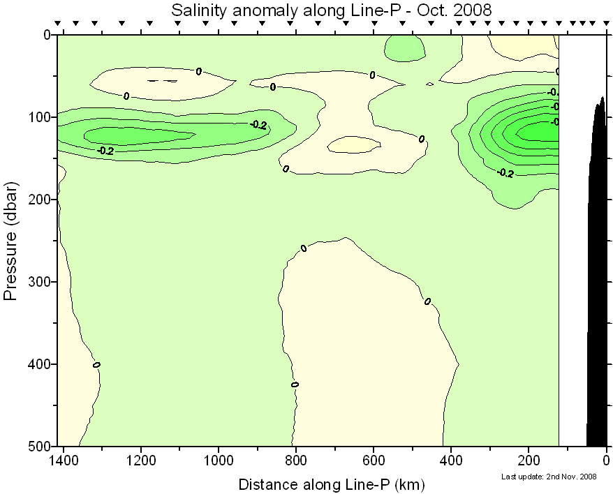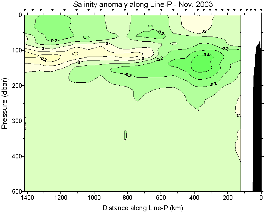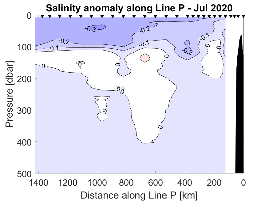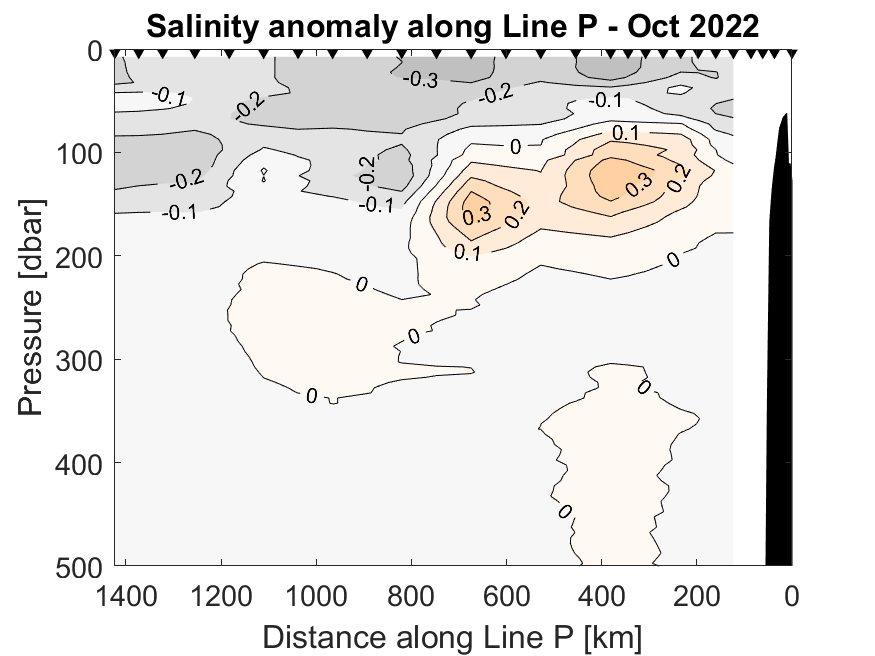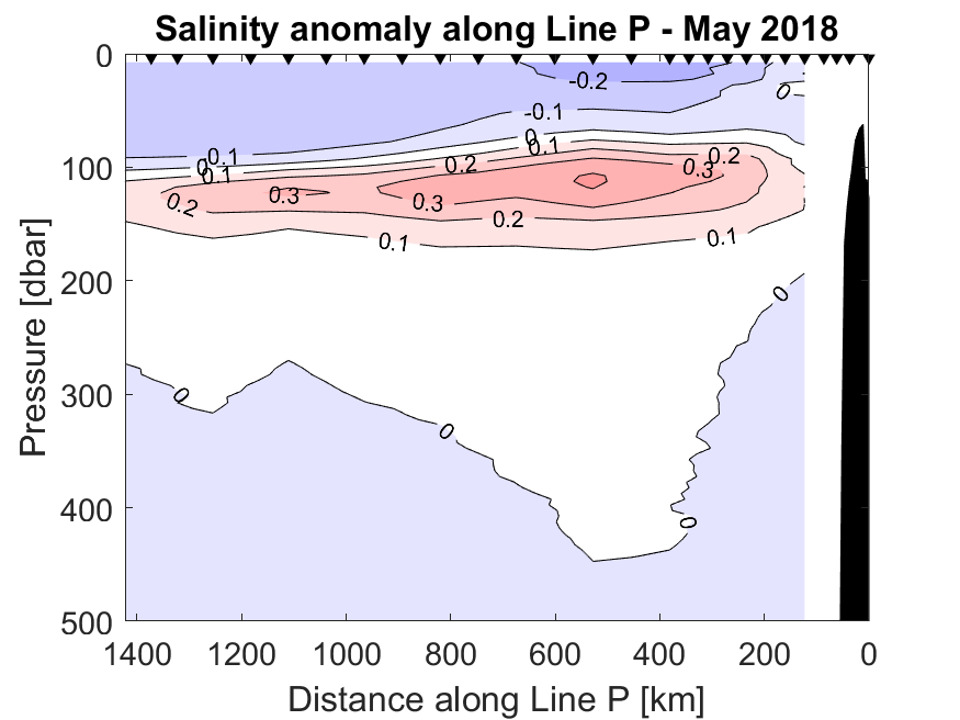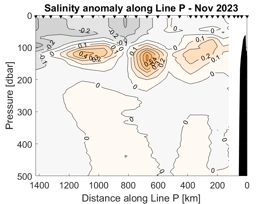 Pour le mois et l'année en cours, les sections sont calculées en utilisant les données disponibles à ce jour. Ces sections sont susceptibles d'être modifiées. Les versions définitives seront publiées lorsque toutes les données seront disponibles. Les anomalies sont calculées par rapport à la climatologie de la ligne P.