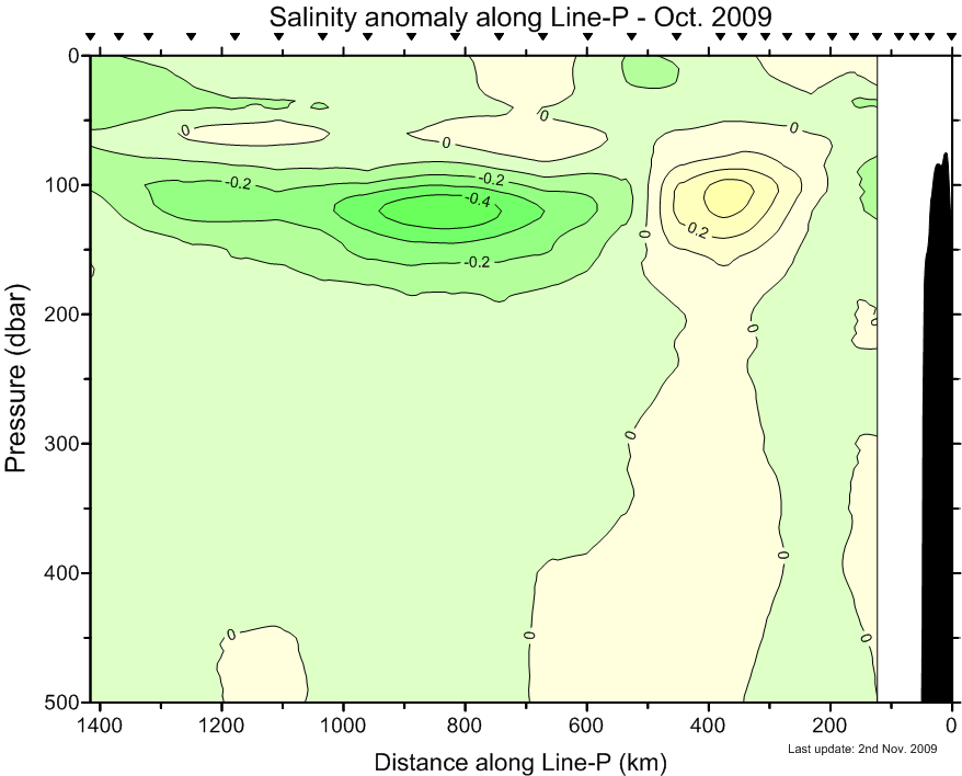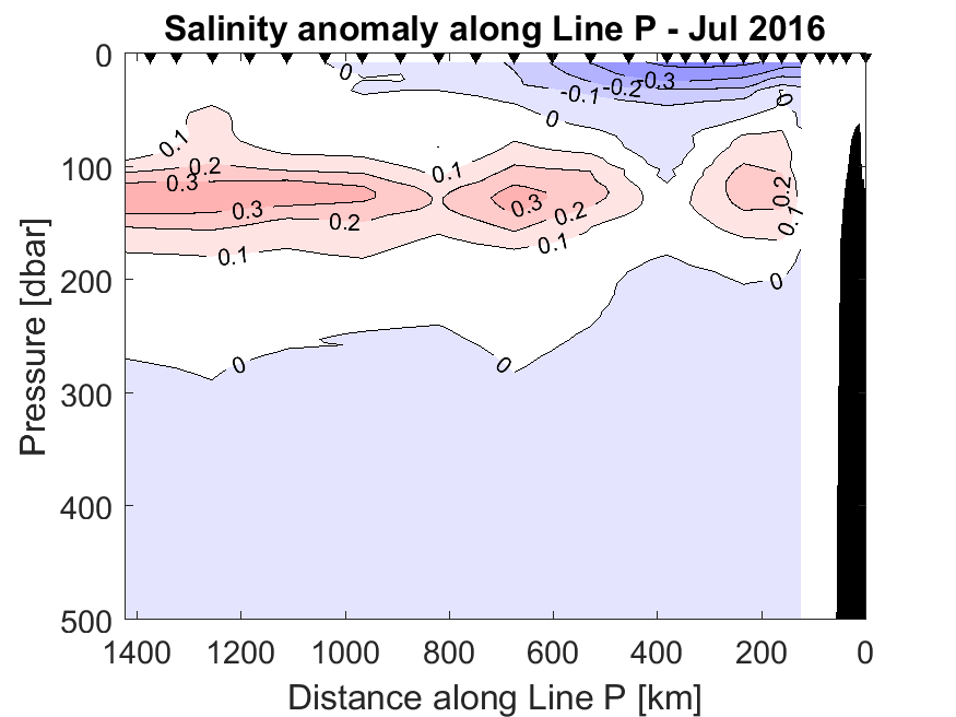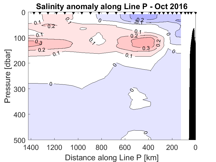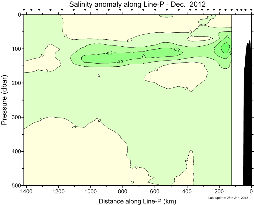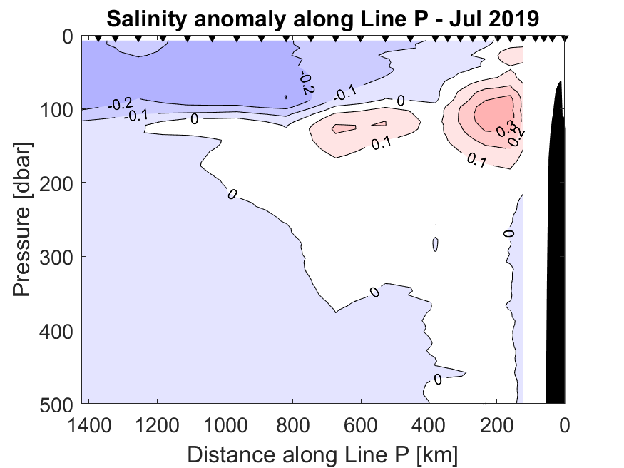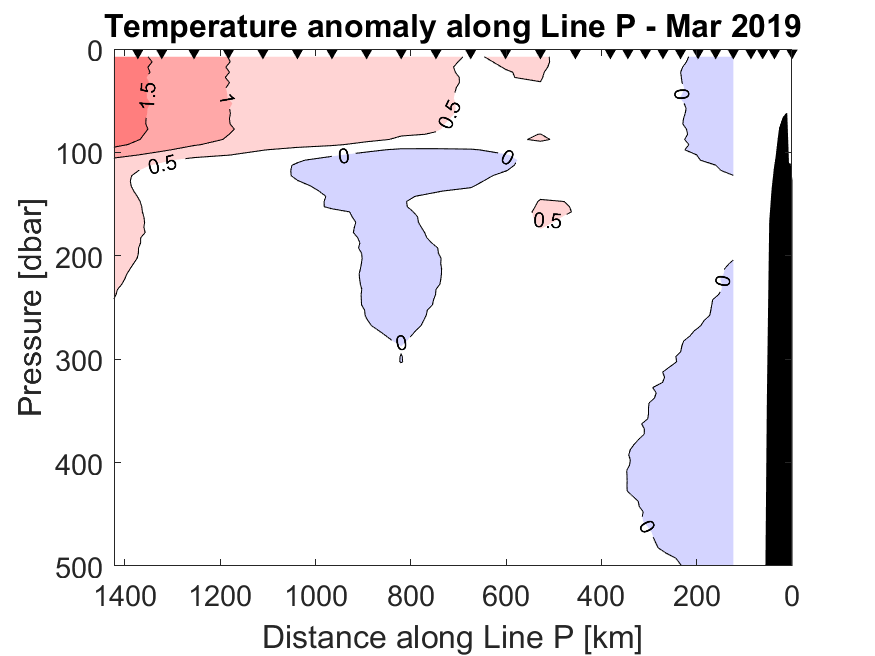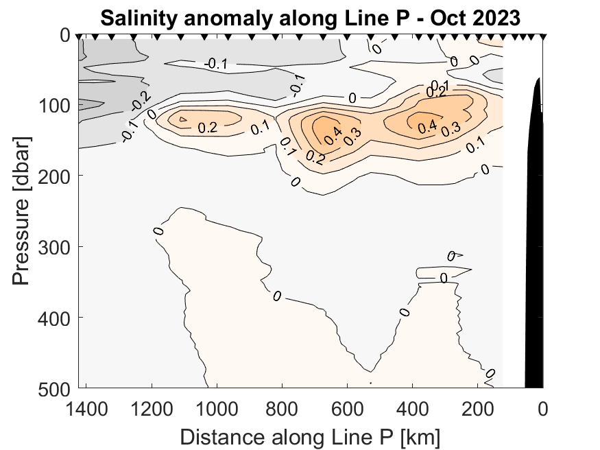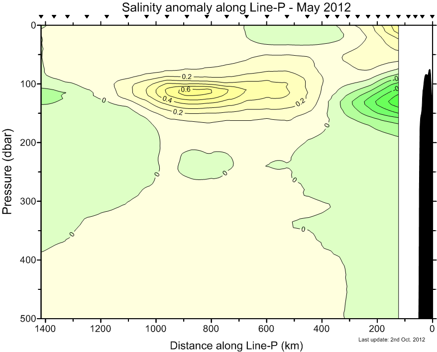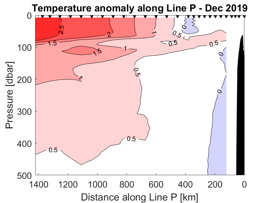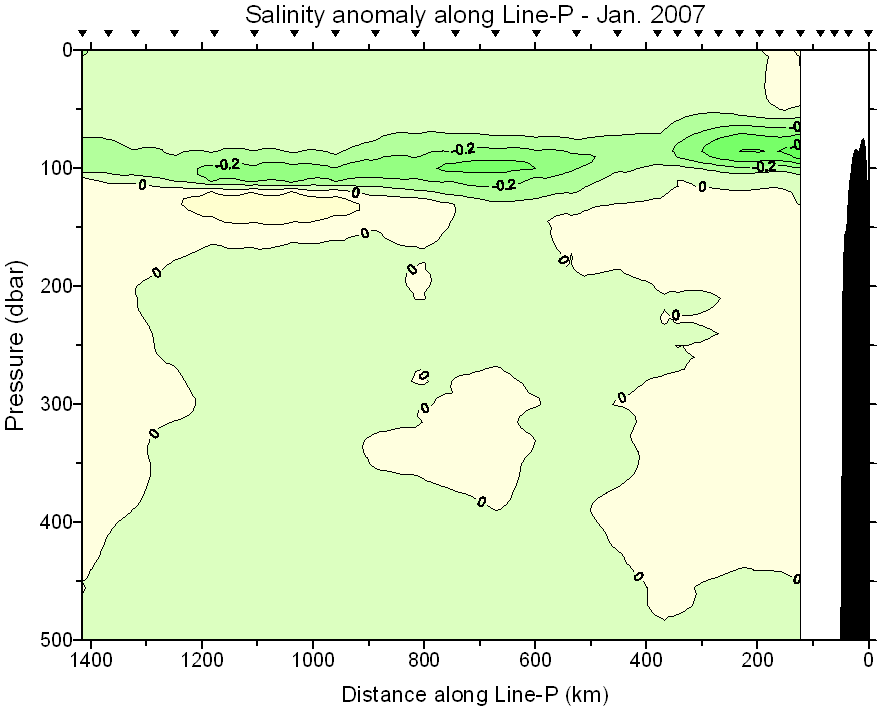Pour le mois et l'année en cours, les sections sont calculées en utilisant les données disponibles à ce jour. Ces sections sont susceptibles d'être modifiées. Les versions définitives seront publiées lorsque toutes les données seront disponibles. Les anomalies sont calculées par rapport à la climatologie de la ligne P.
