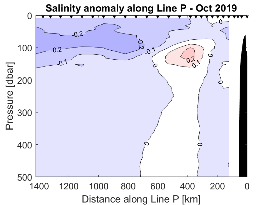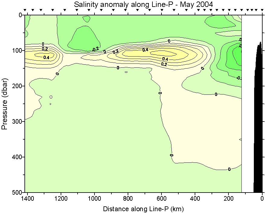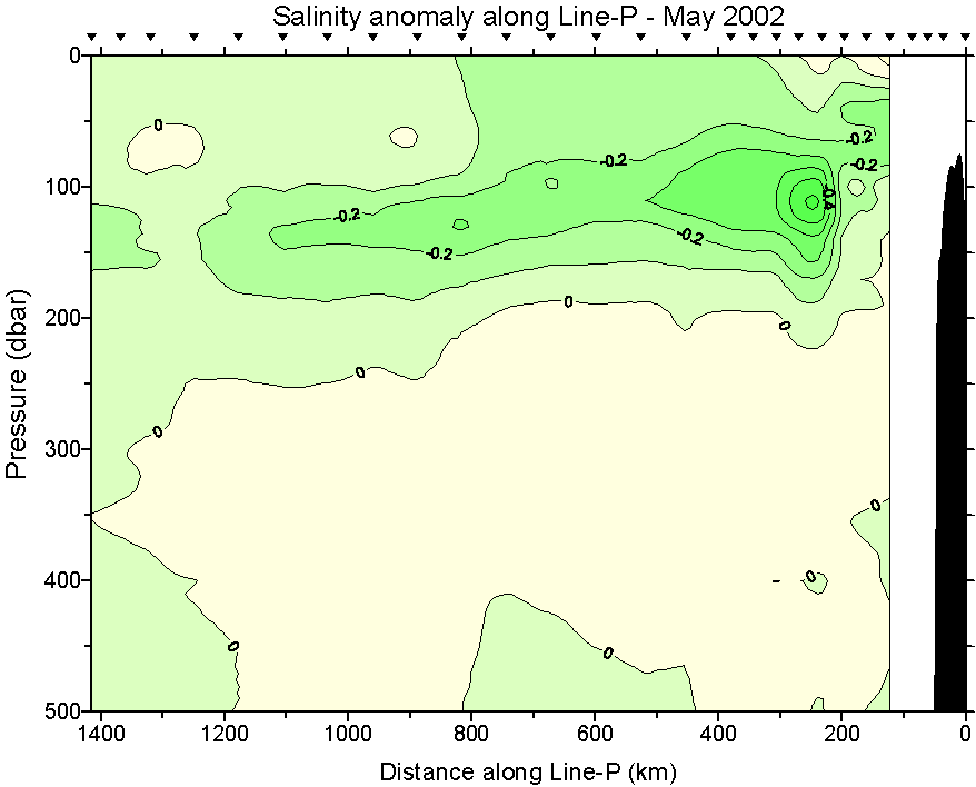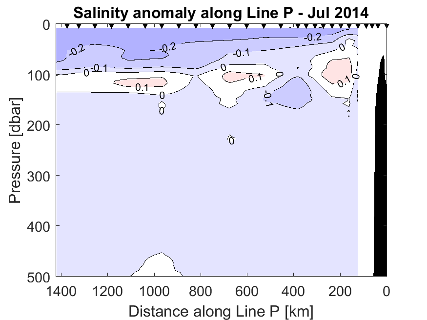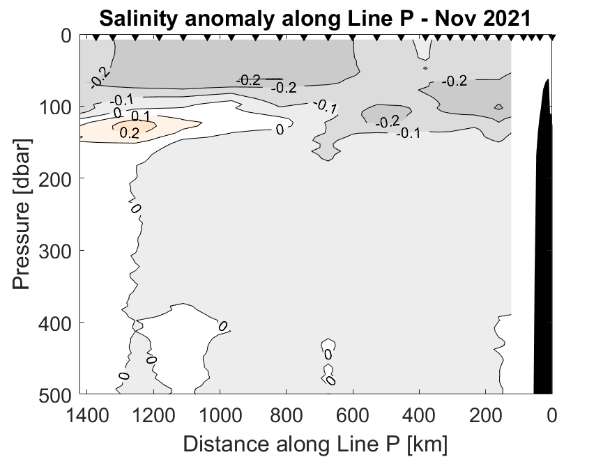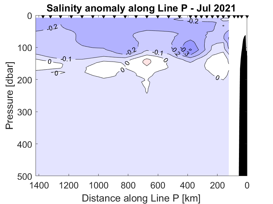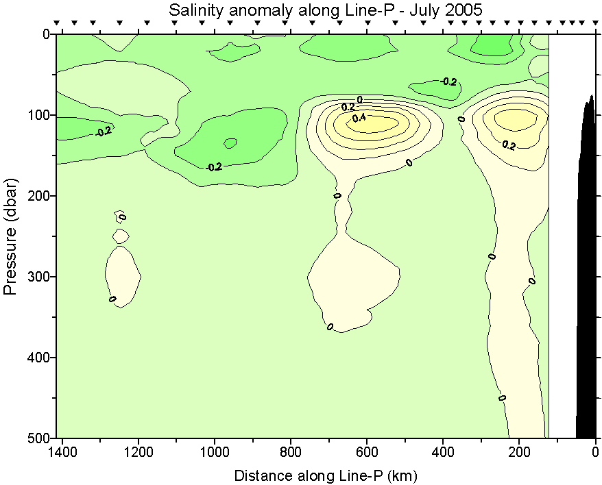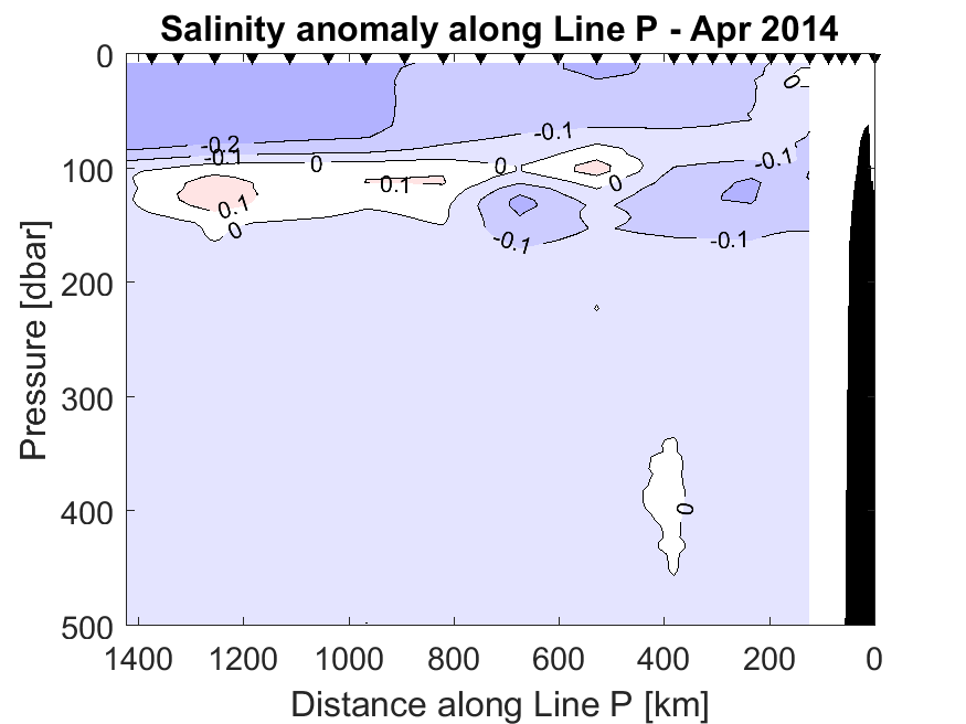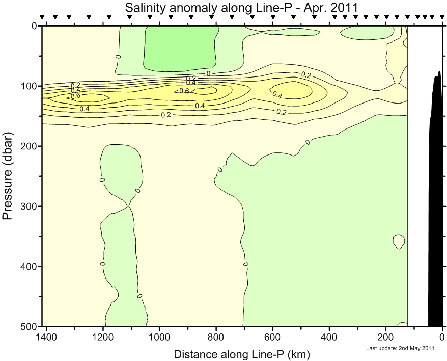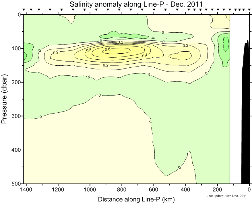 Pour le mois et l'année en cours, les sections sont calculées en utilisant les données disponibles à ce jour. Ces sections sont susceptibles d'être modifiées. Les versions définitives seront publiées lorsque toutes les données seront disponibles. Les anomalies sont calculées par rapport à la climatologie de la ligne P.