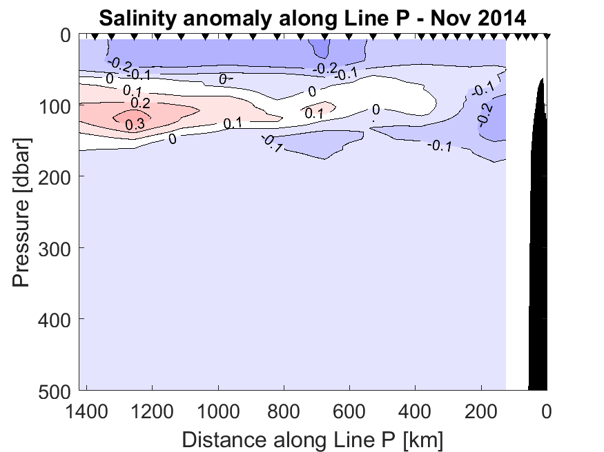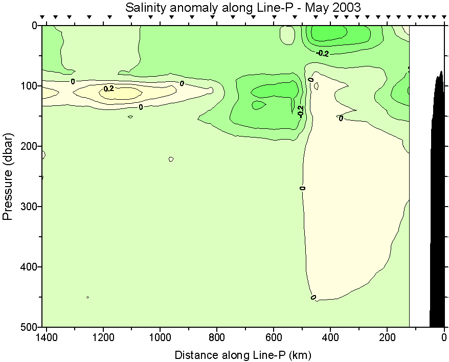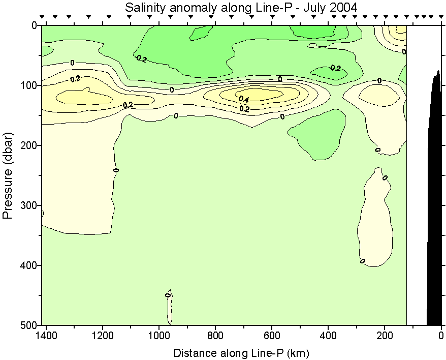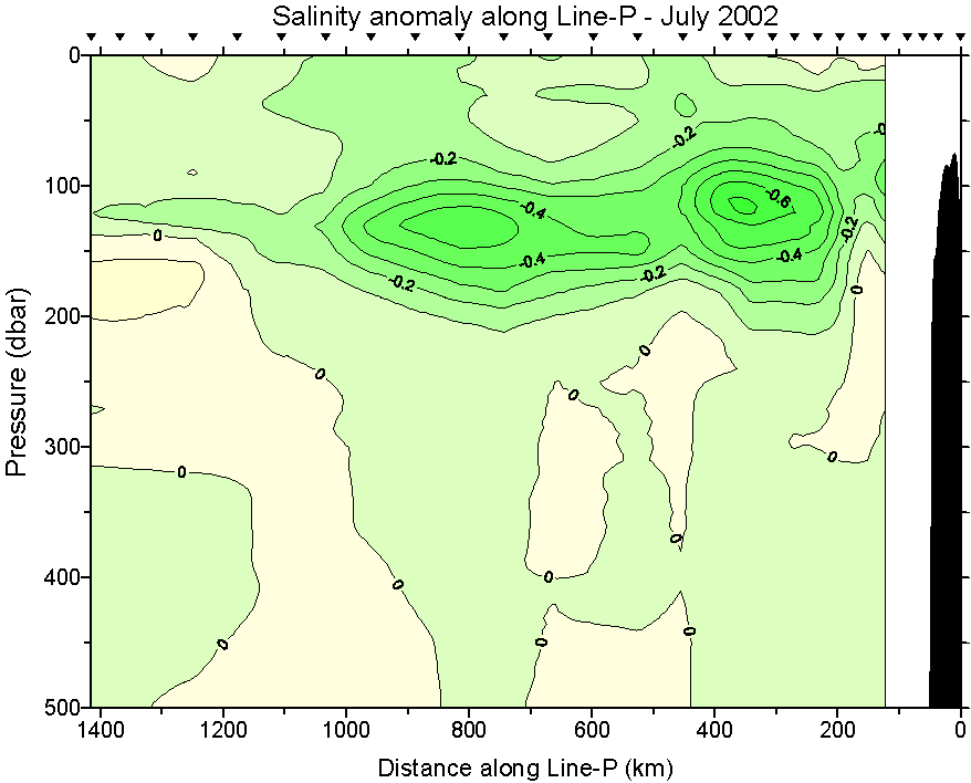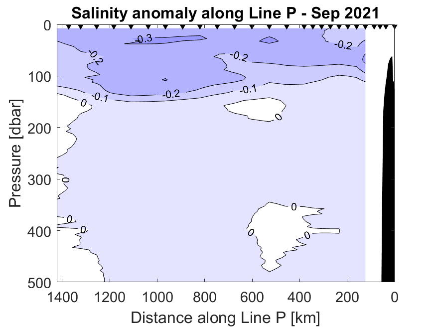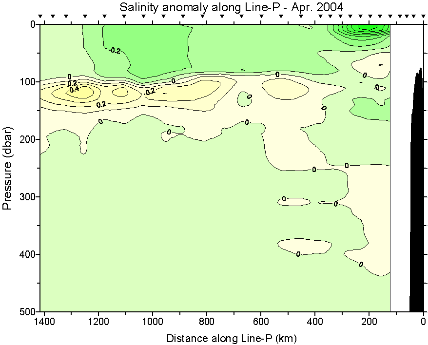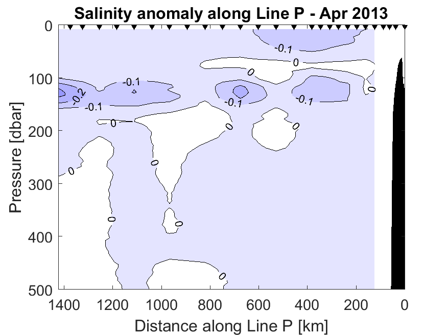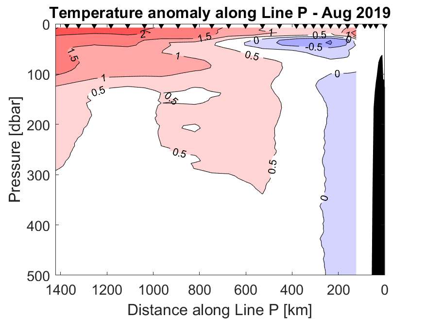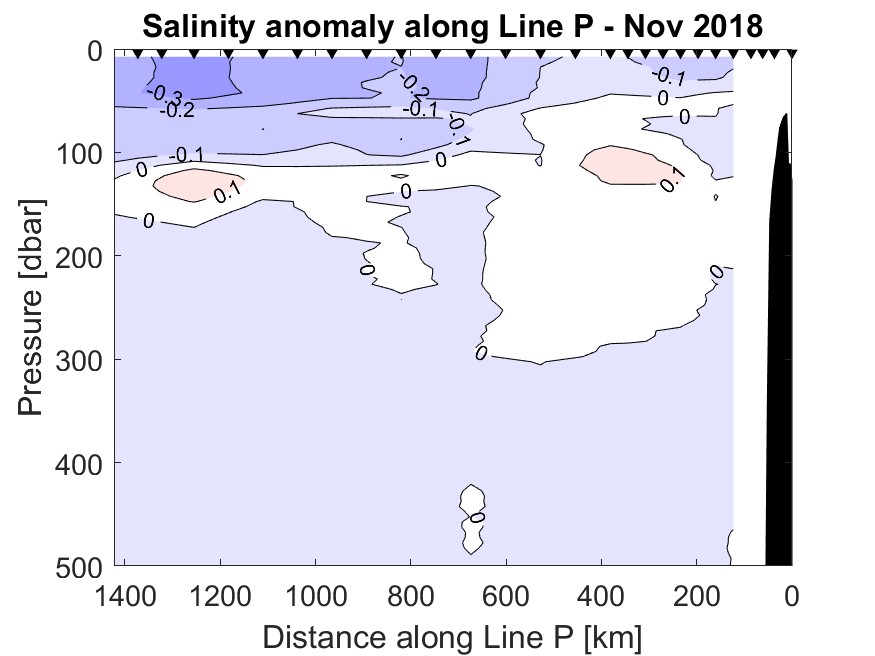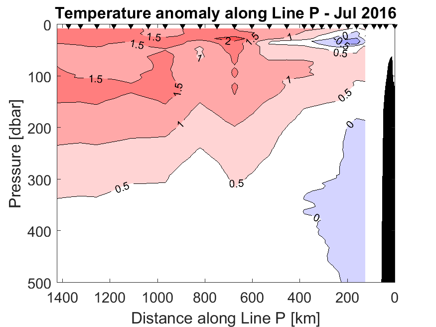Pour le mois et l'année en cours, les sections sont calculées en utilisant les données disponibles à ce jour. Ces sections sont susceptibles d'être modifiées. Les versions définitives seront publiées lorsque toutes les données seront disponibles. Les anomalies sont calculées par rapport à la climatologie de la ligne P.