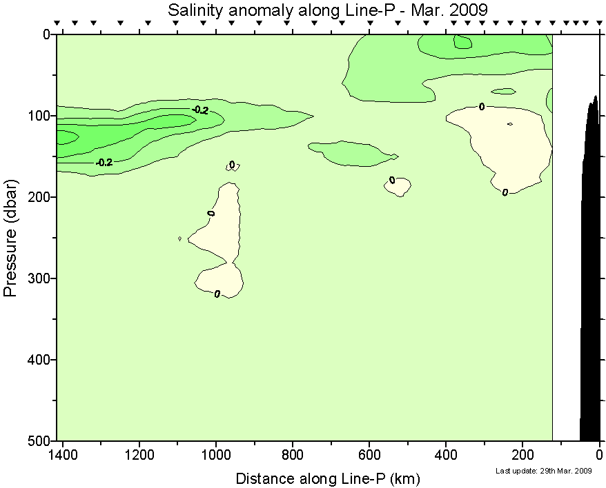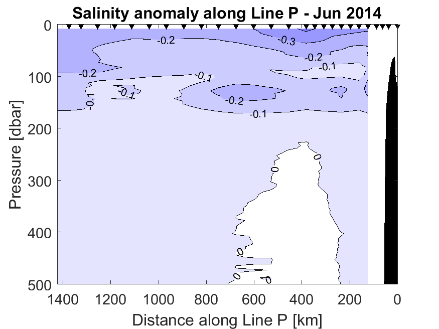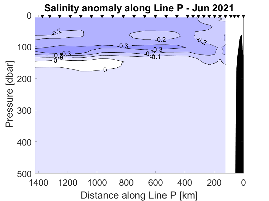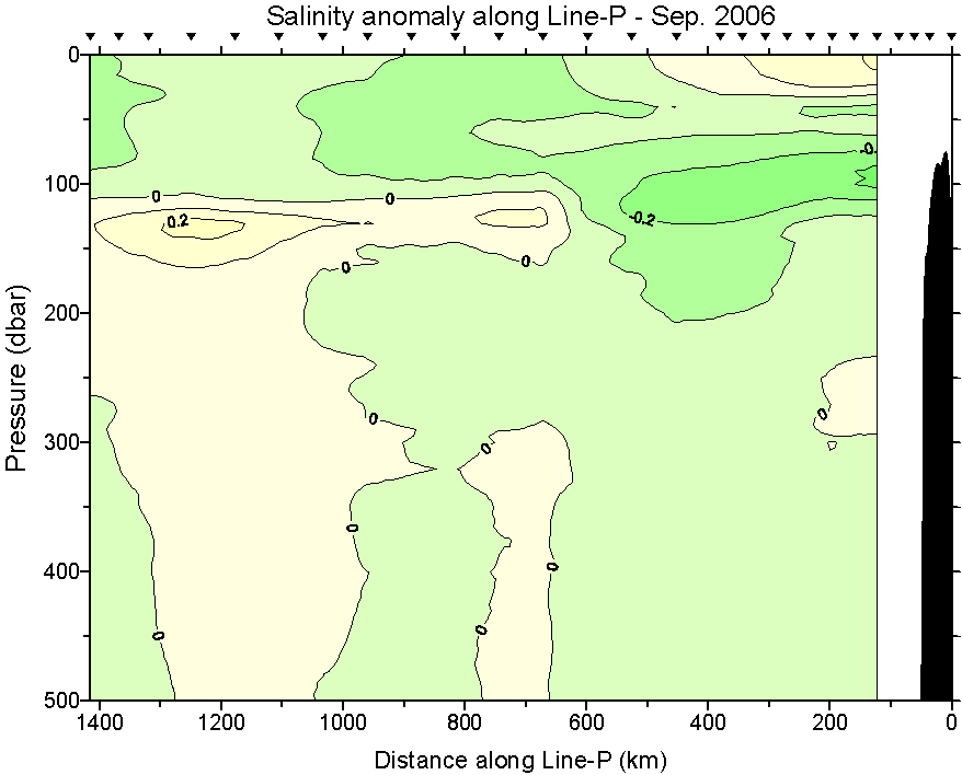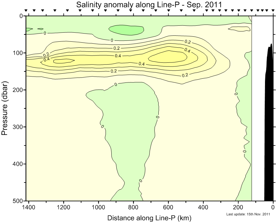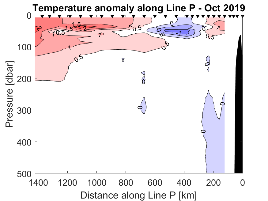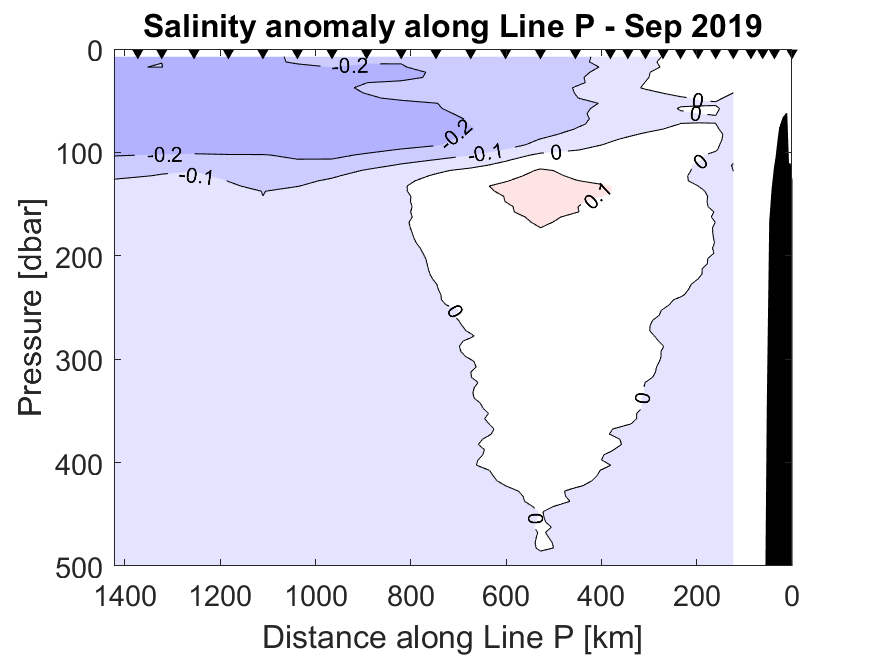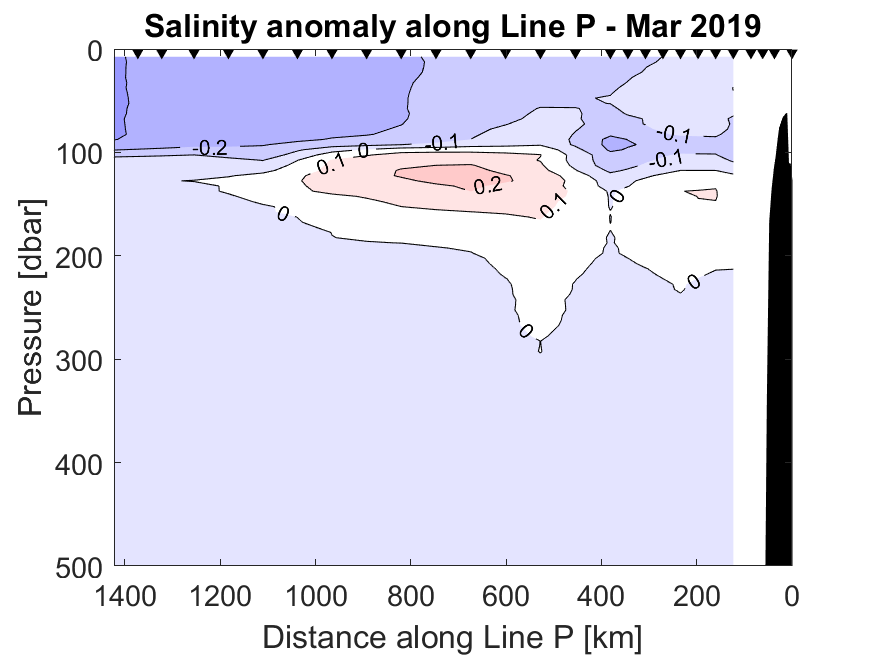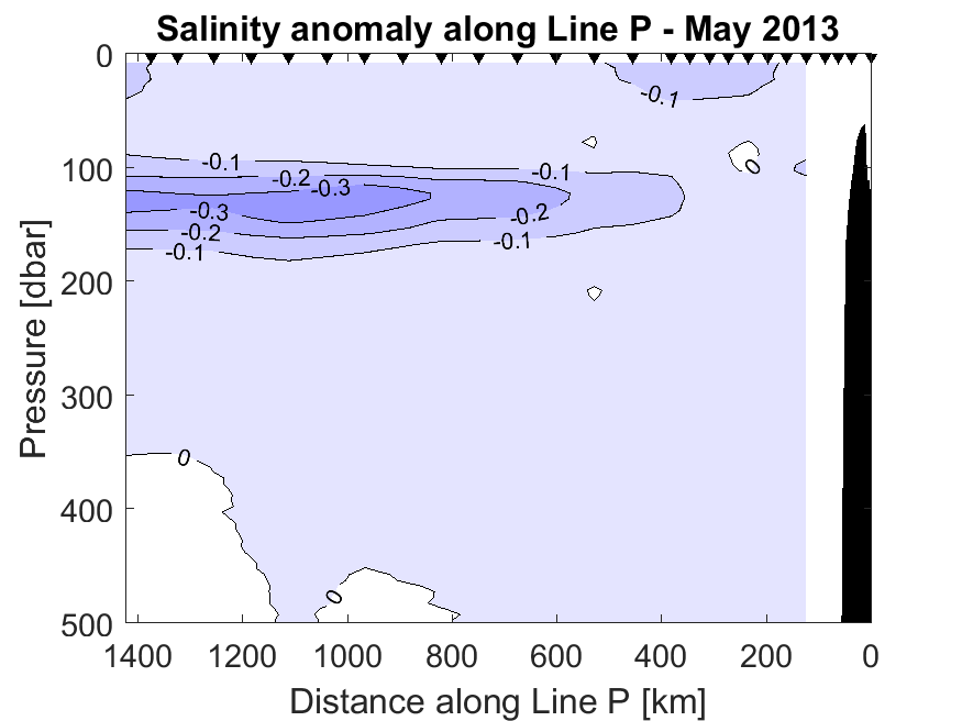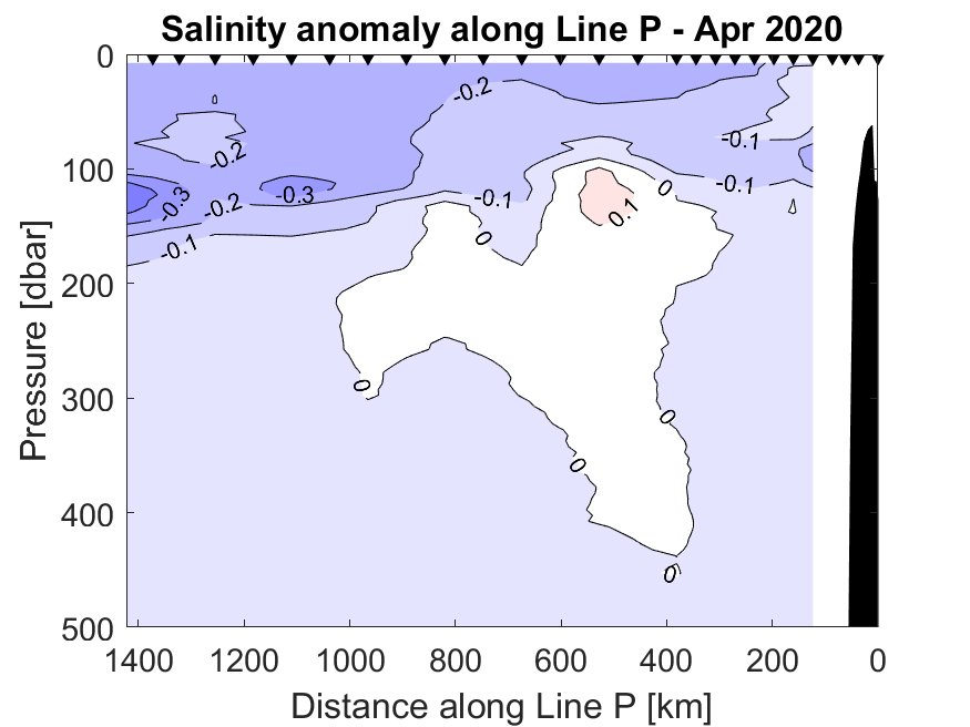 Pour le mois et l'année en cours, les sections sont calculées en utilisant les données disponibles à ce jour. Ces sections sont susceptibles d'être modifiées. Les versions définitives seront publiées lorsque toutes les données seront disponibles. Les anomalies sont calculées par rapport à la climatologie de la ligne P.