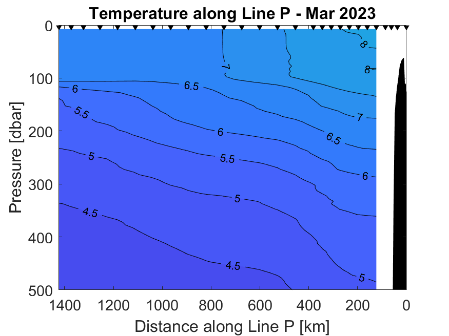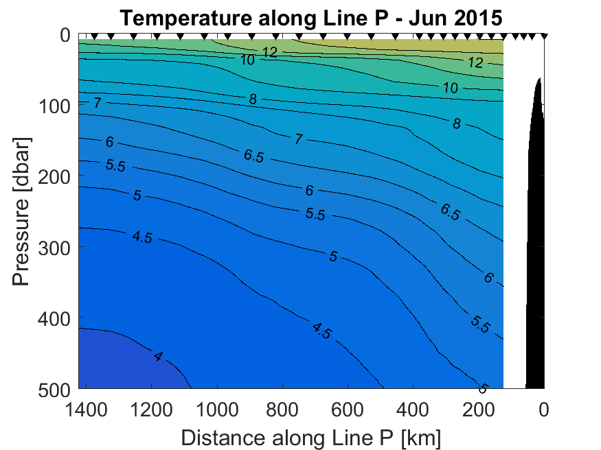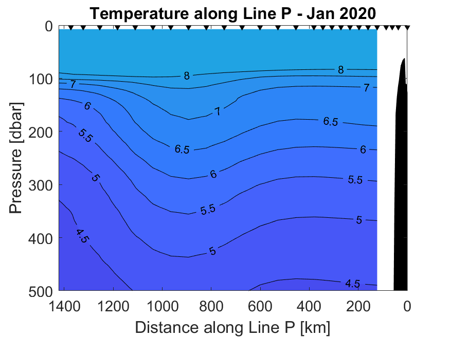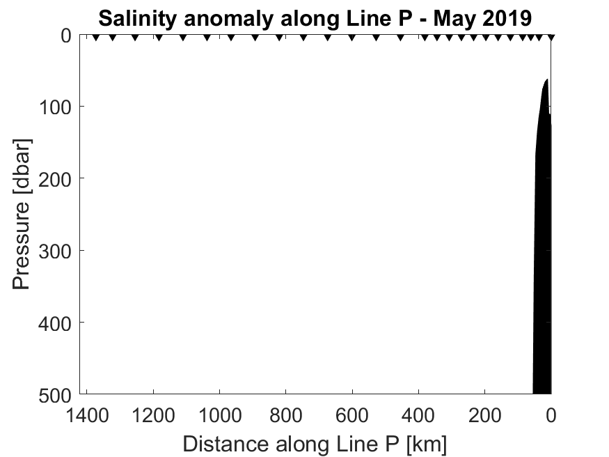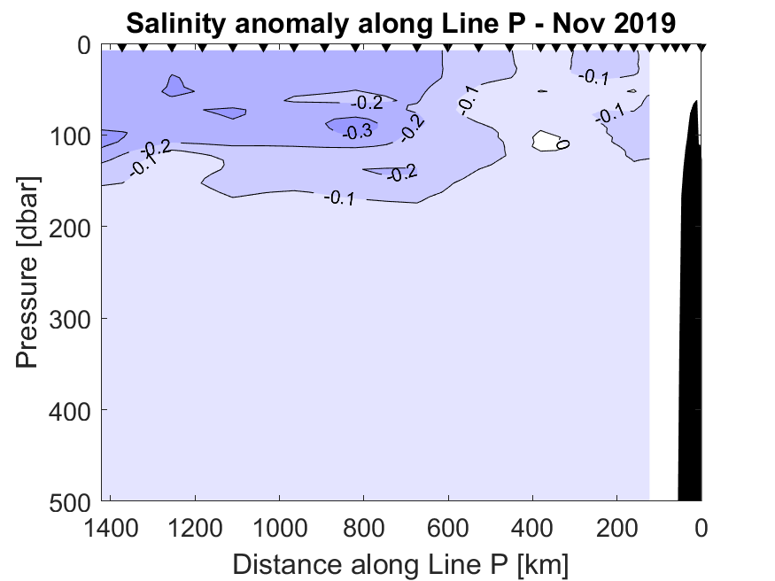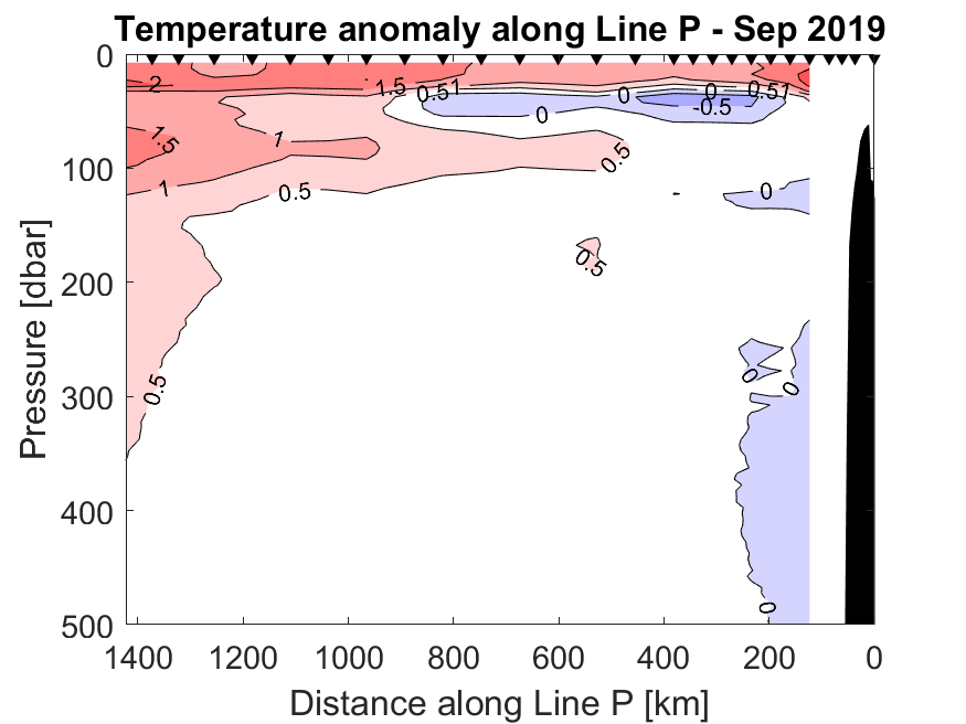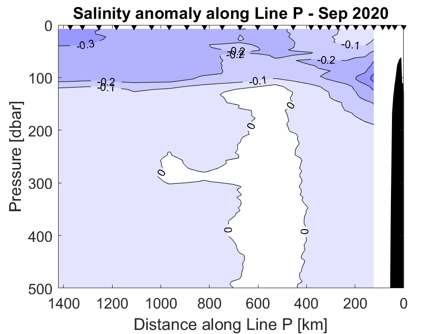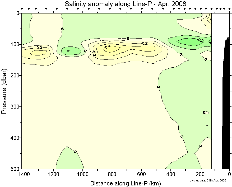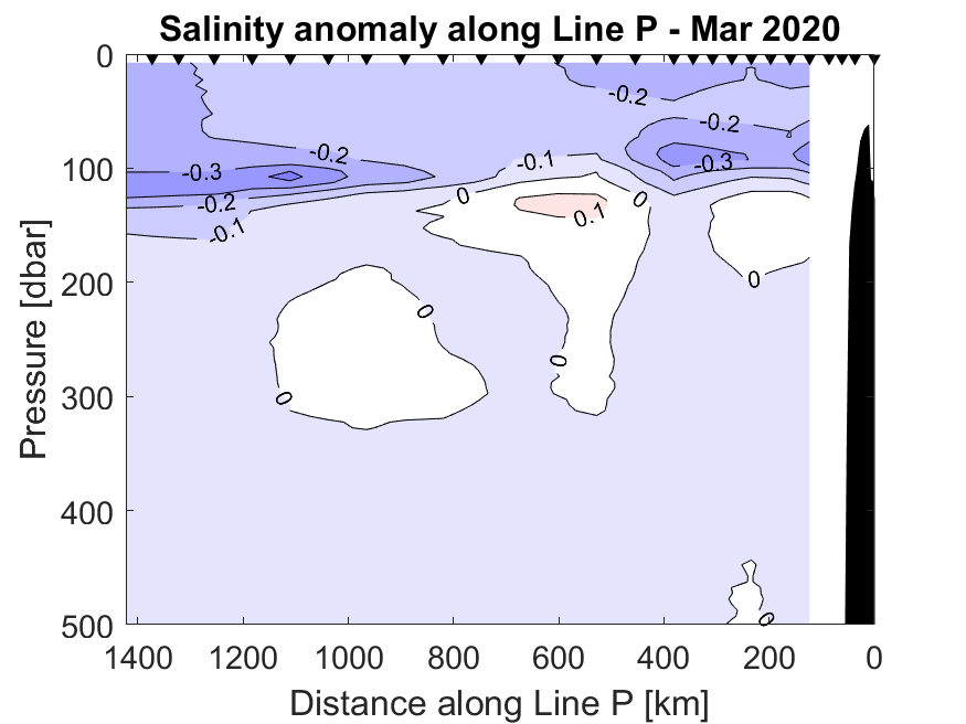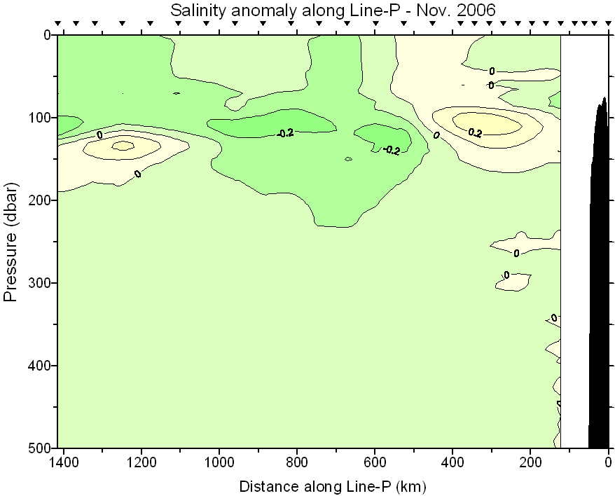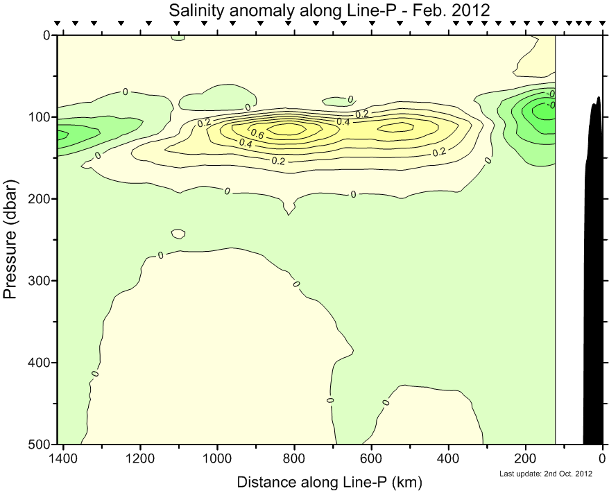 Pour le mois et l'année en cours, les sections sont calculées en utilisant les données disponibles à ce jour. Ces sections sont susceptibles d'être modifiées. Les versions définitives seront publiées lorsque toutes les données seront disponibles. Les anomalies sont calculées par rapport à la climatologie de la ligne P.